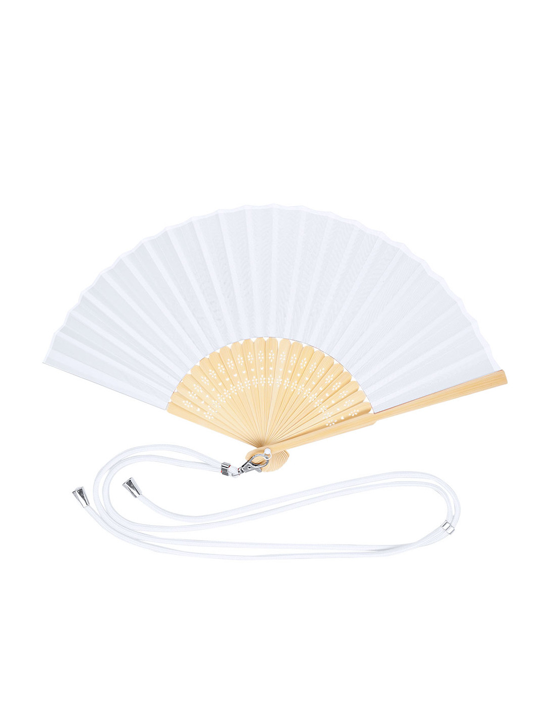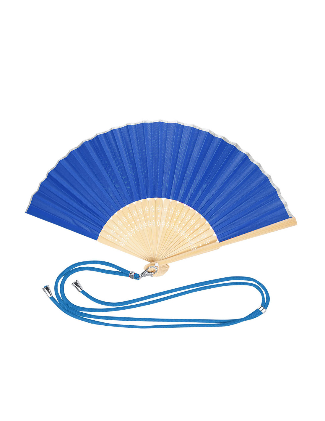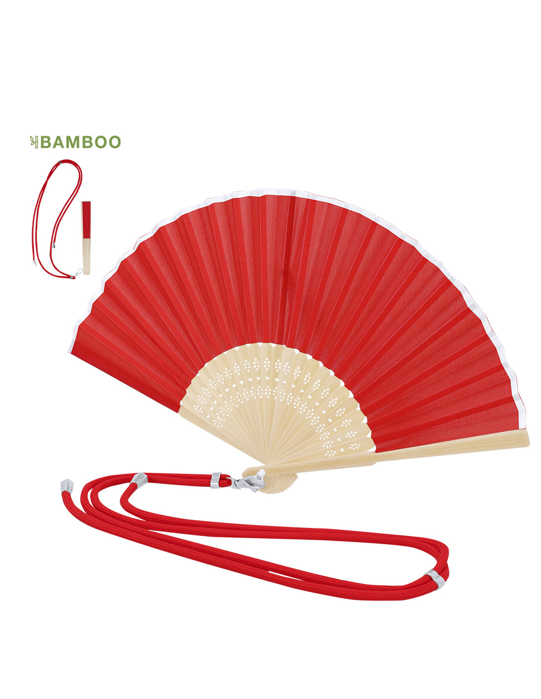 Abanico confeccionado con tela de resistente poliéster 190T y varillas de flexible bambú. Incluye un cordón ajustable a juego con la tela y un práctico mosquetón metálico para fácil transporte.