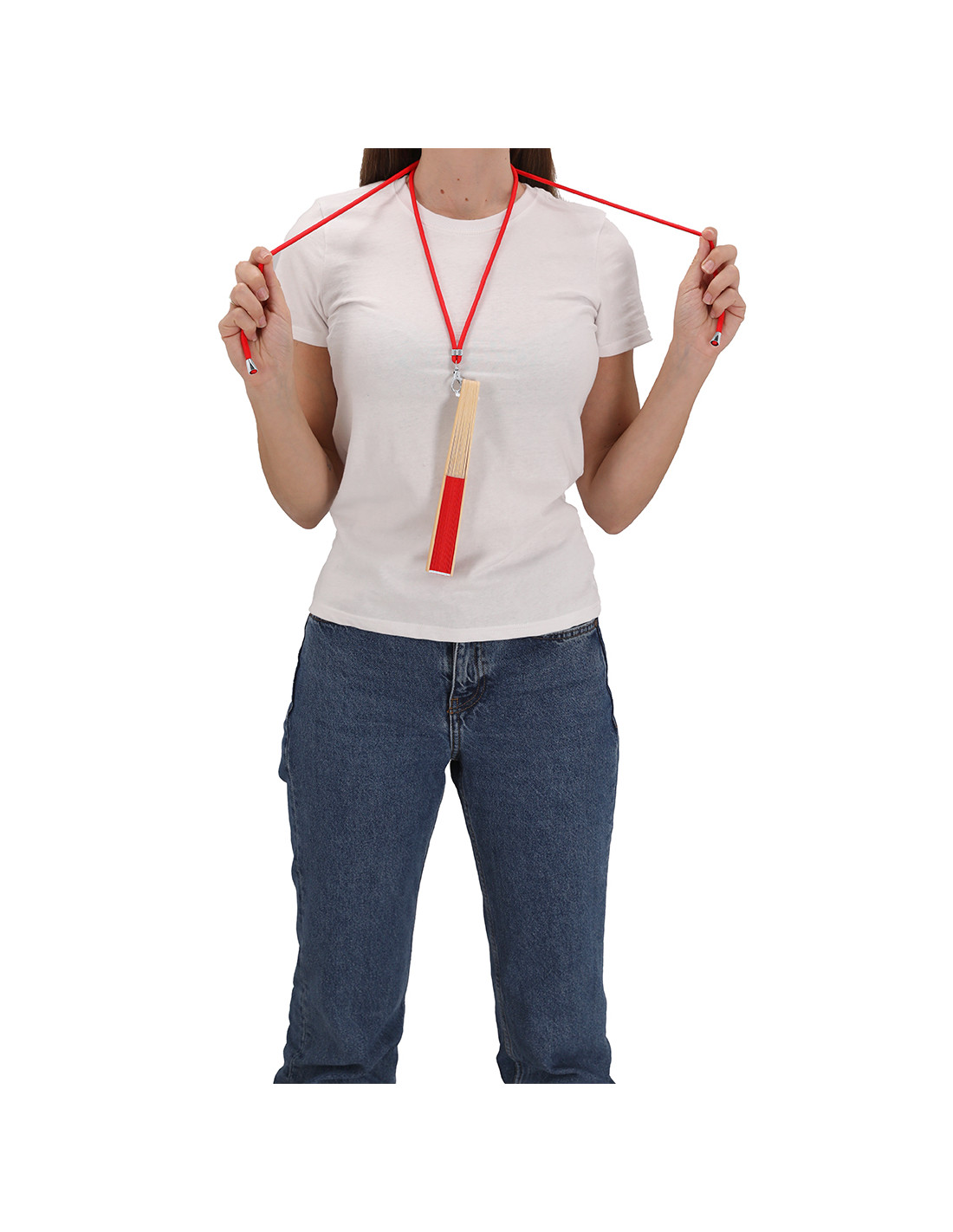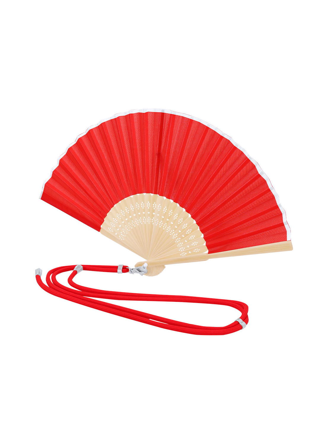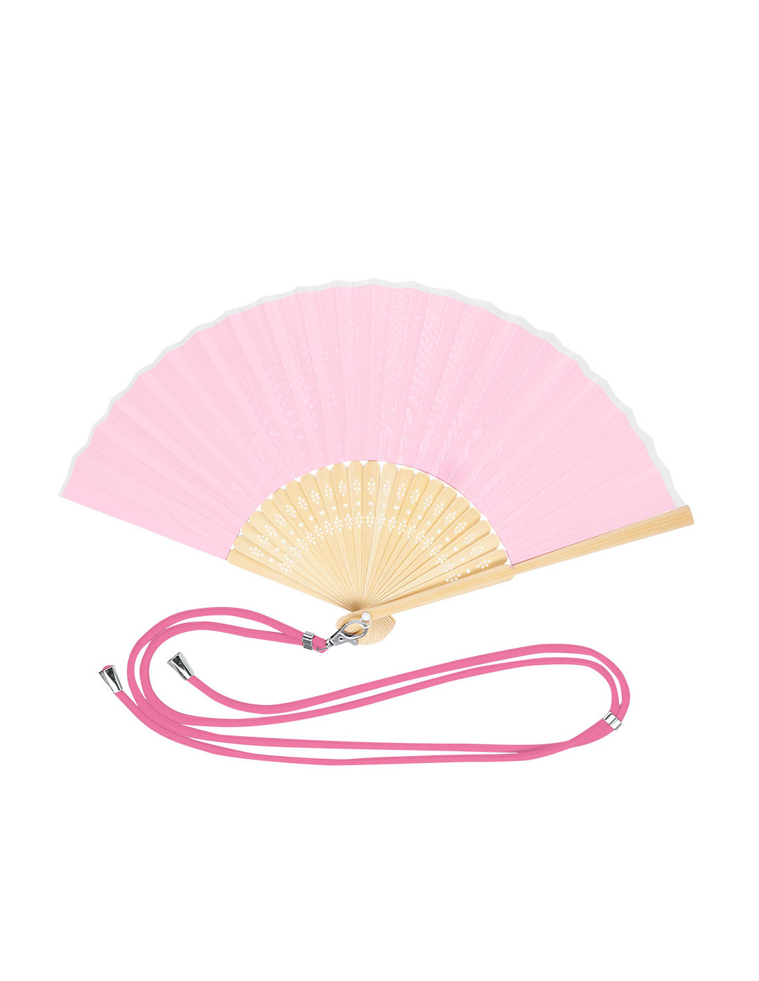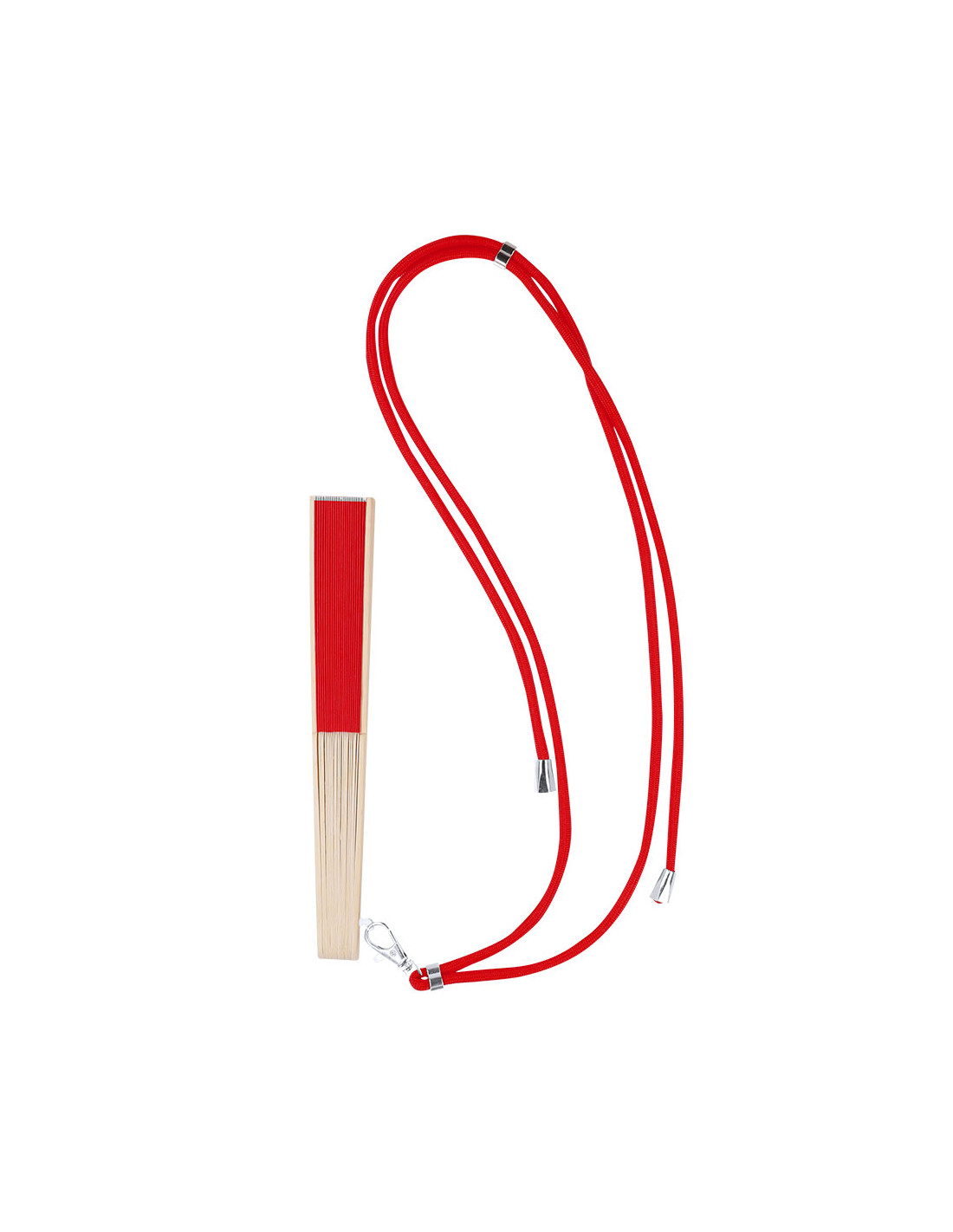 Abanico confeccionado con tela de resistente poliéster 190T y varillas de flexible bambú. Incluye un cordón ajustable a juego con la tela y un práctico mosquetón metálico para fácil transporte.