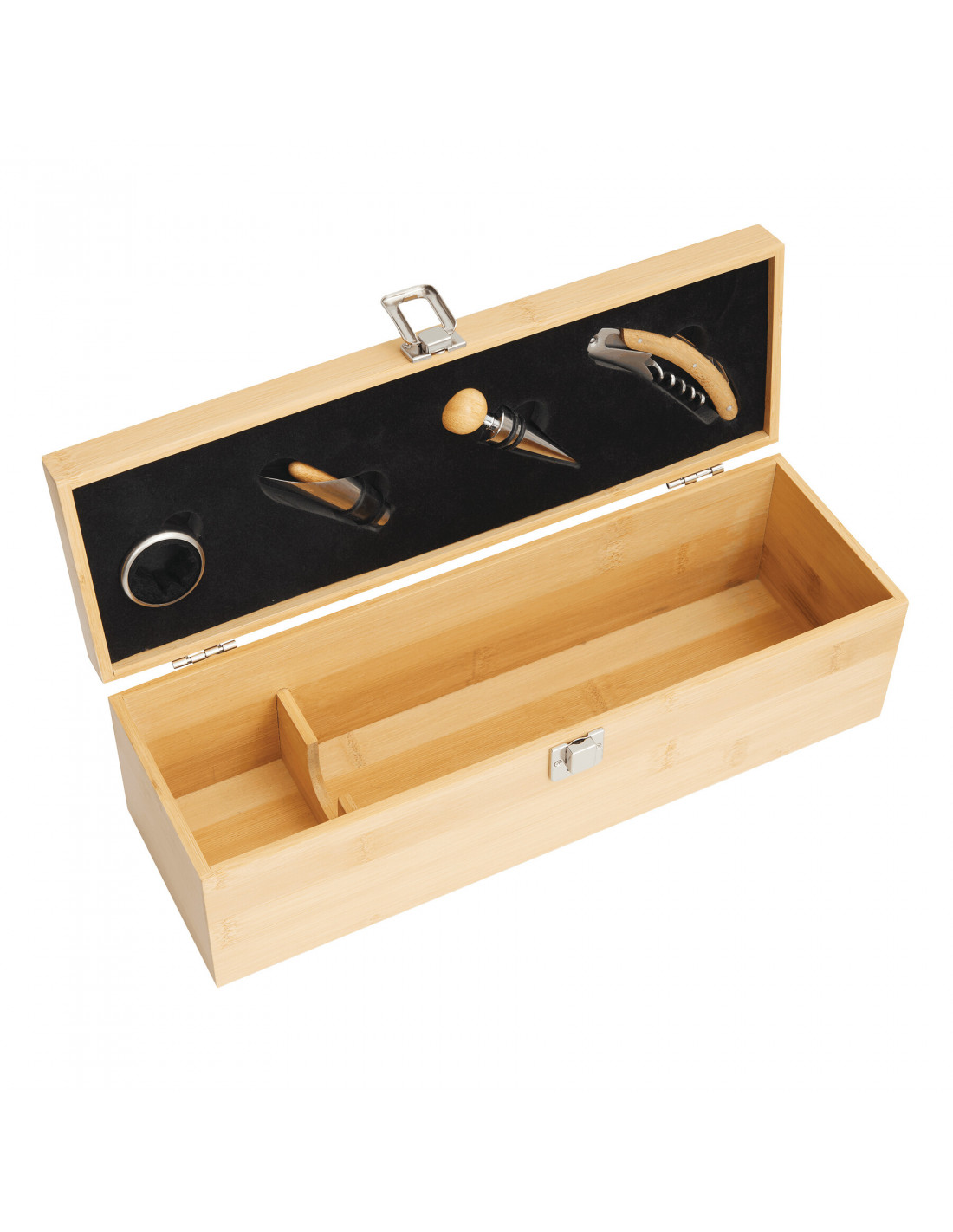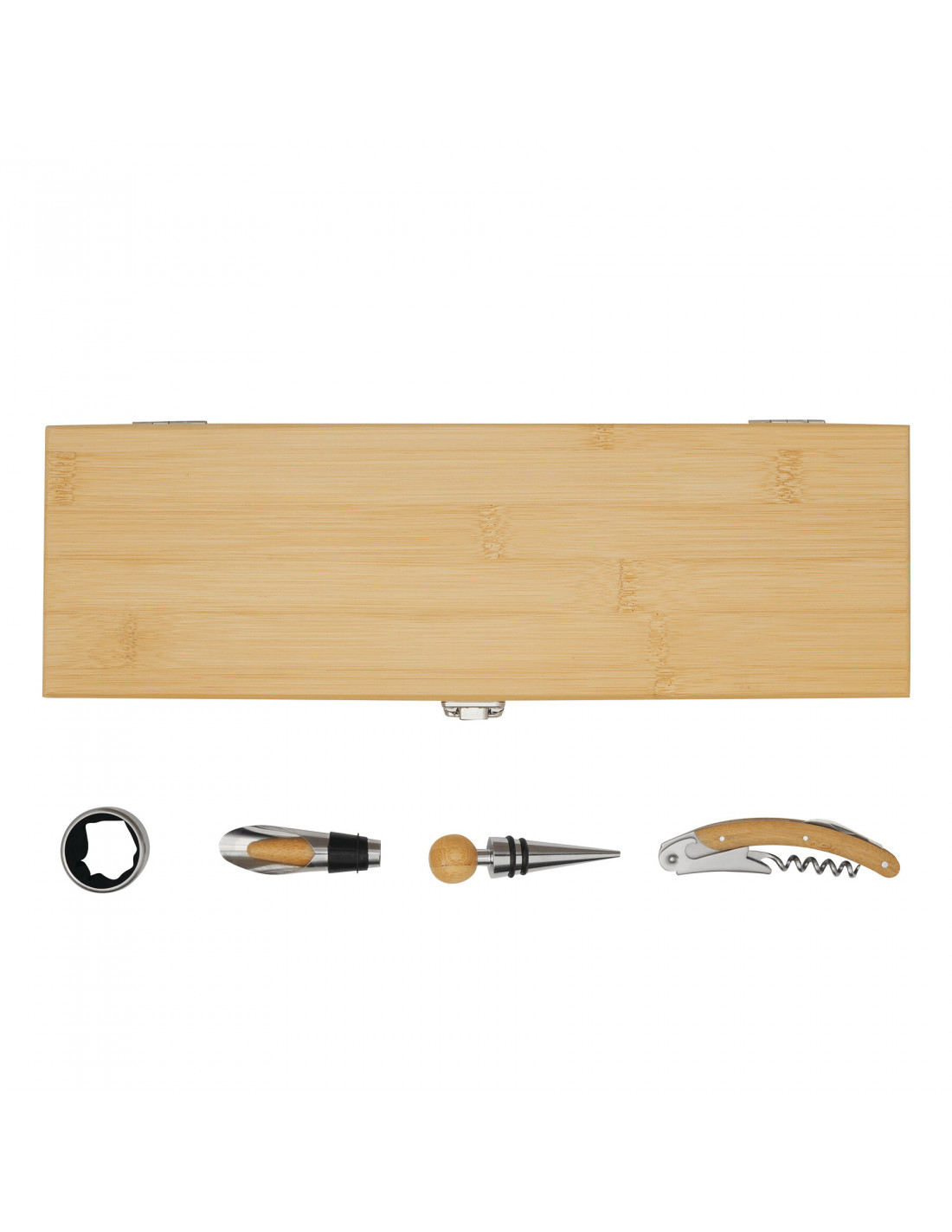 Set de vino PRECIOUS PLUS de 5 piezas en estuche de bambú. Incluye accesorios de acero inoxidable y madera. Ideal como regalo premium.