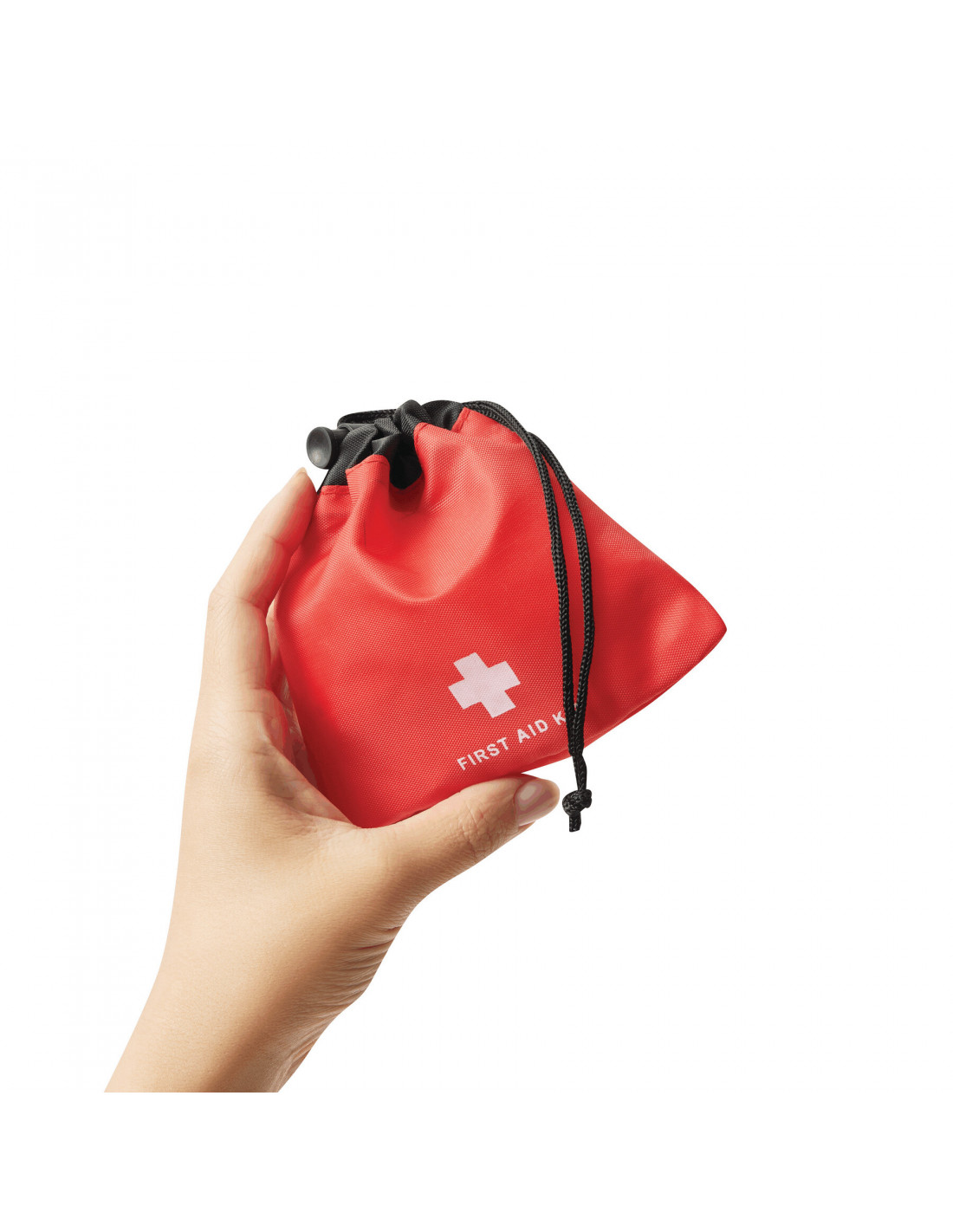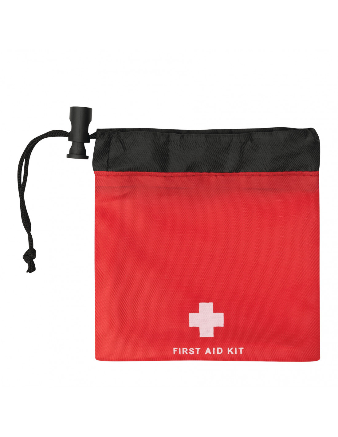 Botiquín de primeros auxilios CARRYGUARD, 13 piezas: consta de 7 tiritas adhesivas, 4 apósitos con alcohol, 1 toallita limpiadora, en una bolsa de poliéster con cordón y tope de plástico.