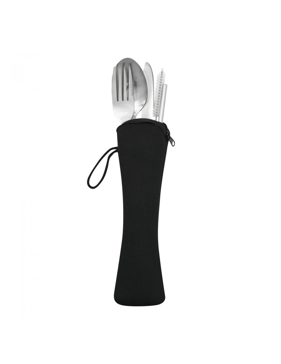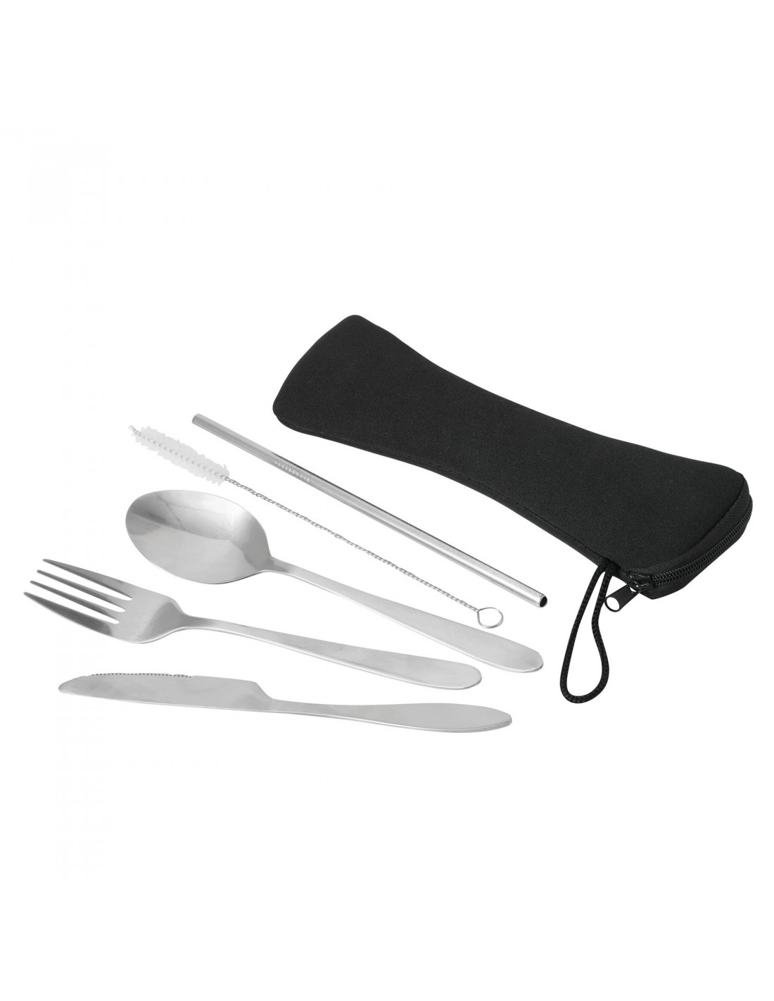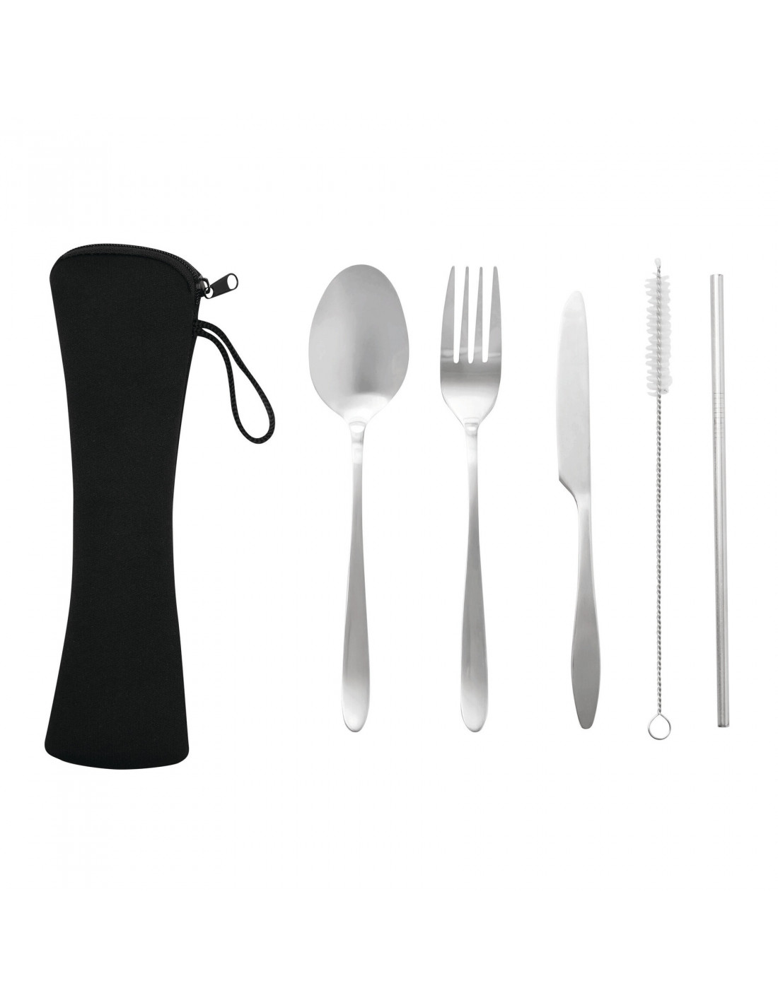 Set de cubiertos de acero inoxidable STELLOKIT, 5 piezas: incluye cuchillo, tenedor, cuchara, pajita y cepillo para limpiar la pajita, todo ello en una pequeña bolsa de neopreno con cremallera y asa de transporte.