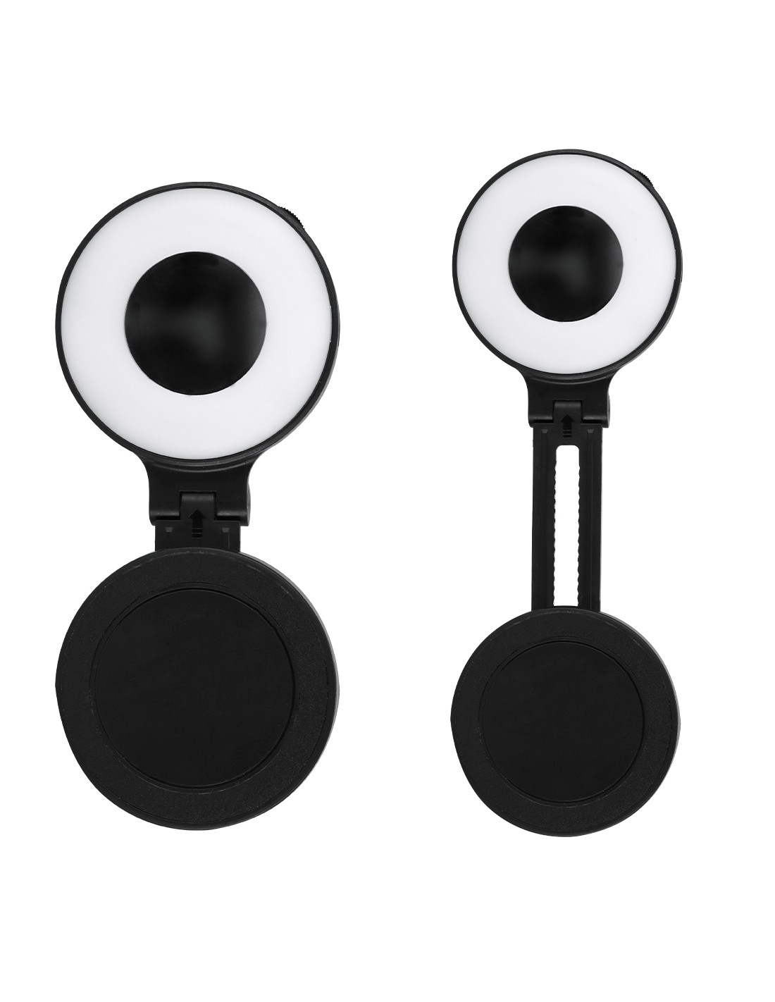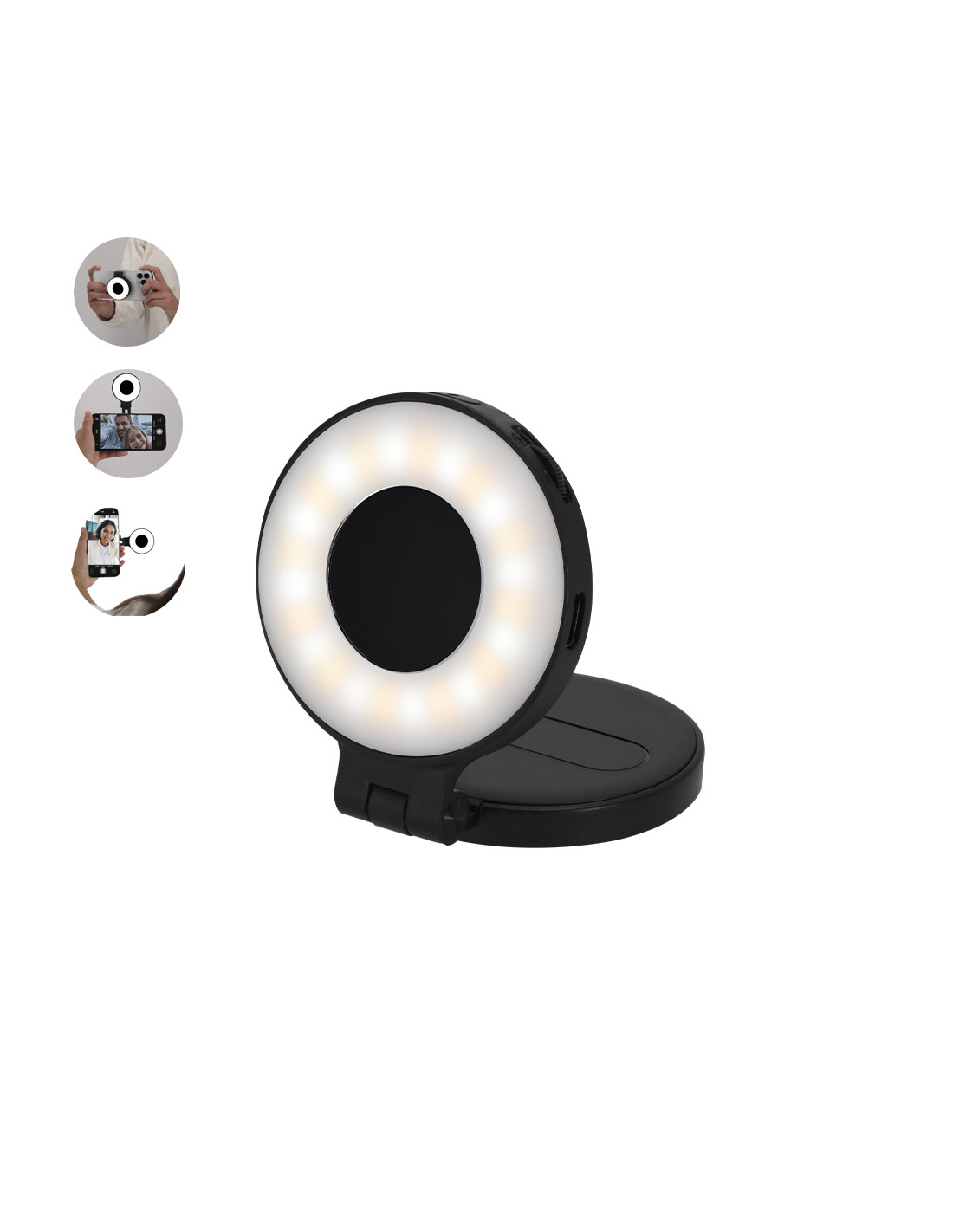 Anillo de luz led con acople para smartphone magnético, fabricado en resistente ABS. 24 ledes, con 3 modos de luz e intensidad regulable y recargable por USB (cable Tipo C) de batería 450 mAh. Con soporte extensible, ideal para ponerlo en diferentes posiciones en tu smartphone u ordenador