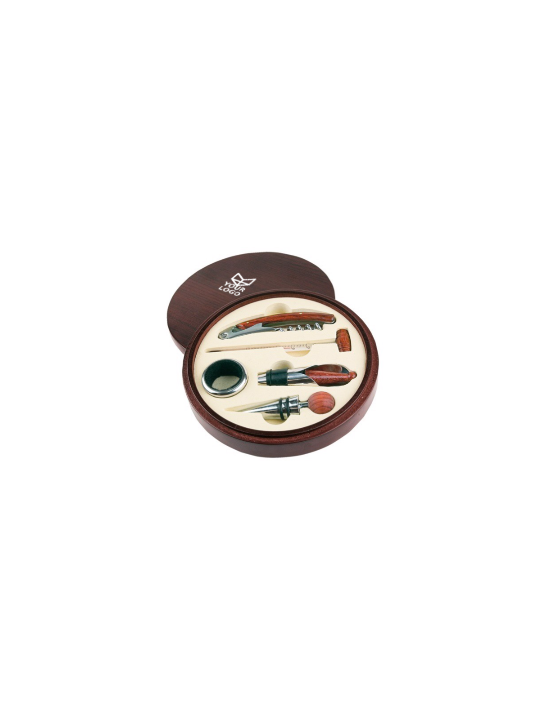 Set de vinos de elegante diseño circular con acabado en madera natural. Accesorios de acero inox y madera. Incluye sacacorchos con cortacápsulas y abridor, tapón, dosificador, recogegotas y termómetro. Presentado en estuche individual con interior en suave espuma troquelada de color beige.