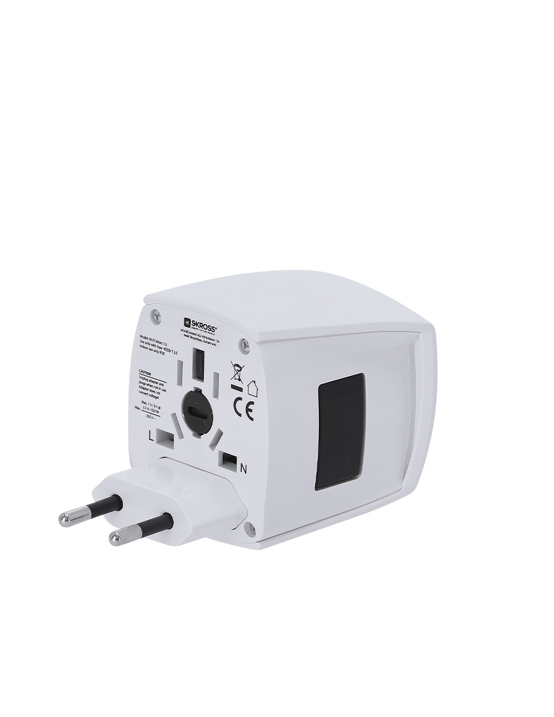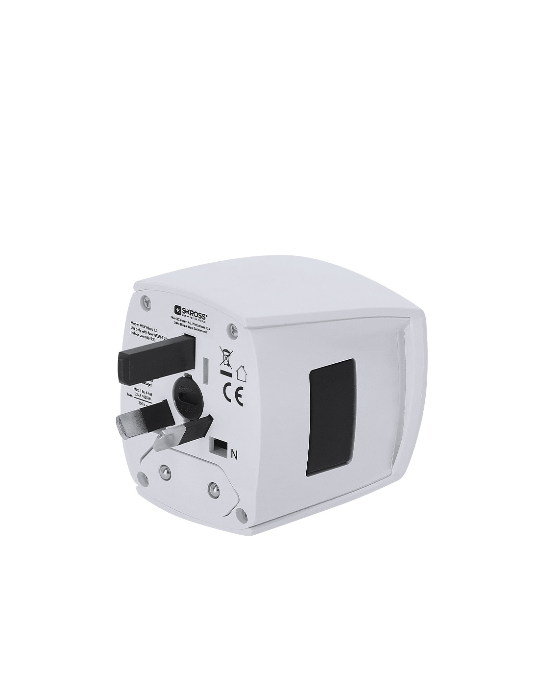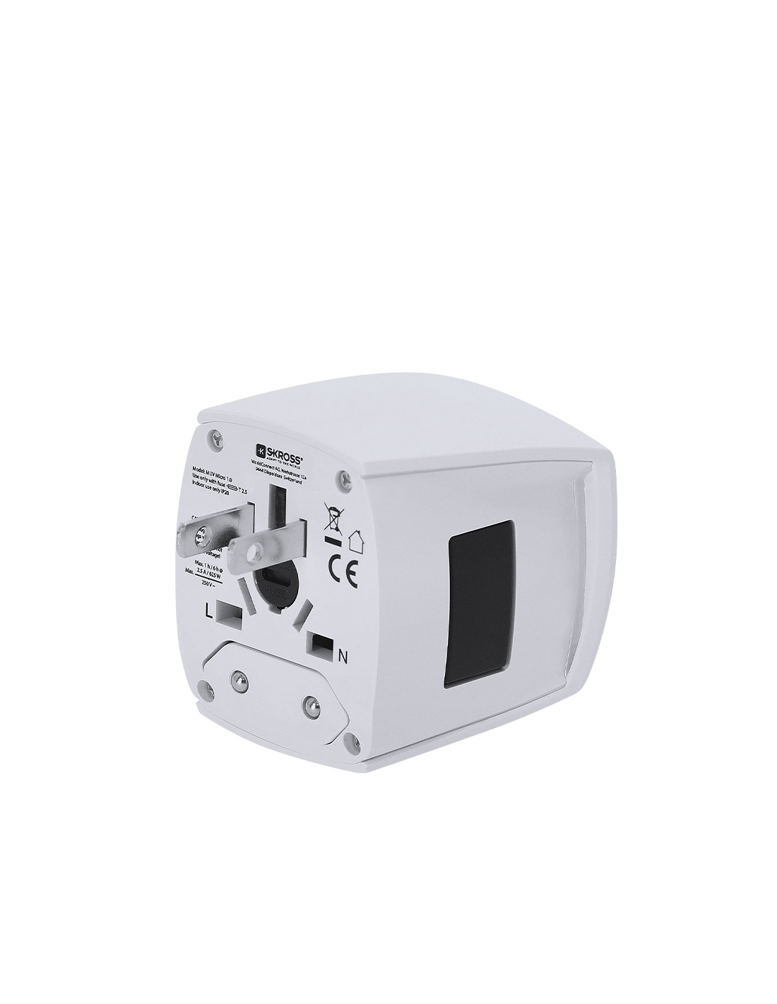 Completo adaptador de viaje universal marca SKROSS de diseño compacto y portable. Con múltiples salidas, especialmente indicado para viajes y con adaptadores multi región para Europa, USA, Japón, Australia y China.
