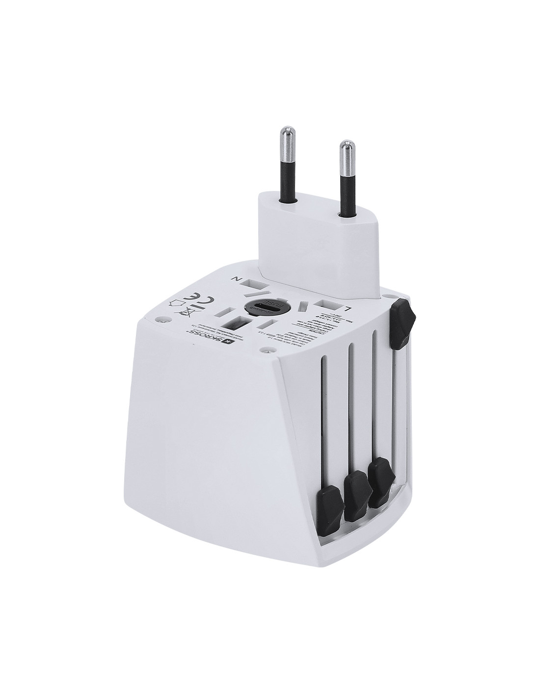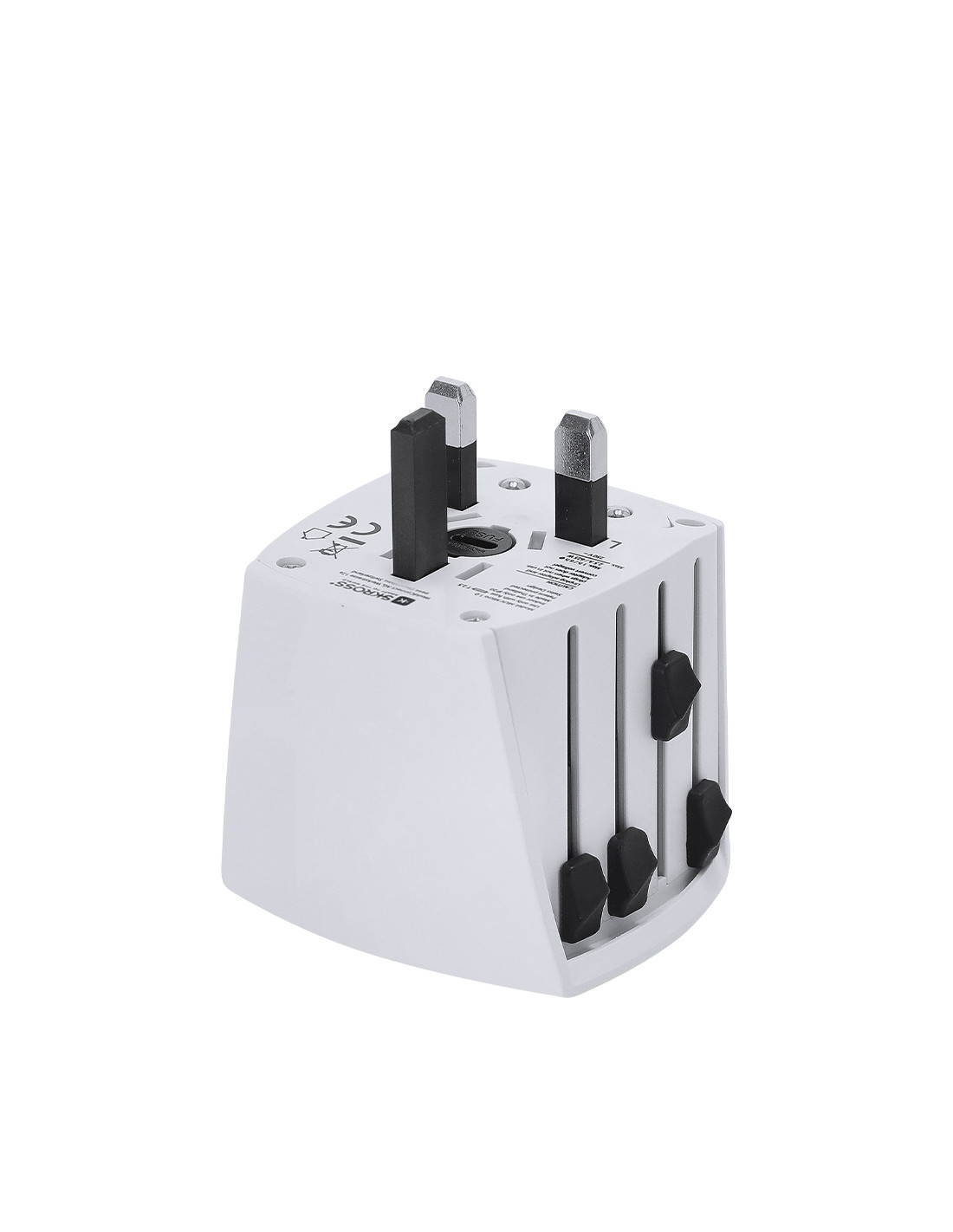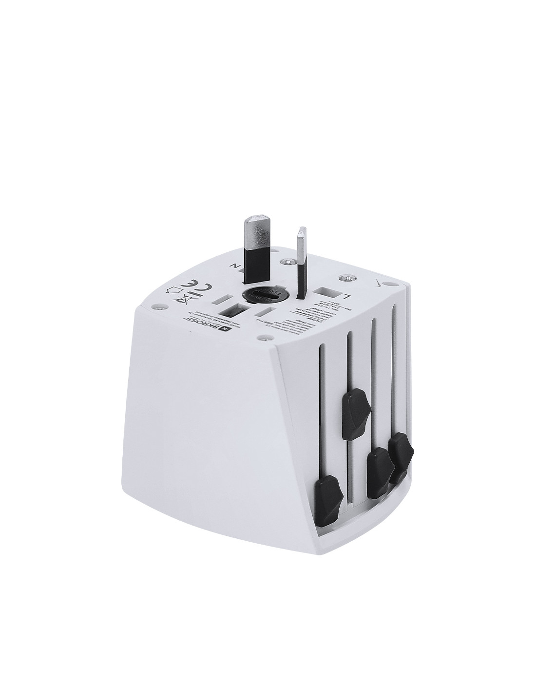 Completo adaptador de viaje universal marca SKROSS de diseño compacto y portable. Con múltiples salidas, especialmente indicado para viajes y con adaptadores multi región para Europa, USA, Japón, Australia y China.