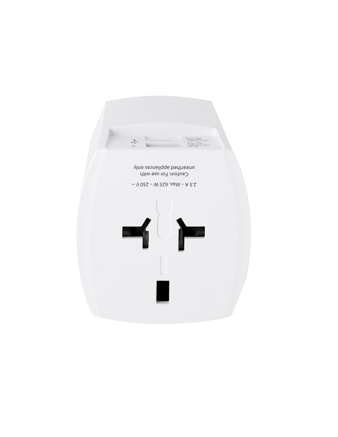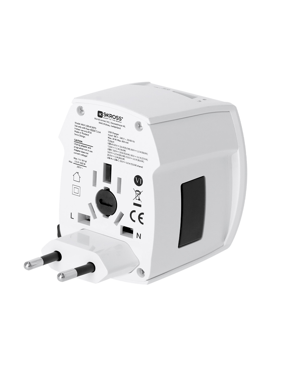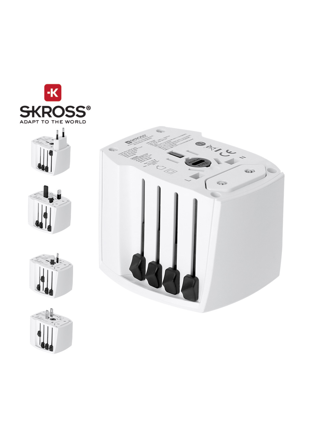 Completo adaptador de viaje universal marca SKROSS de diseño compacto y portable. Con salidas USB y Tipo C, especialmente indicado para viajes y con adaptadores multi región