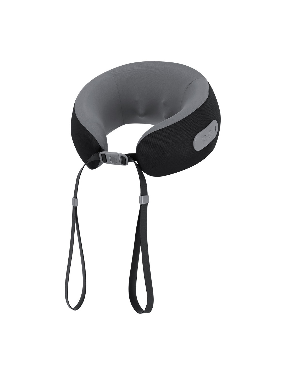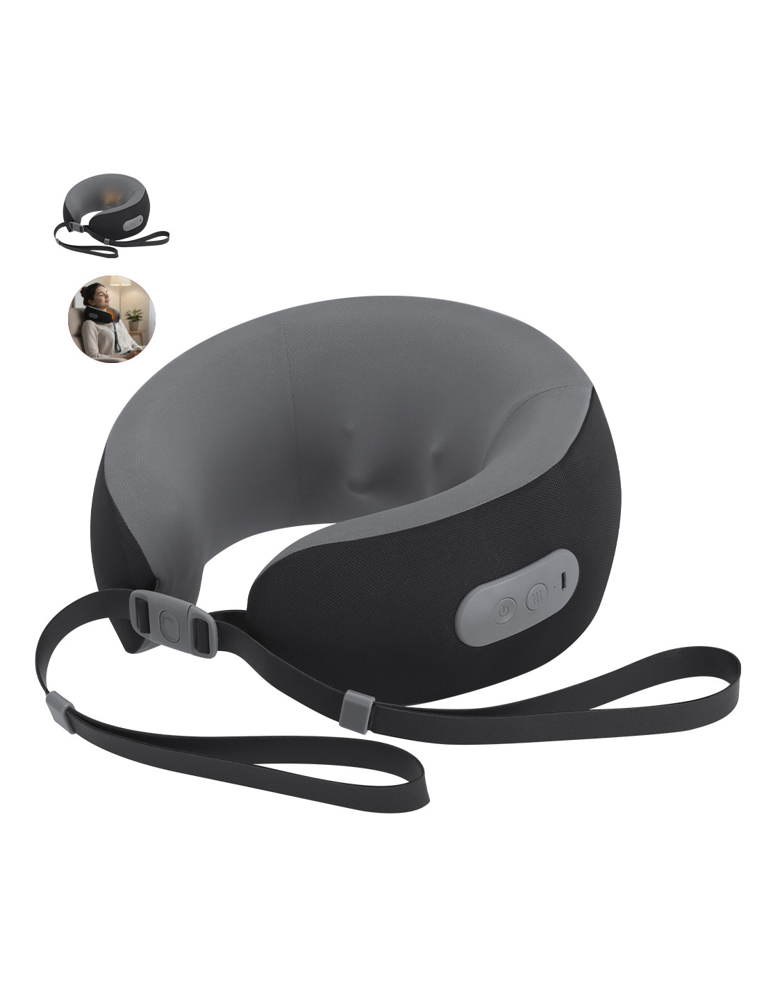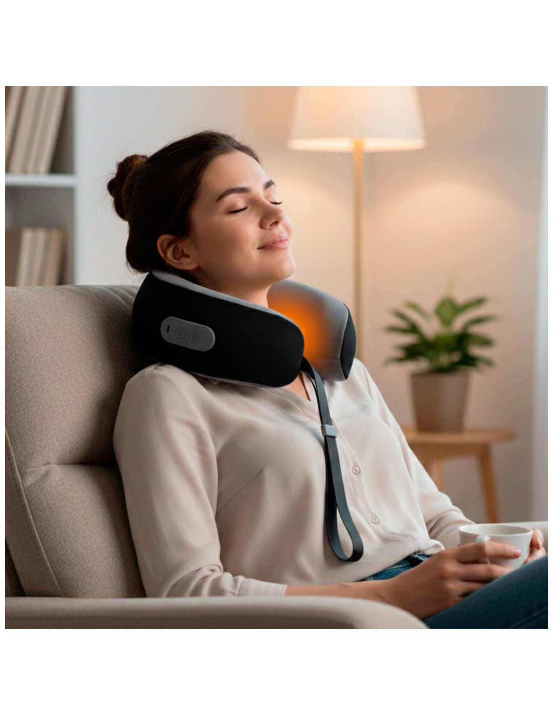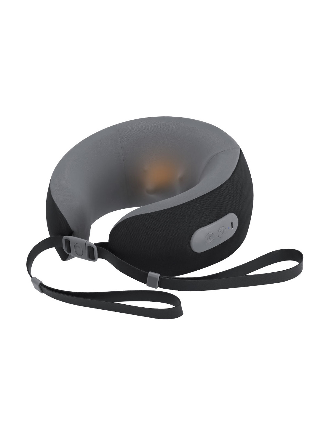Almohadilla masajeador portátil para cuello. Máxima experiencia de confort para cualquier viaje gracias a la función de masajes. Tiene cierres de hebilla para un correcto y cómodo ajuste. Incluye botón de ON/OFF/SWITCH con indicador de luz. Con funda confeccionada en poliéster para protegerla en el transporte. Equipada con batería recargable de 1.200 mAh, con entrada TipoC.