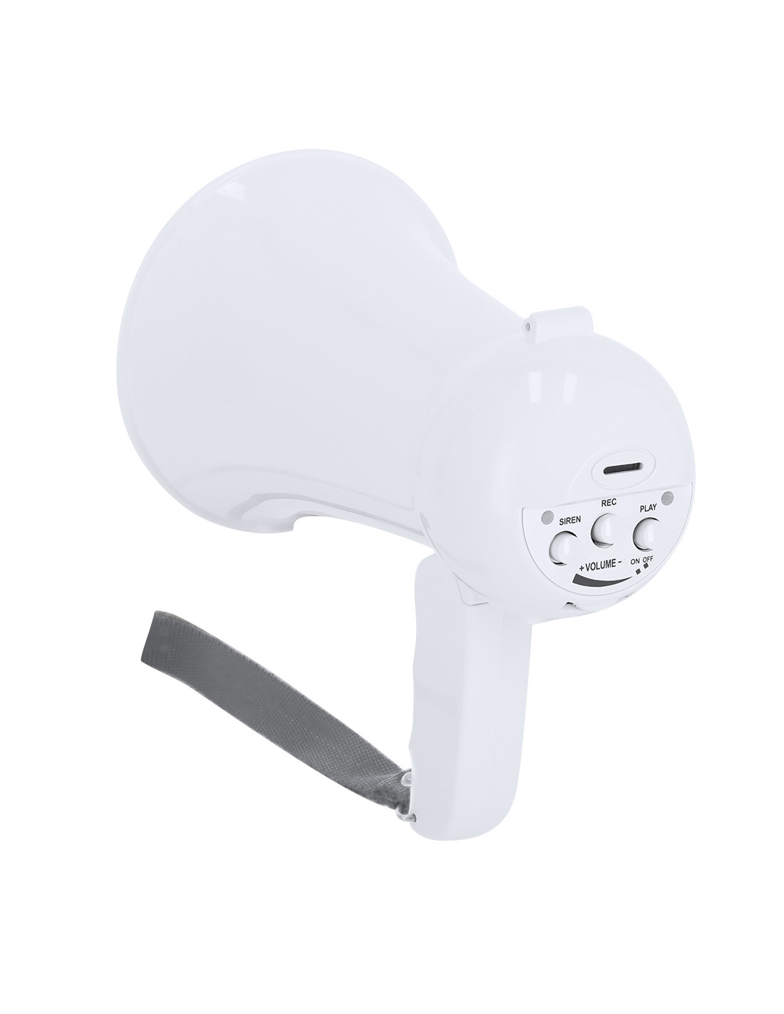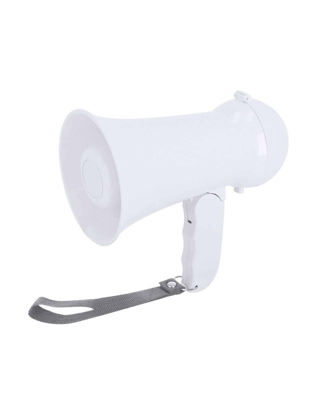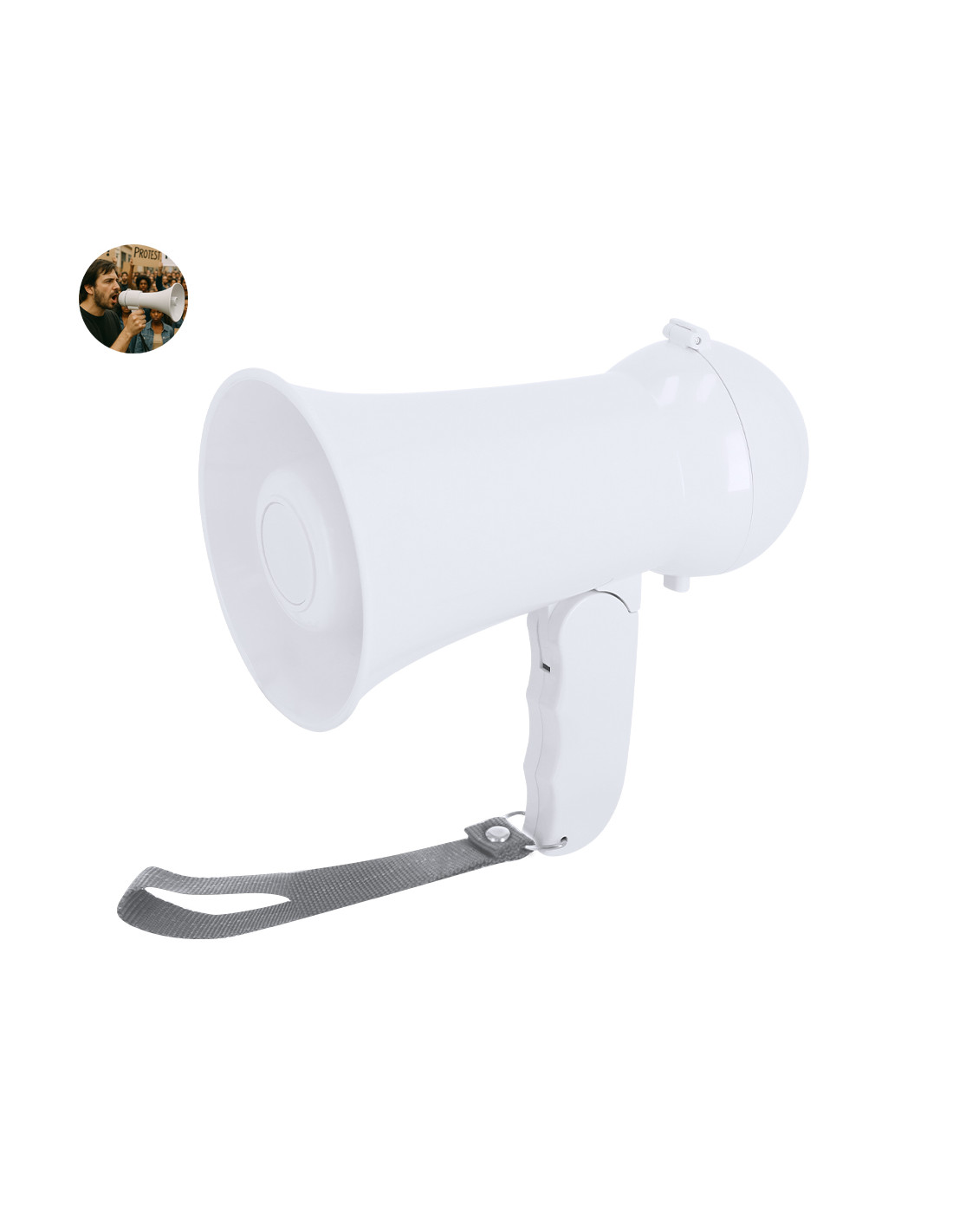 Megáfono plegable en ABS en color sólido con acabado brillante. Incluye botones de control en el extremo, sirena, grabadora, ON/OFF y control de volumen. Asa plegable con correa fija en color gris unida mediante anilla metálica. Funciona con 4 pilas AA (no incluidas).
