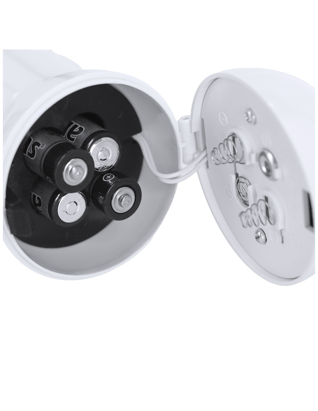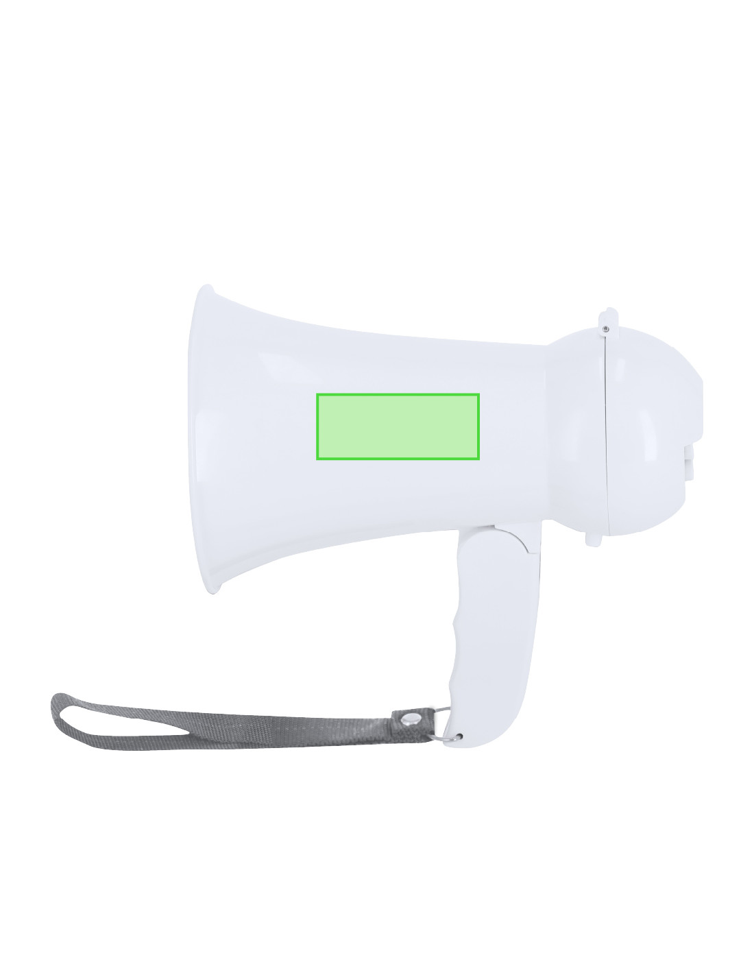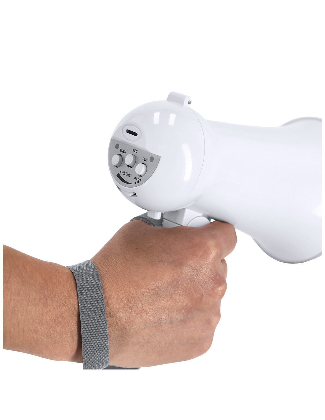 Megáfono plegable en ABS en color sólido con acabado brillante. Incluye botones de control en el extremo, sirena, grabadora, ON/OFF y control de volumen. Asa plegable con correa fija en color gris unida mediante anilla metálica. Funciona con 4 pilas AA (no incluidas).