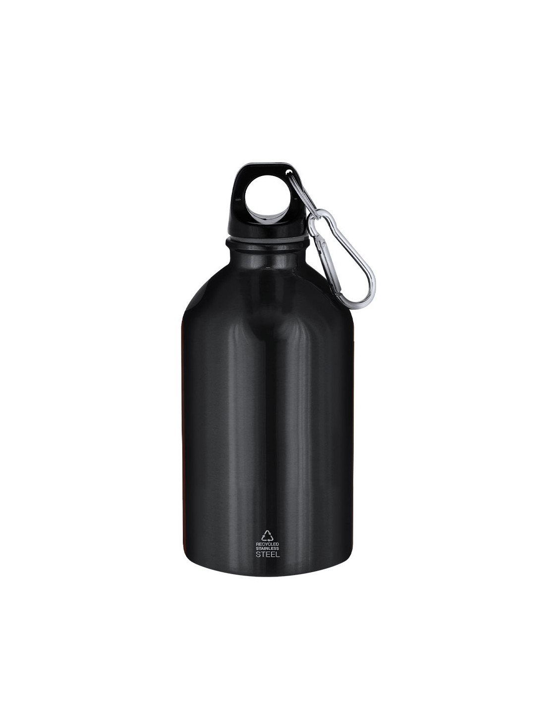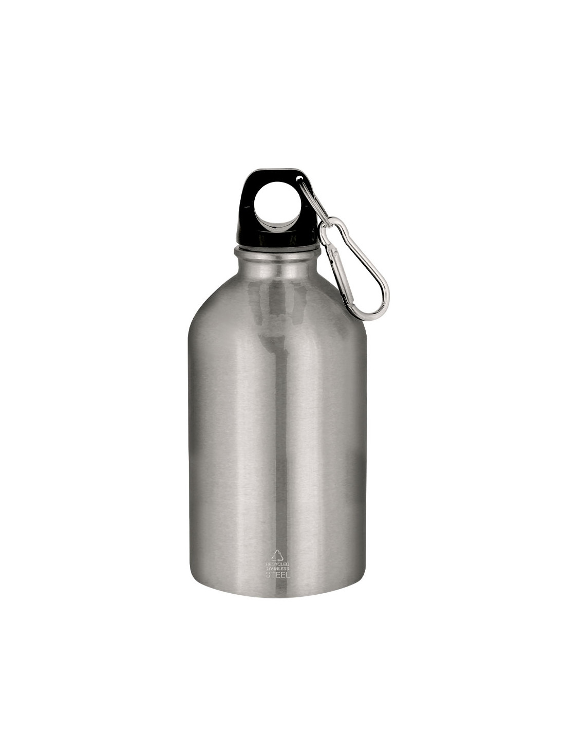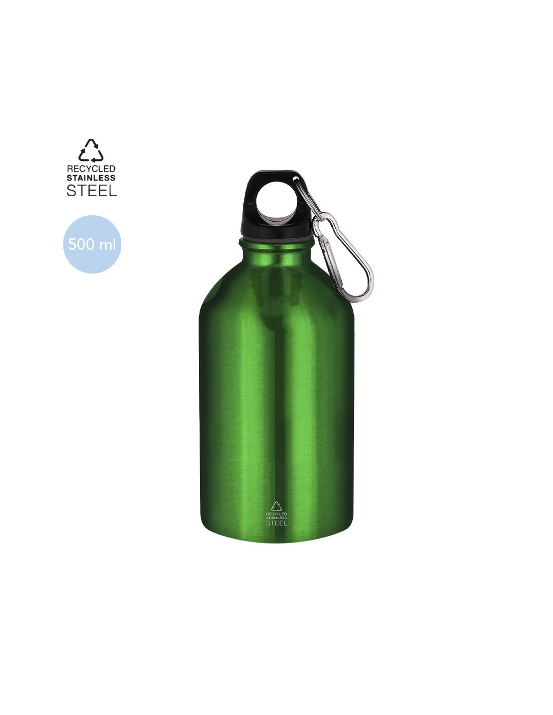 Bidón con 500 ml de capacidad. Fabricado en Acero Inoxidable Reciclado con acabado metalizado. Tapón negro de cierre a rosca para garantizar un sellado óptimo. Incluye mosquetón metálico que facilita su transporte. Con distintivo Acero Inoxidable Reciclado.