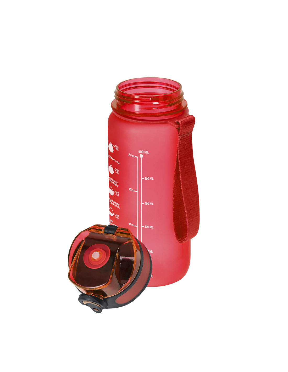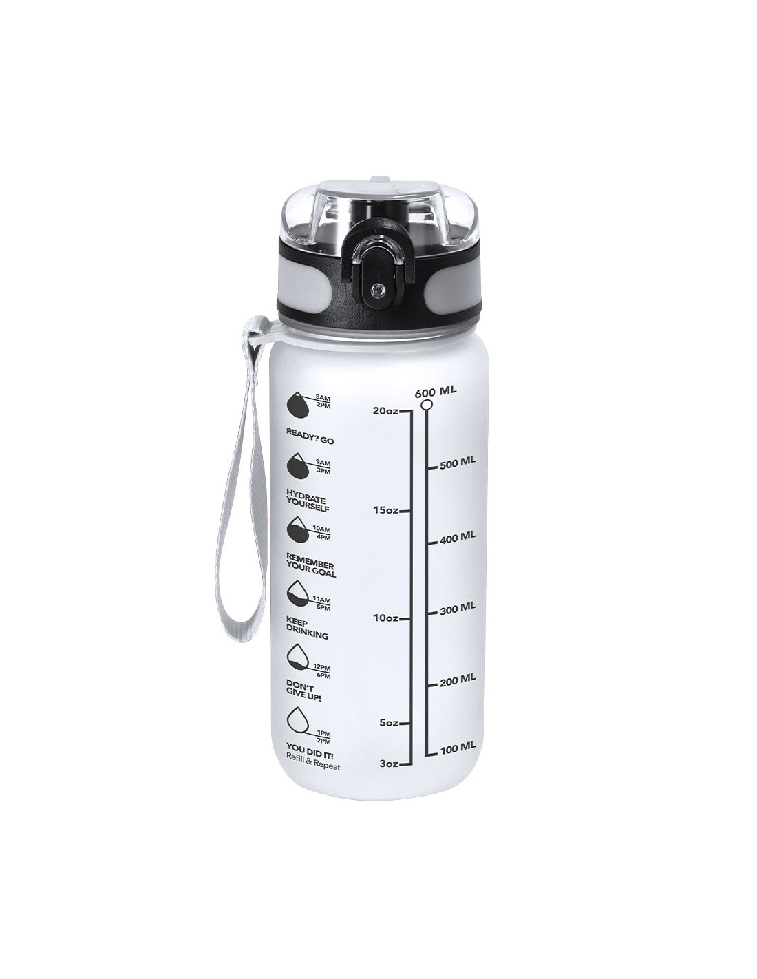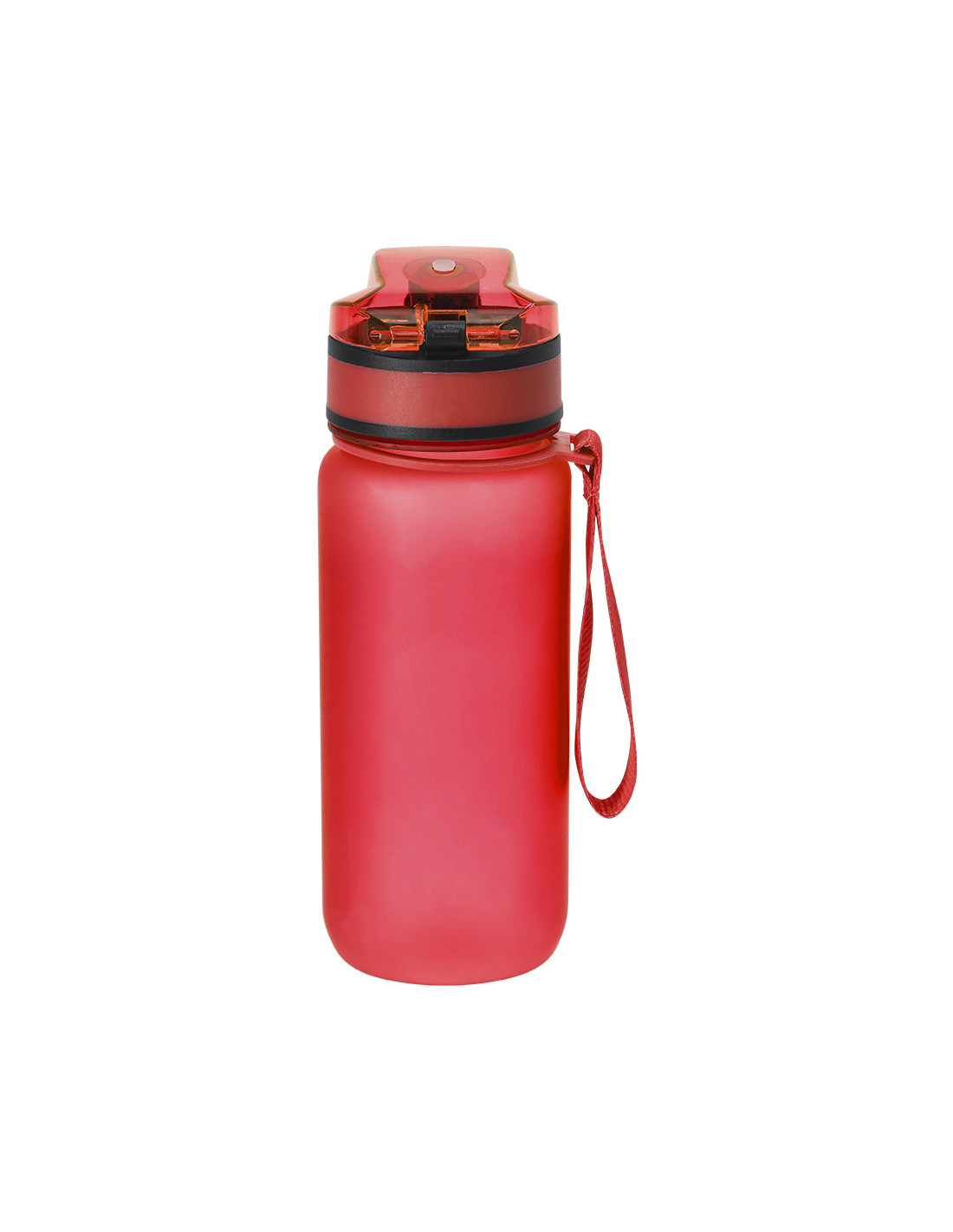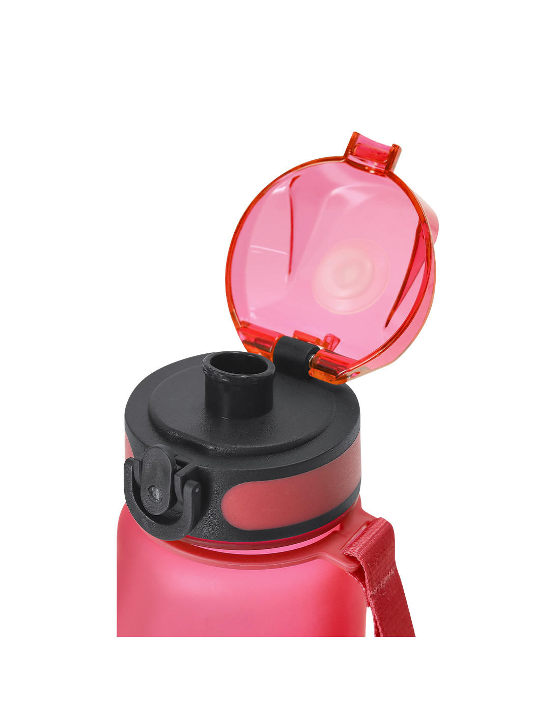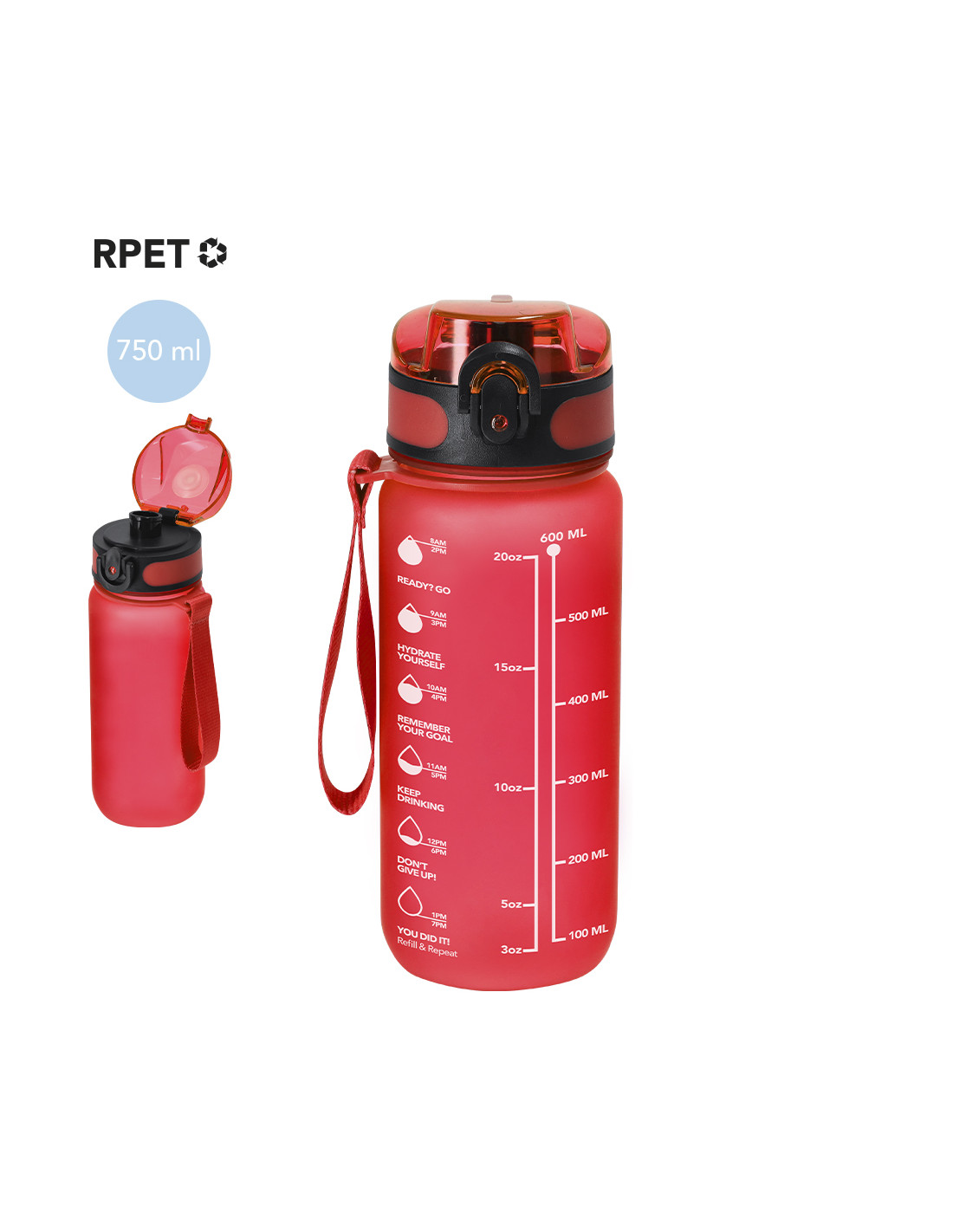 Bidón de 750 ml de capacidad, fabricado en resistente RPET y en acabado translúcido mate. Ingeniosa tapadera con resorte de fácil apertura pulsando el botón frontal, con cierre de seguridad. Sellado óptimo de tapón a rosca y asa para un cómodo transporte en el mismo color. Libre de BPA.