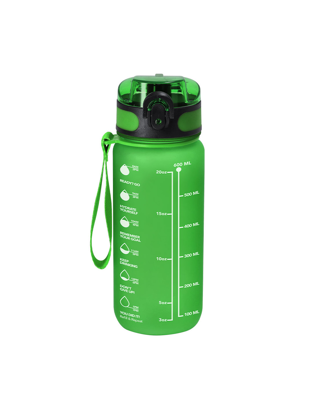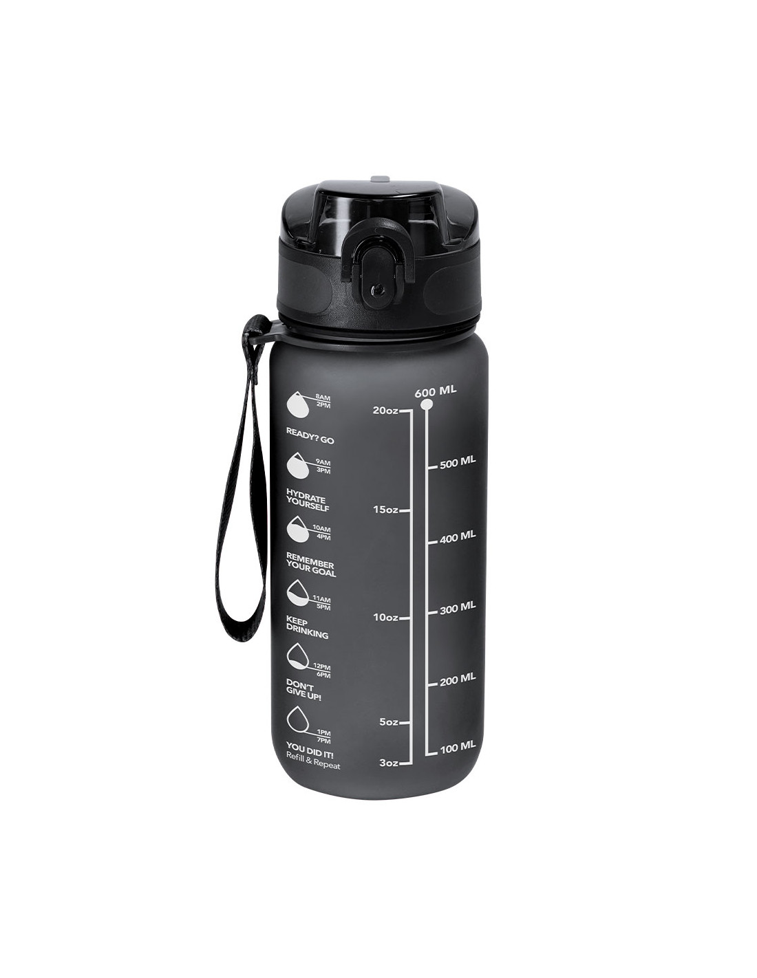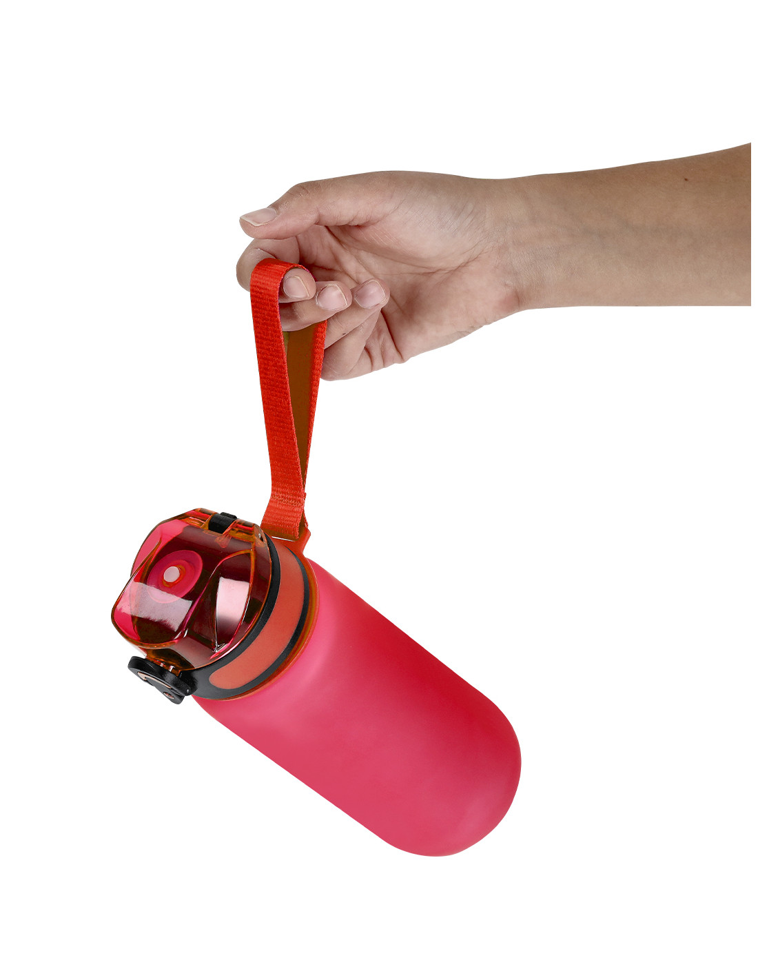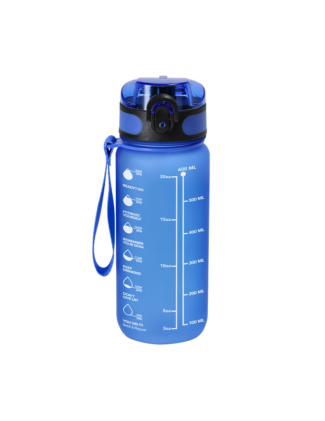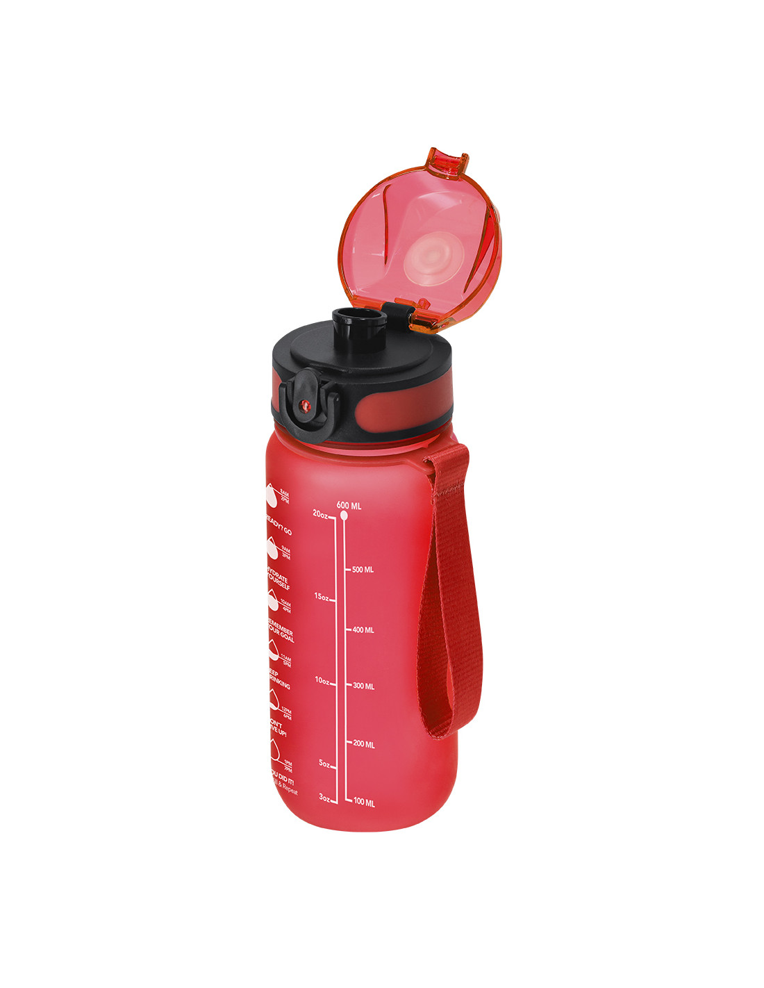 Bidón de 750 ml de capacidad, fabricado en resistente RPET y en acabado translúcido mate. Ingeniosa tapadera con resorte de fácil apertura pulsando el botón frontal, con cierre de seguridad. Sellado óptimo de tapón a rosca y asa para un cómodo transporte en el mismo color. Libre de BPA.