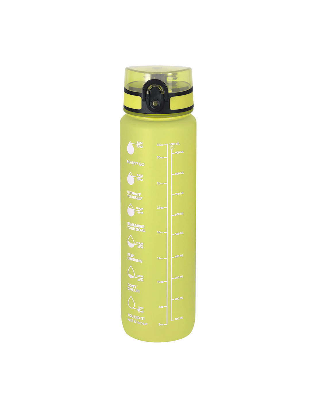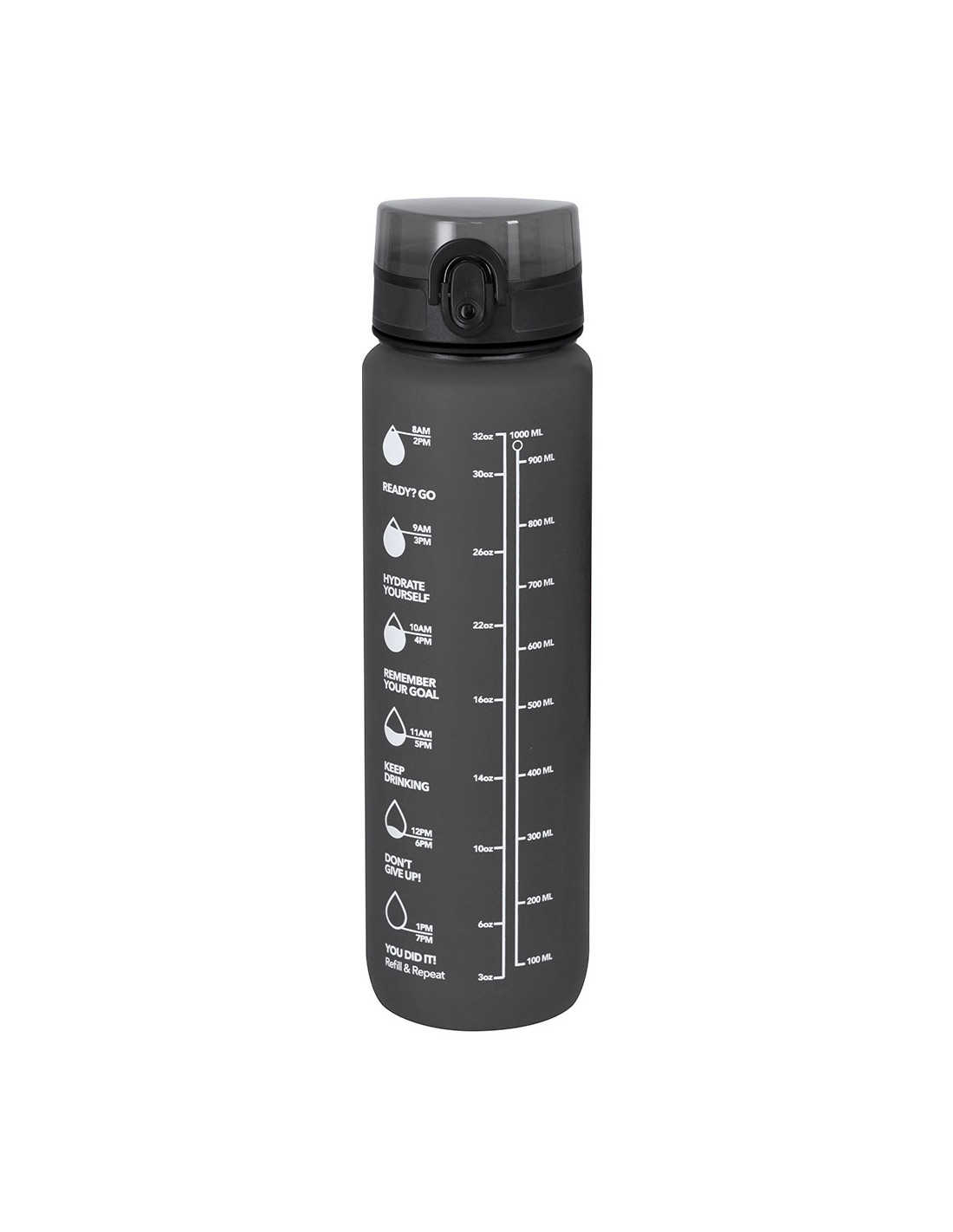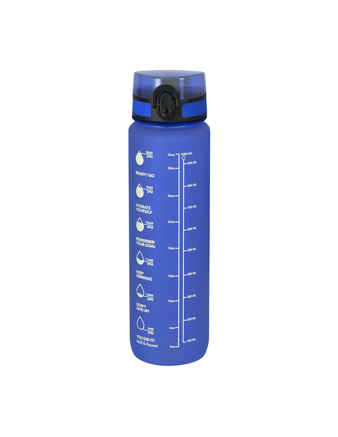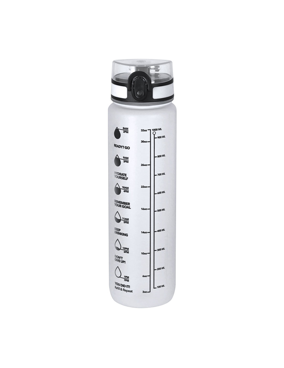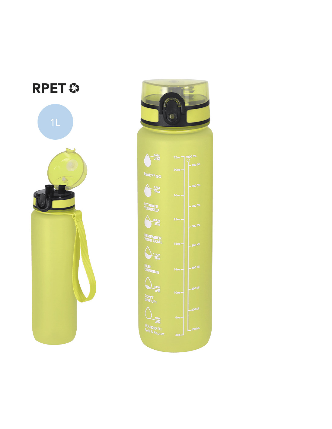 Bidón de 1L de capacidad, fabricado en resistente RPET y en acabado translúcido mate. Con indicador de capacidad en litros y onzas, junto con frases motivadoras que invitan a mantener una adecuada hidratación. Con tapón negro de rosca y tapa con capucha plástica transparente con cierre en push. Con boquilla y cierre de seguridad y cómoda cinta de transporte. Libre de BPA.