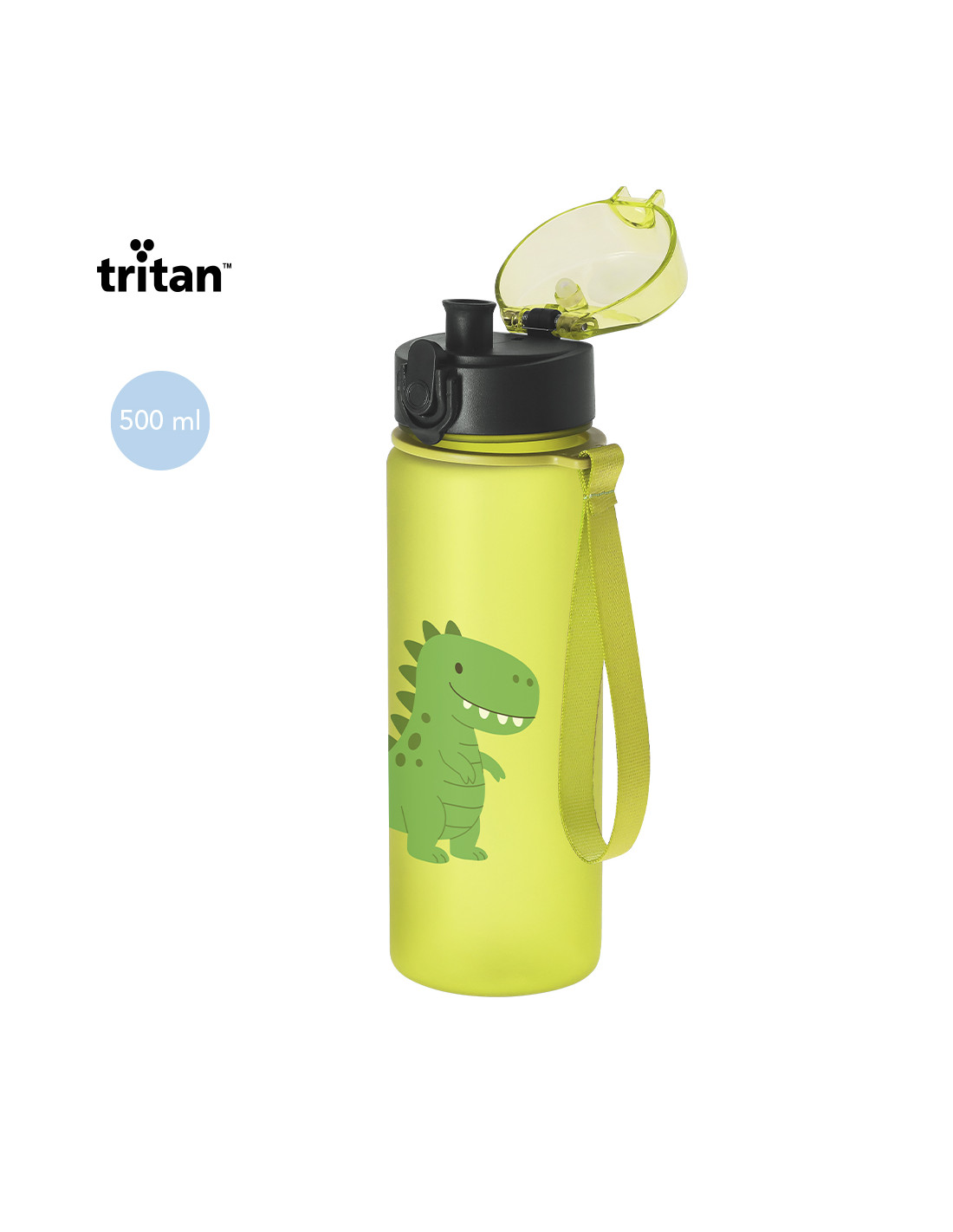 Bidón fabricado en Tritan de 500 ml de capacidad. Ingeniosa tapadera con resorte de fácil apertura pulsando el botón frontal, con cierre de seguridad. Sellado óptimo de tapón a rosca y asa para un cómodo transporte.