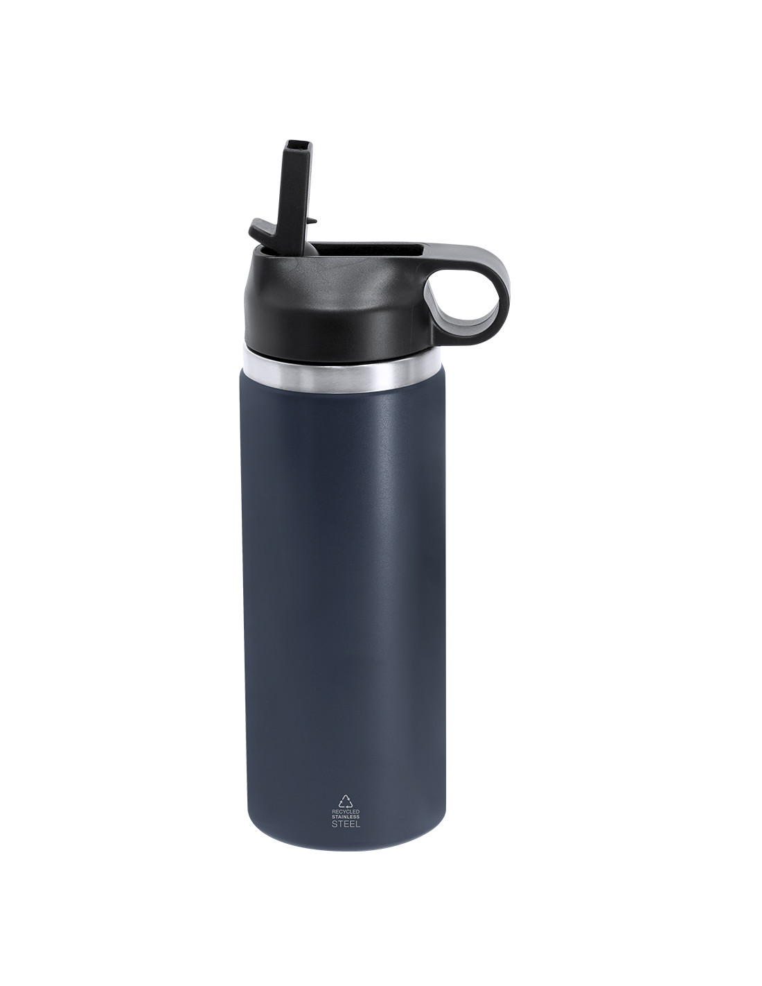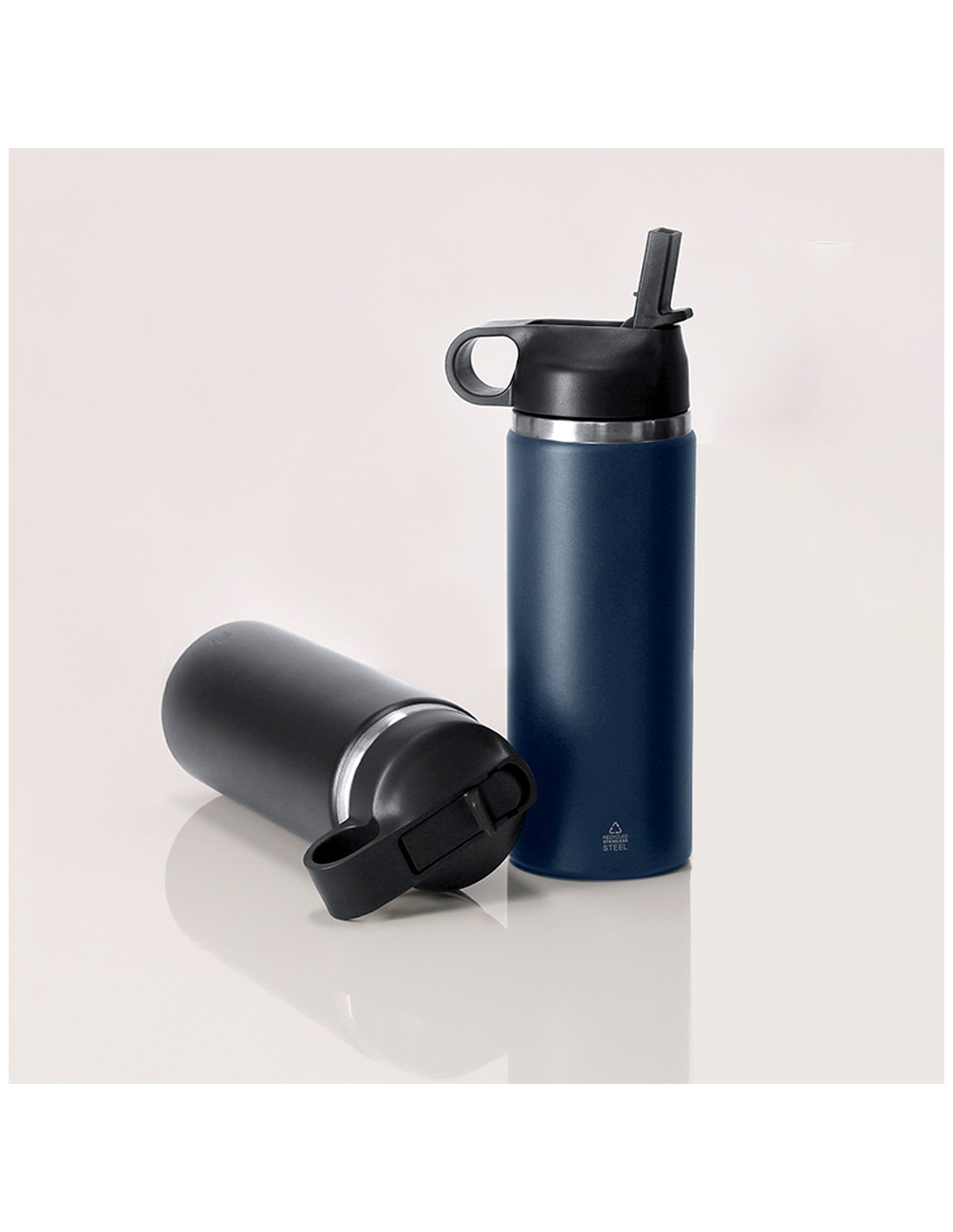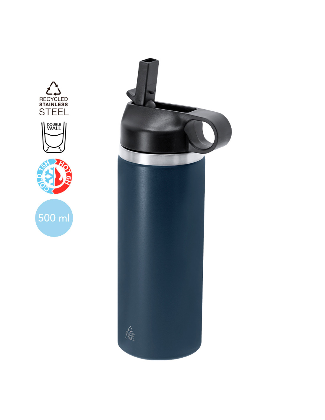 **Composición y materiales:** Bidón con 500 ml de capacidad fabricado en Acero Inoxidable Reciclado de doble pared, que garantiza una mejor y más duradera conservación de la temperatura. Sistema de fácil apertura con dosificador de pajita (libre de BPA) y asa de transporte a juego. Con distintivo de Acero Inox Reciclado.