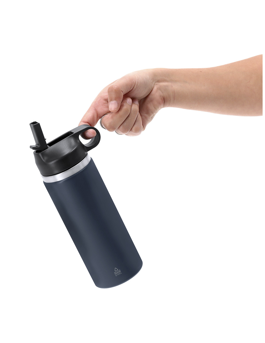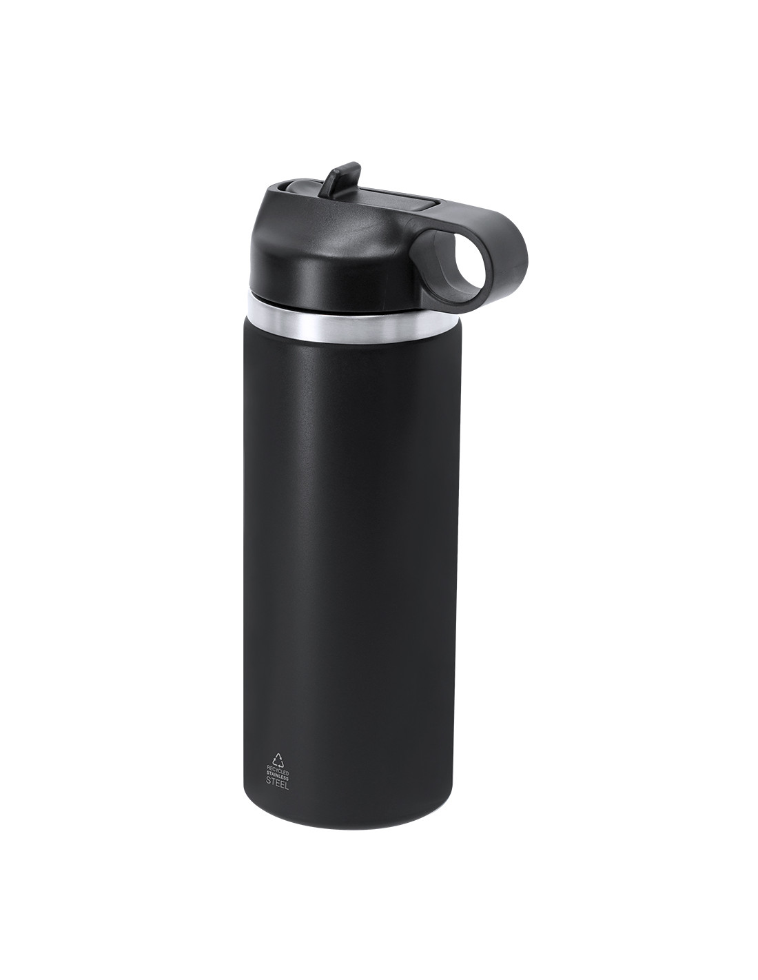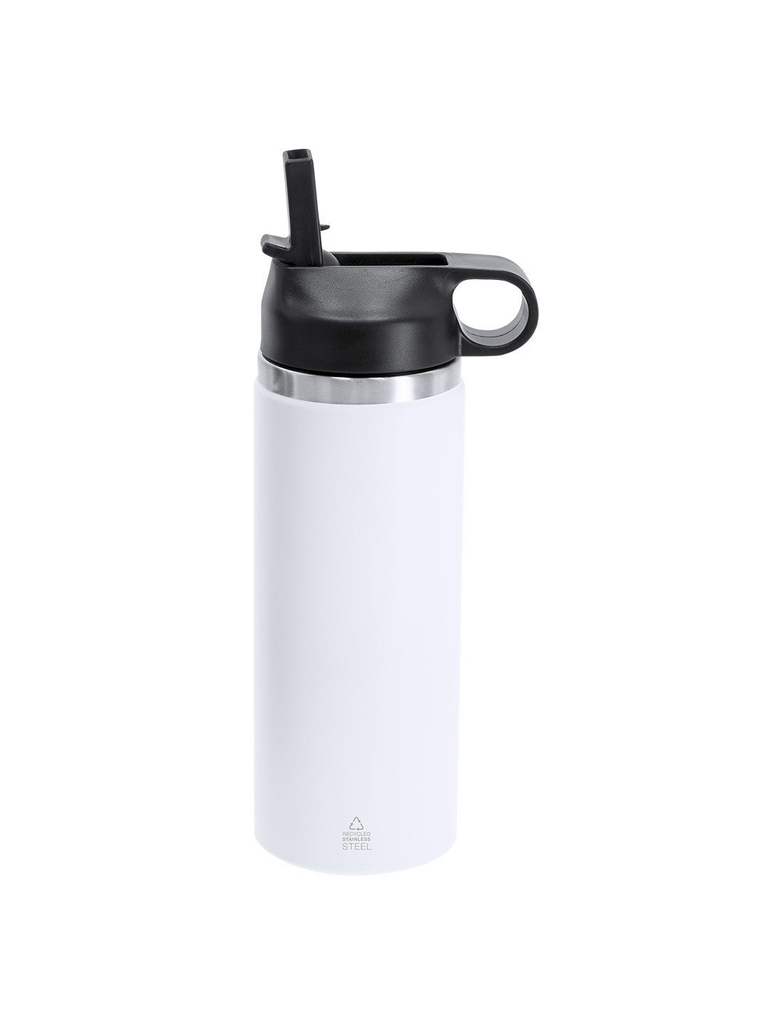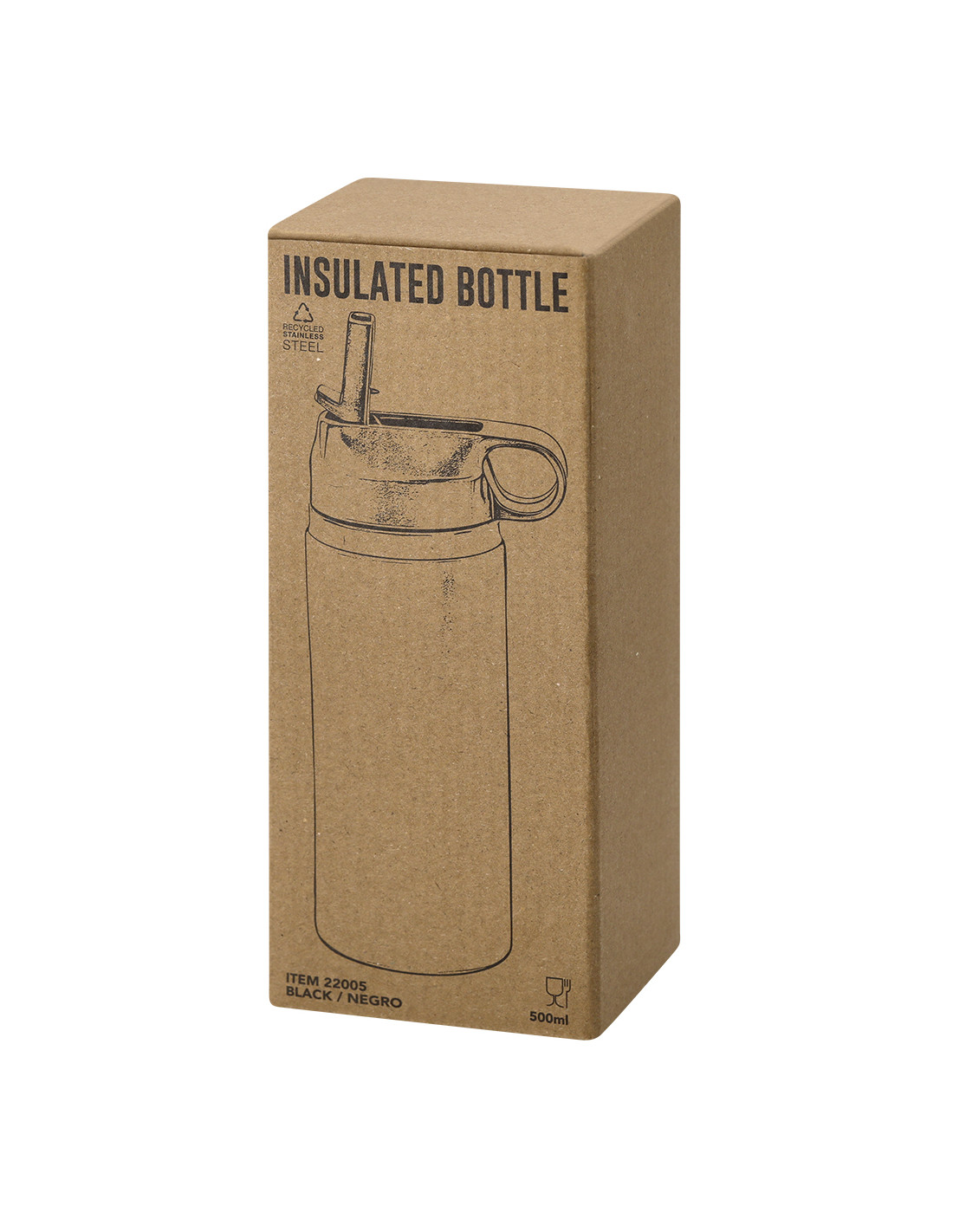 **Composición y materiales:** Bidón con 500 ml de capacidad fabricado en Acero Inoxidable Reciclado de doble pared, que garantiza una mejor y más duradera conservación de la temperatura. Sistema de fácil apertura con dosificador de pajita (libre de BPA) y asa de transporte a juego. Con distintivo de Acero Inox Reciclado.