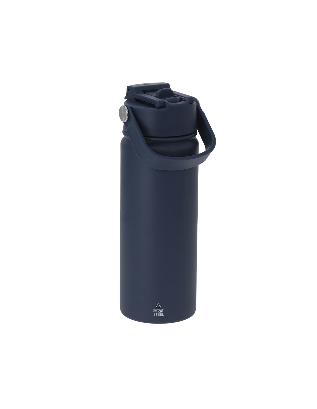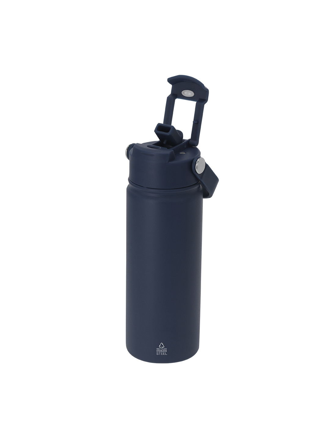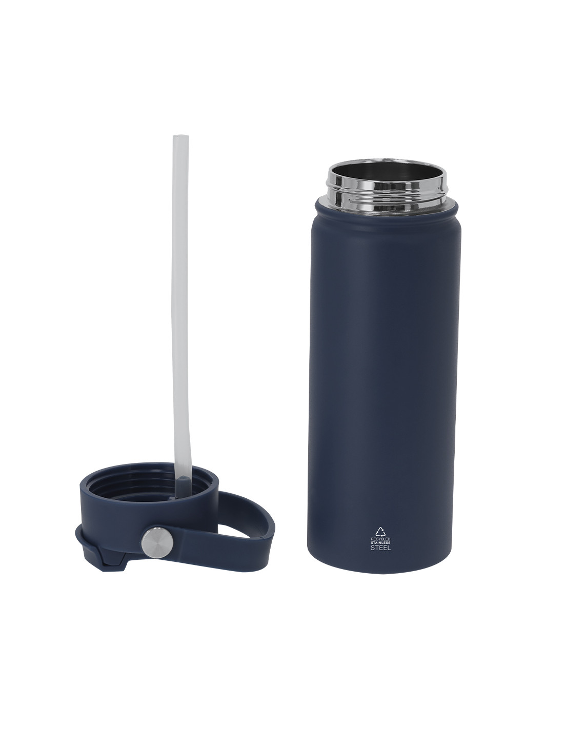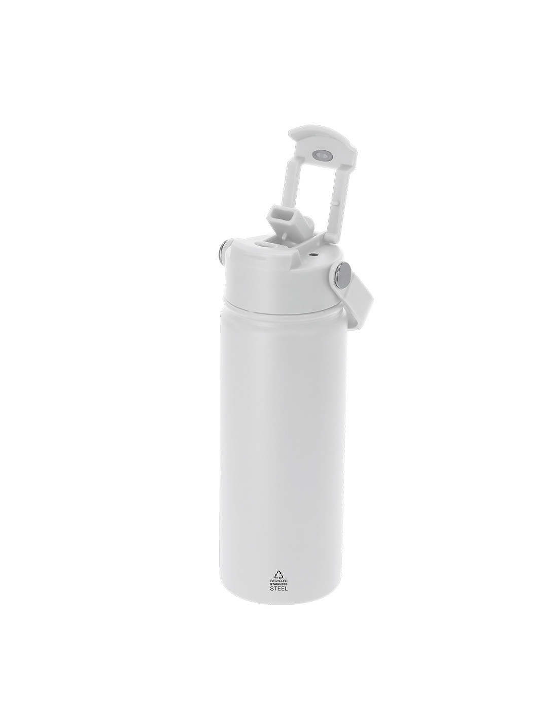 Bidón térmico con 550 ml de capacidad. Fabricado en Acero Inoxidable Reciclado. Cuenta con doble sistema de bebida: orificio con cierre hermético y pajita integrada, adaptándose a las preferencias de uso. Con tapa de sistema de sellado hermético. Incluye práctica asa de transporte, ideal para transportarlo fácilmente en cualquier situación. Libre de BPA. Con distintivo de Acero Inoxidable Reciclado.