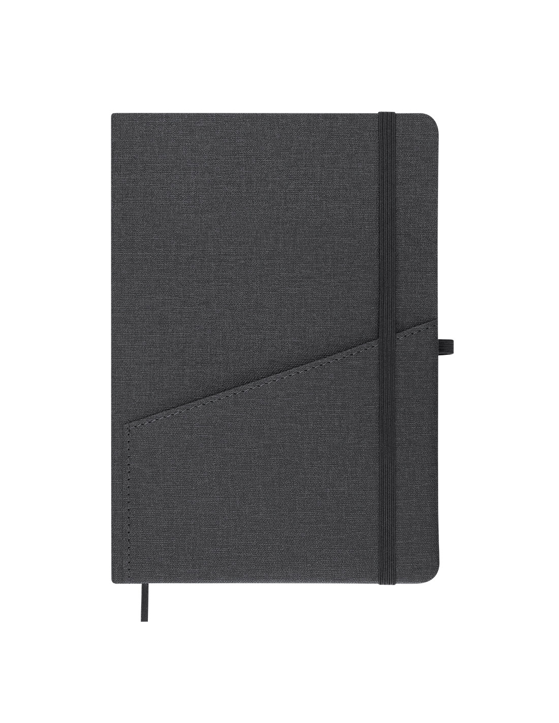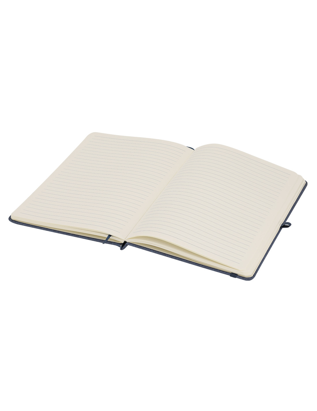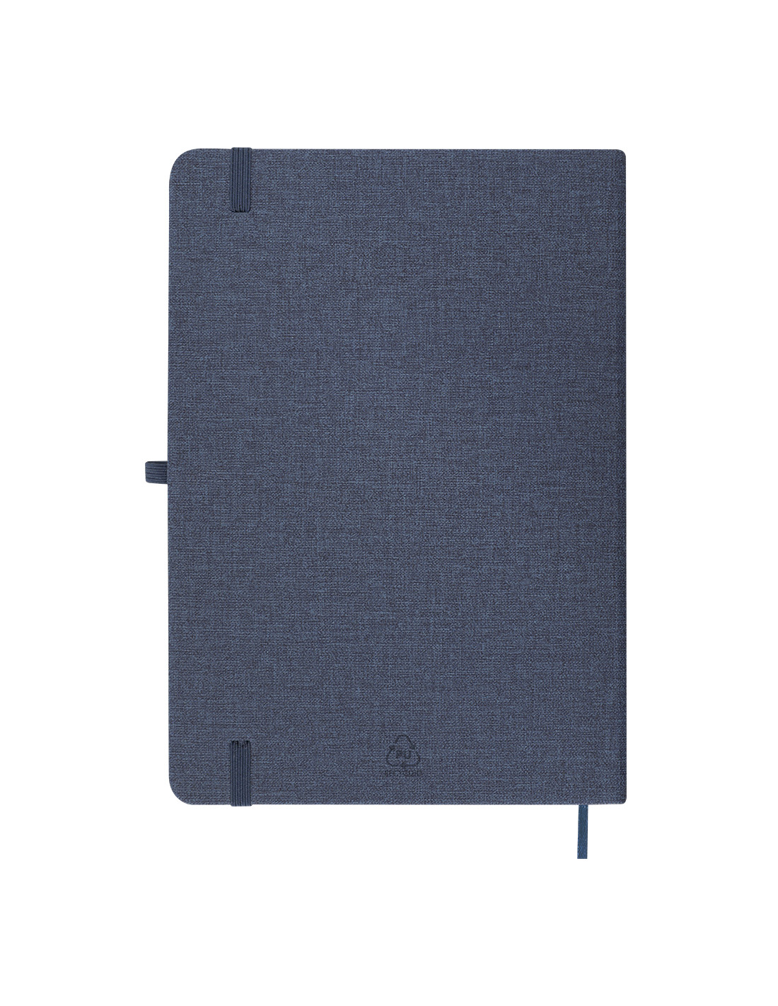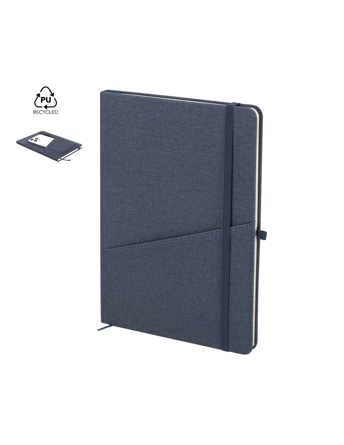 **Composición y materiales:** Bloc de notas con cubiertas rígidas y elaborado en PU Reciclado. Con práctico bolsillo frontal, soporte para bolígrafo, marcapáginas y cinta elástica de cierre a juego. Incluye 80 hojas color crema con disposición a rayas. Con distintivo de PU Reciclado.