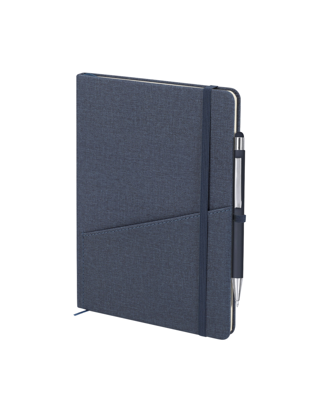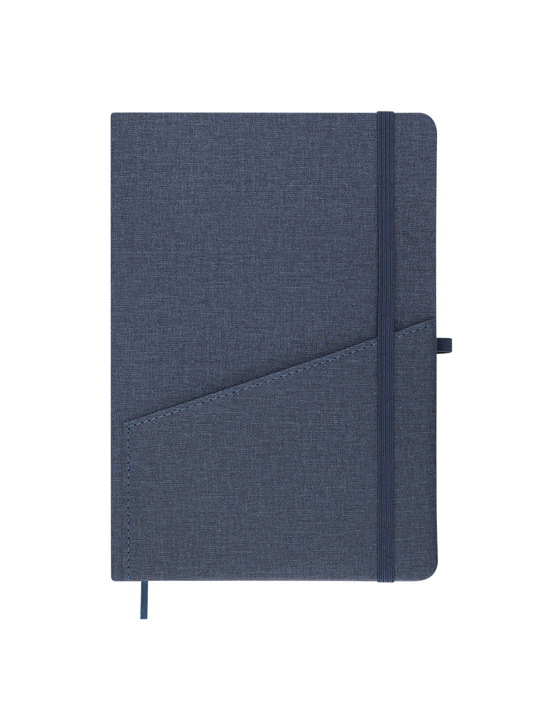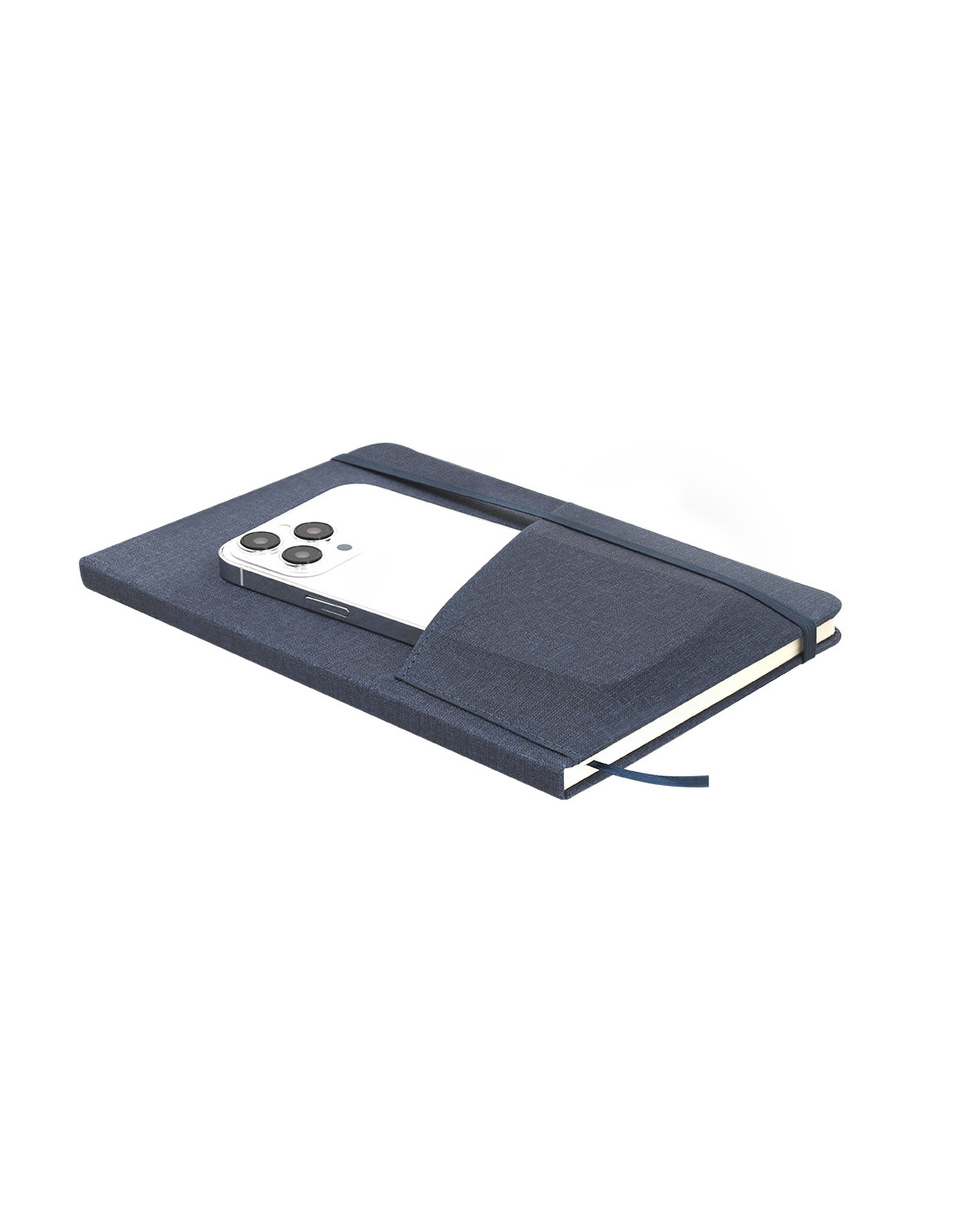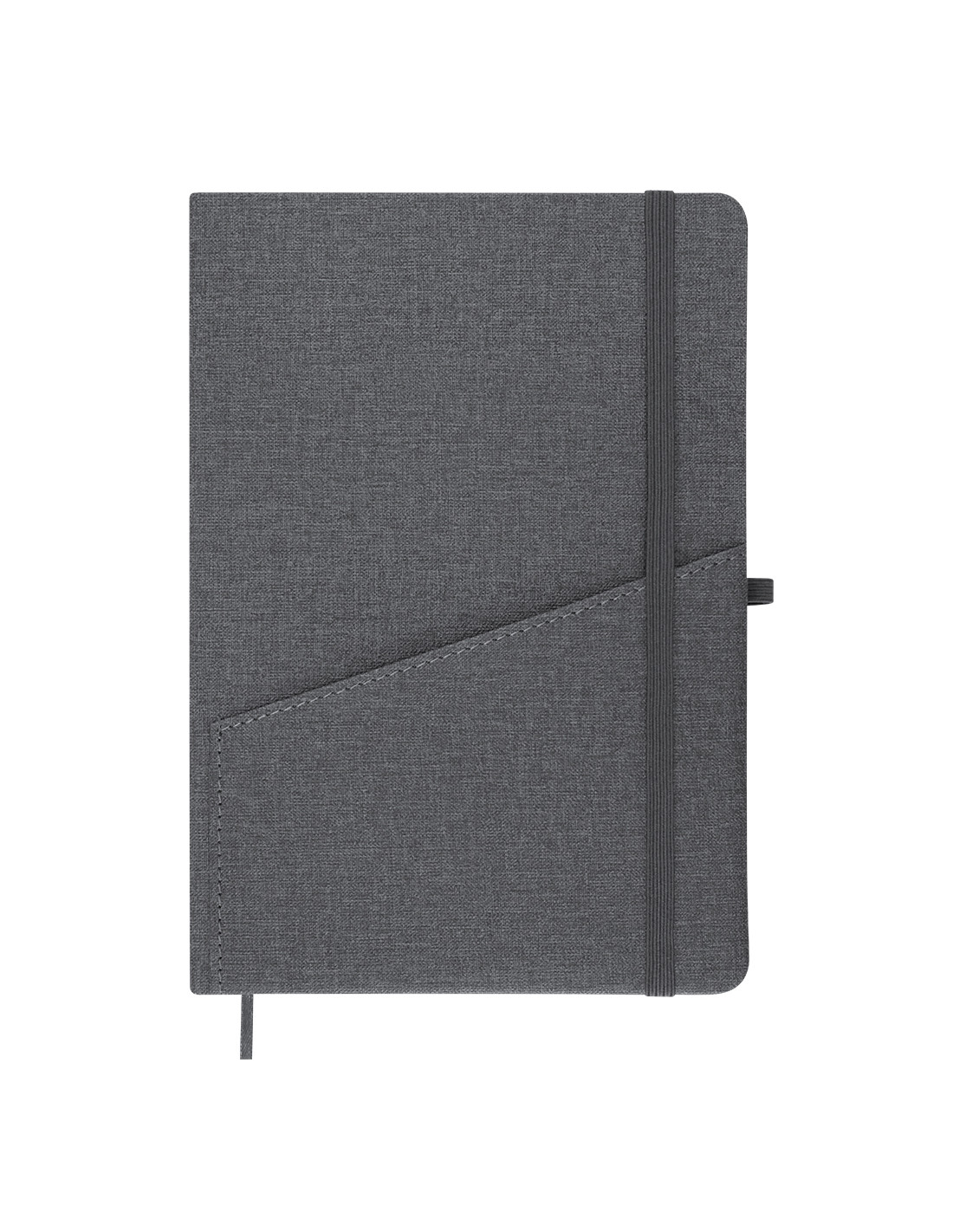 **Composición y materiales:** Bloc de notas con cubiertas rígidas y elaborado en PU Reciclado. Con práctico bolsillo frontal, soporte para bolígrafo, marcapáginas y cinta elástica de cierre a juego. Incluye 80 hojas color crema con disposición a rayas. Con distintivo de PU Reciclado.