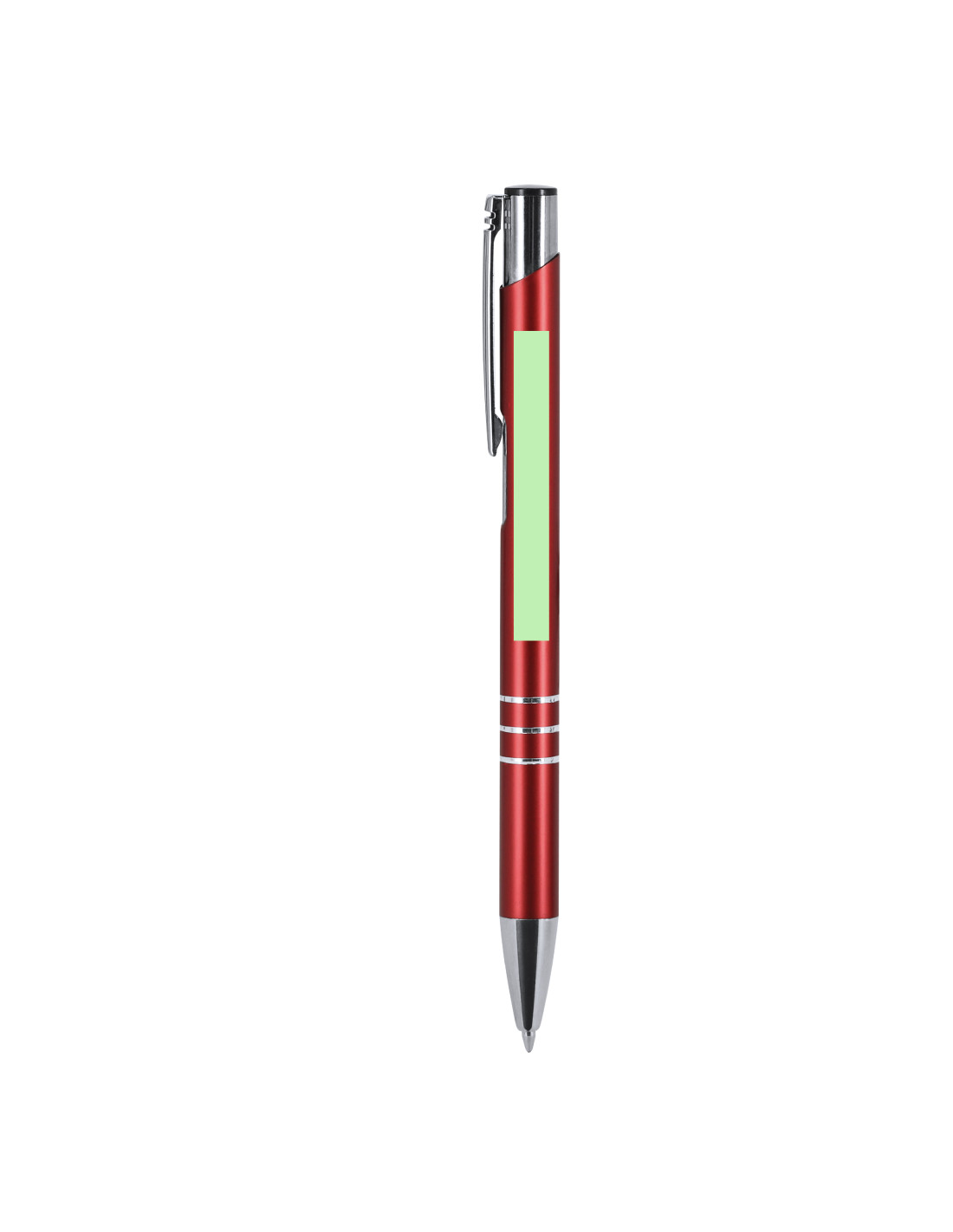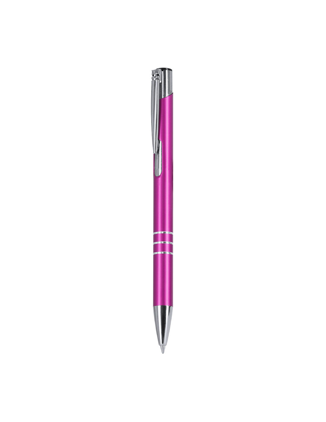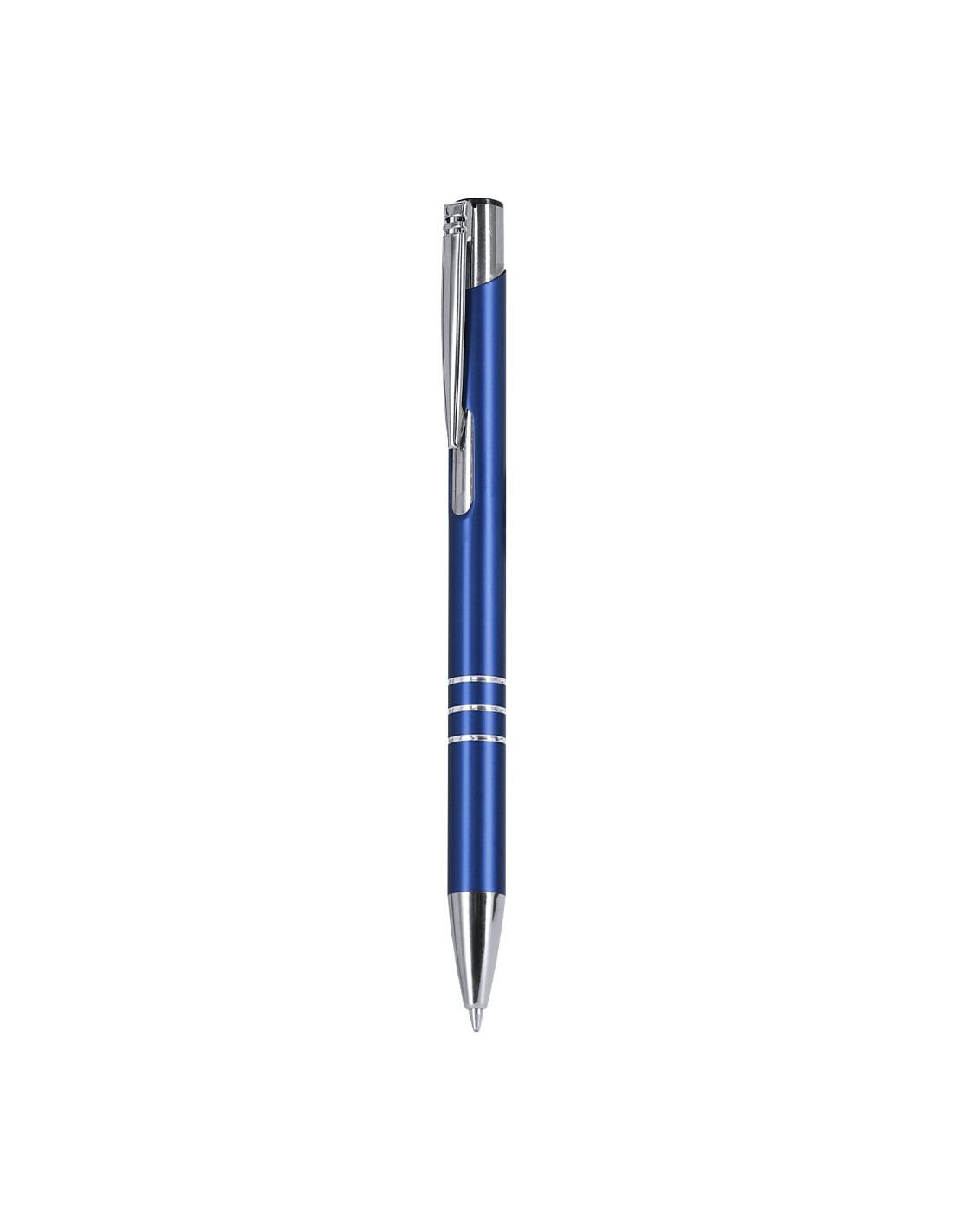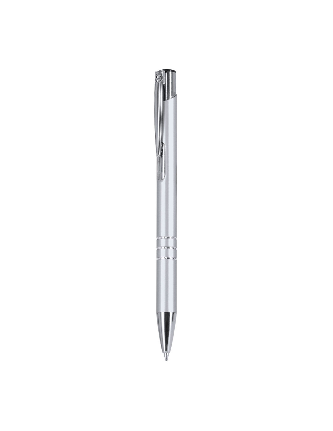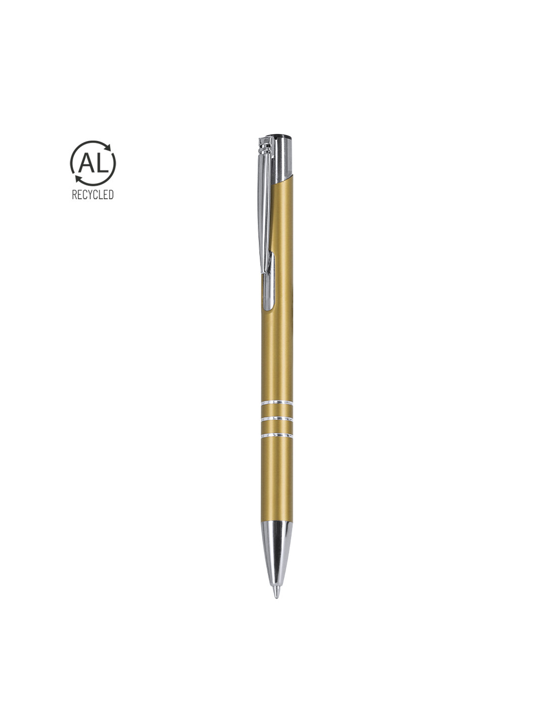 Bolígrafo de mecanismo pulsador. Acabado en aluminio reciclado brillante, de cartucho jumbo y tinta azul.Con distintivo logo de Aluminio Reciclado.