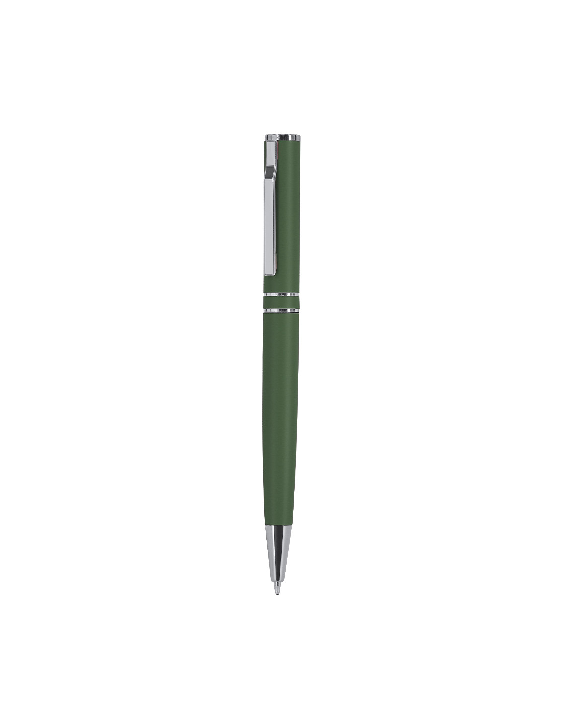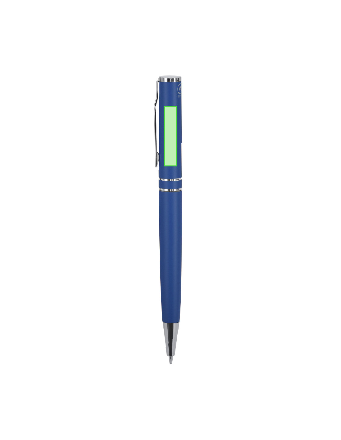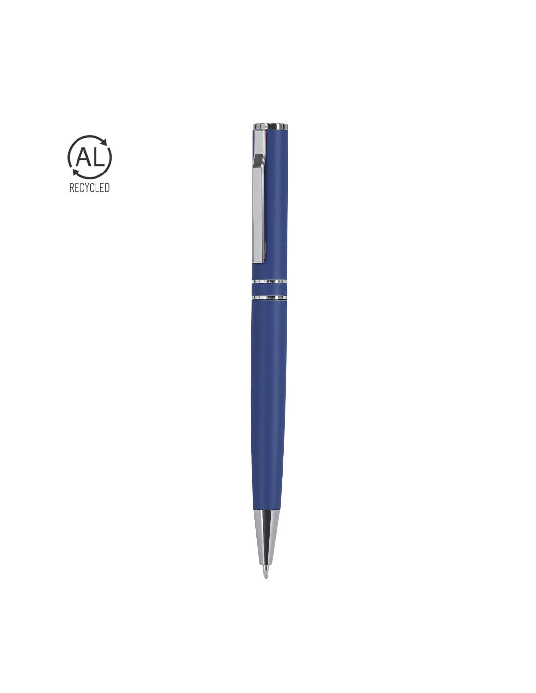 Bolígrafo con mecanismo de giro, fabricado en Aluminio Reciclado. Cuerpo con acabado mate. Incluye accesorios cromados y clip a juego. Carga jumbo y tinta azul. . Incluye distintivo Aluminio reciclado.