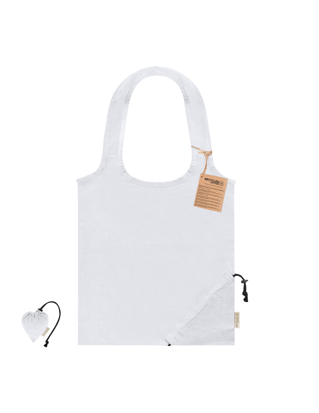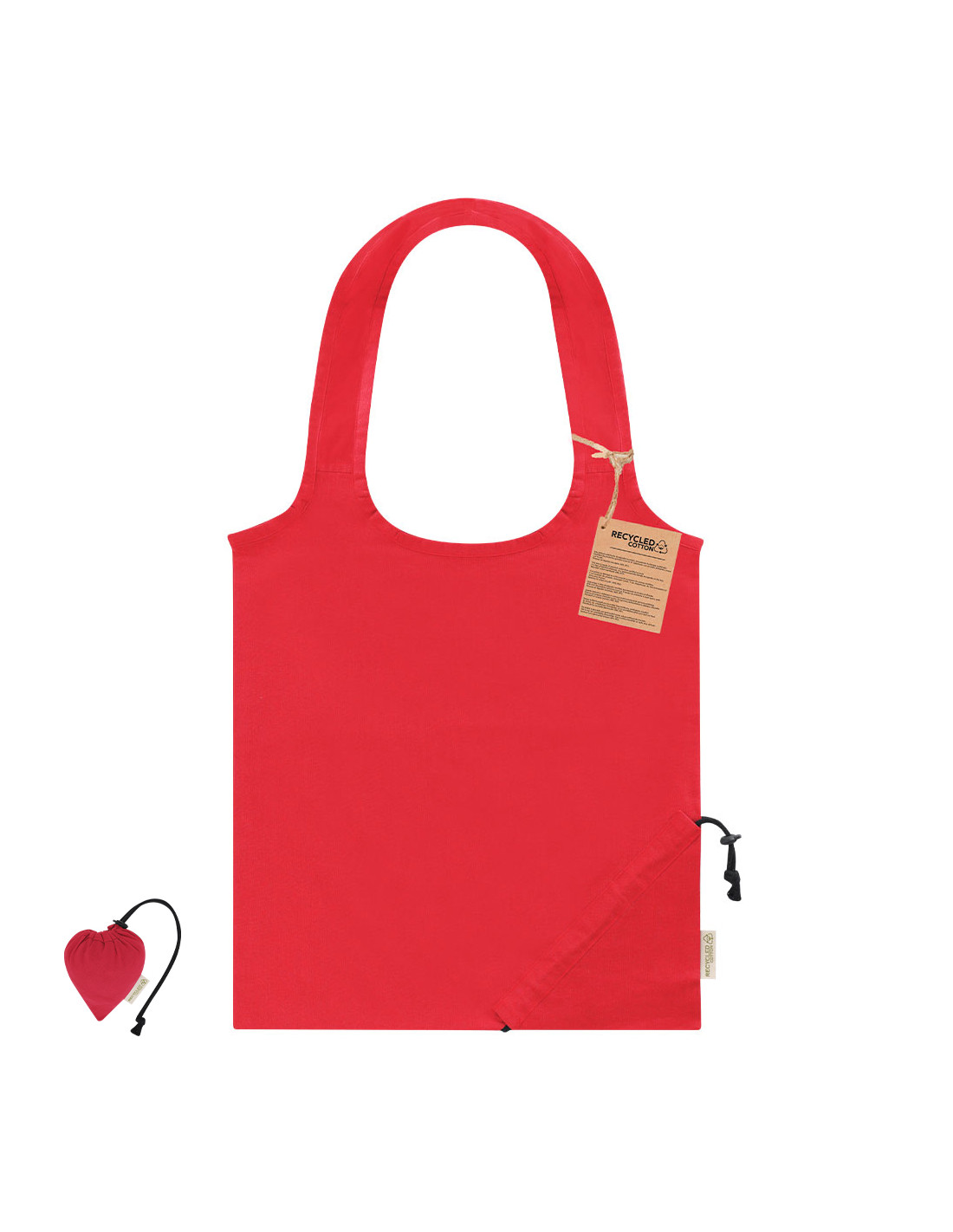 Bolsa plegable en algodón reciclado de 140 g/ m2 con diseño de corazón. Incluye accesorio de ajuste para fácil plegado. Asas largas de 48 x 5cm. Con una resistencia de hasta 7 kg de peso. Con distintiva etiqueta en el lateral y hantag.