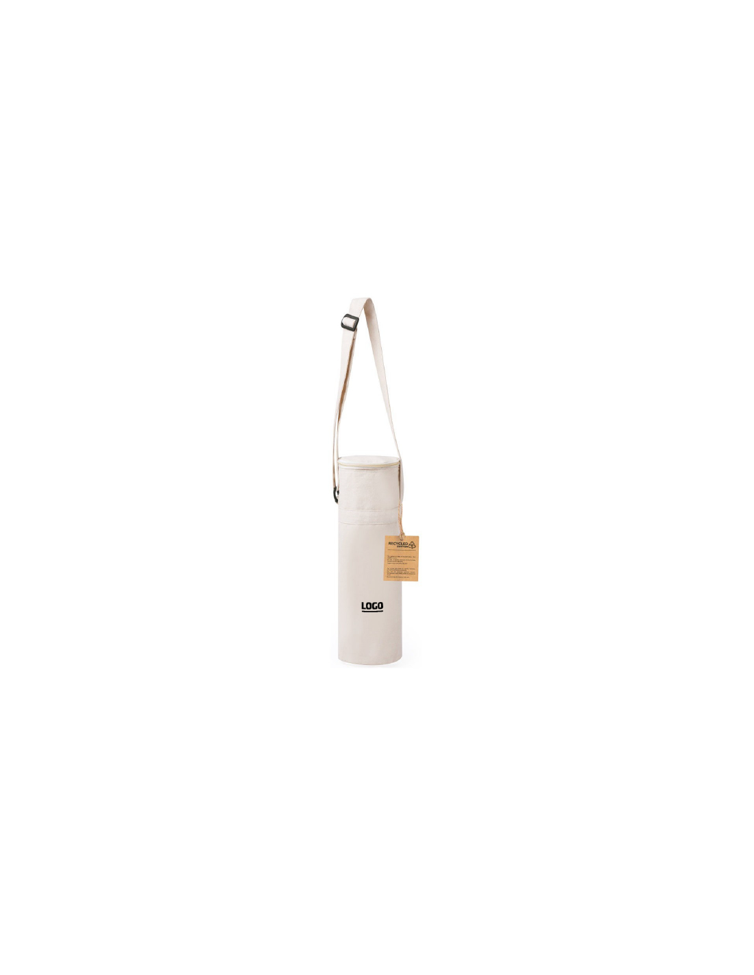 Bolsa térmica diseñada para transportar botellas de hasta 1,5L, confeccionada en algodón 100% reciclado. Se cierra mediante una cremallera y se lleva cómodamente con la cinta para el hombro ajustable, en tono natural. El interior está forrado con material isotérmico de aluminio y cuenta con una etiqueta distintiva. Presentado individualmente en bolsa reciclada.