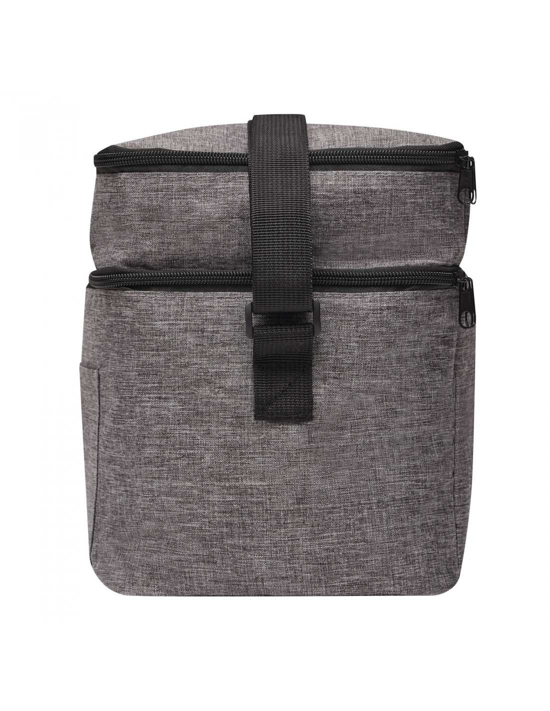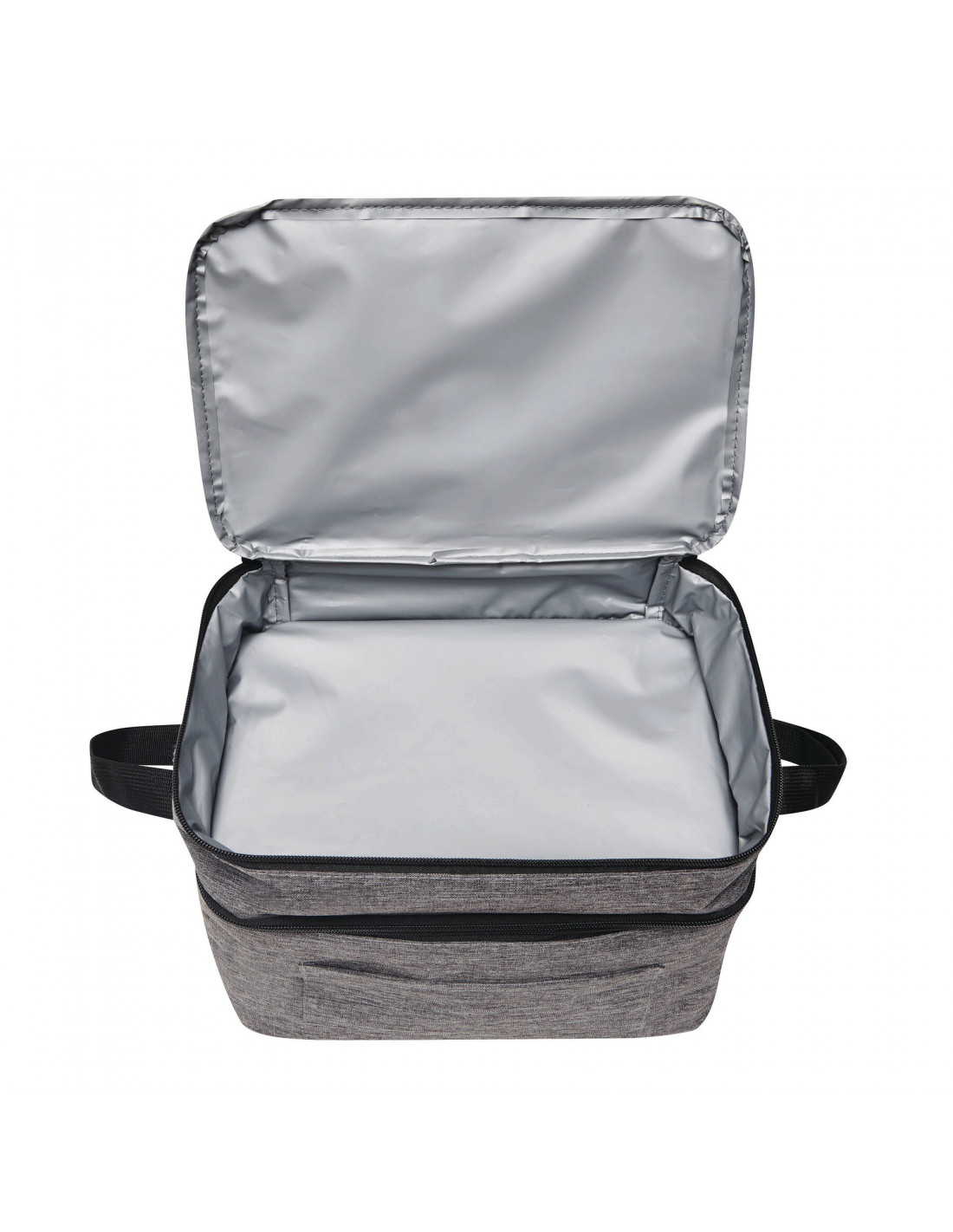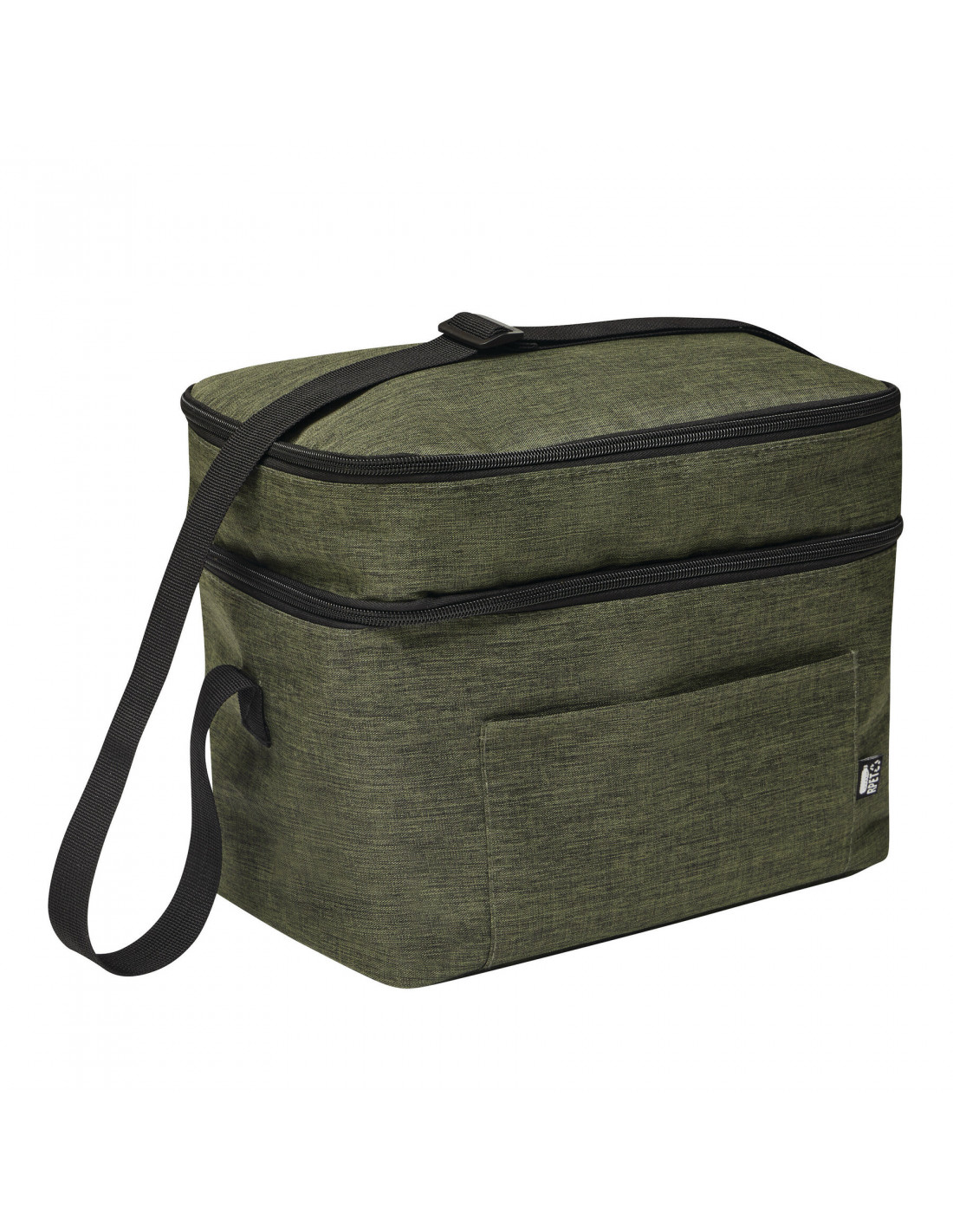 Bolsa isotérmica DEERING: fabricada en poliéster reciclado (rPET), amplio compartimento principal con forro de PEVA y bolsillo frontal abierto, compartimento más pequeño en la parte superior, correa de hombro ajustable.