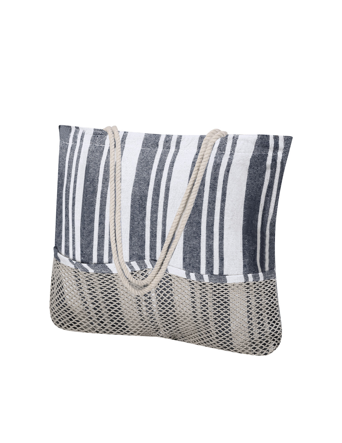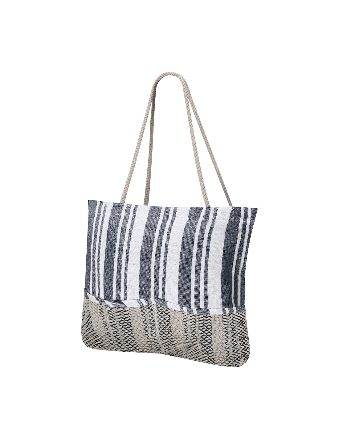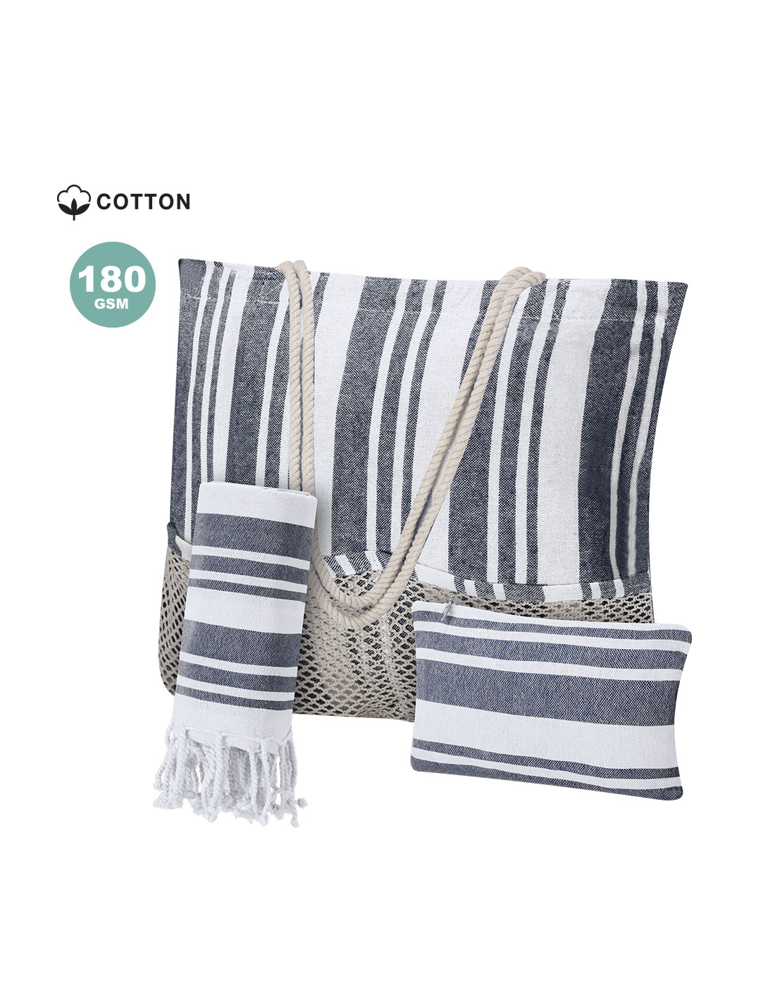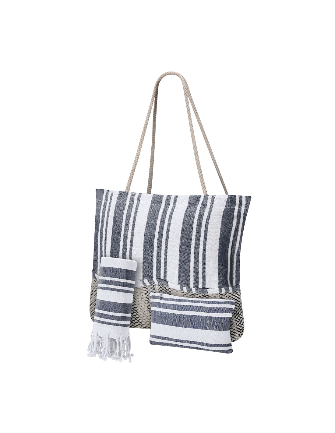 Set bolsa, neceser y pareo fabricado principalmente en algodón 180 g/m². Diseño de rayas con diferentes grosores. Ideal para escapadas vacacionales. Bolsa con 2 bolsillos frontales de malla, con fuelle y asas en cordón de algodón trenzado. Suave pareo en combinación. Su diseño cuenta con una base en color y rayas blancas a conjunto con la bolsa. Incluye flecos en los extremos que añaden un detalle decorativo y que completan su acabado.Neceser con compartimento principal de cierre de cremallera.