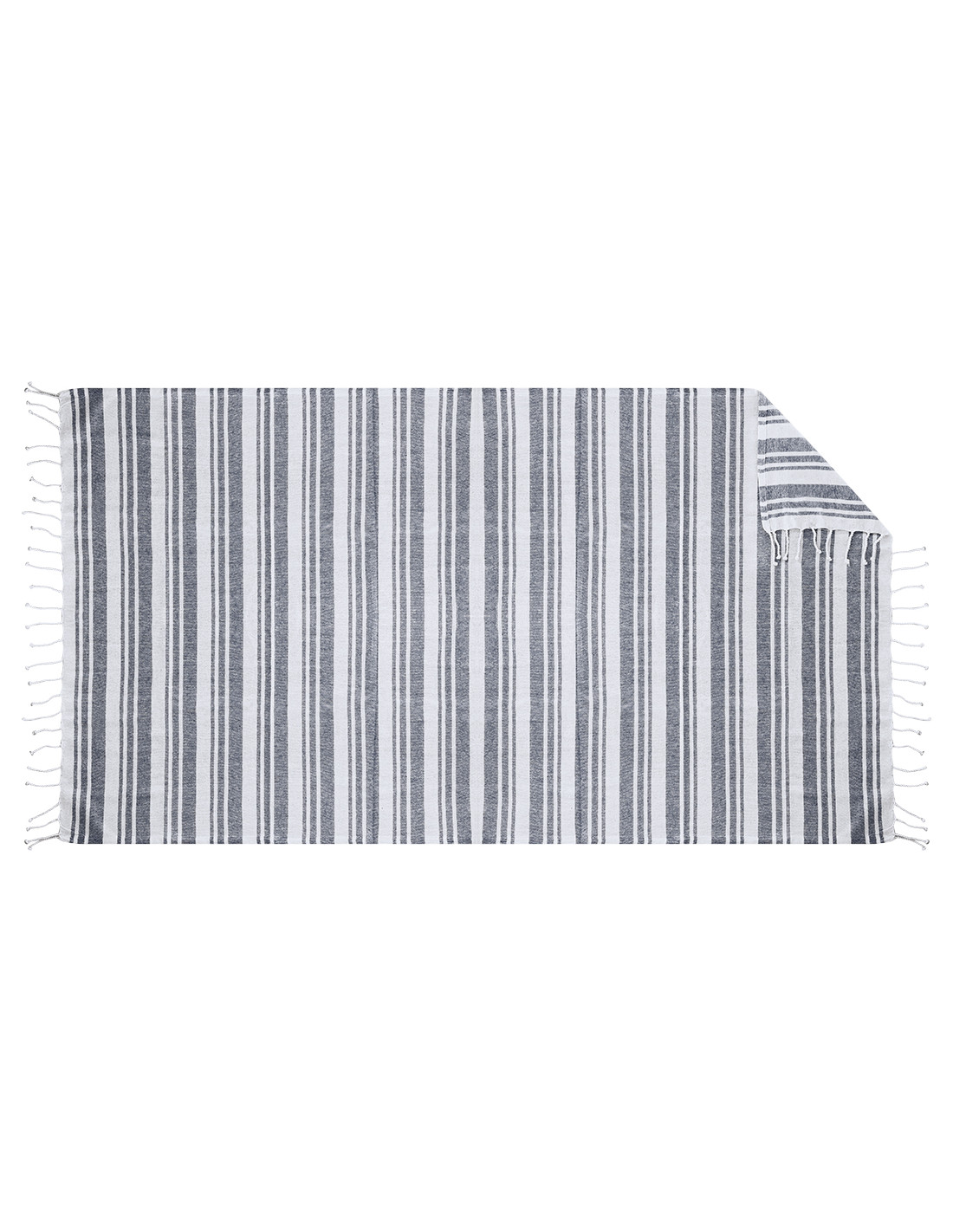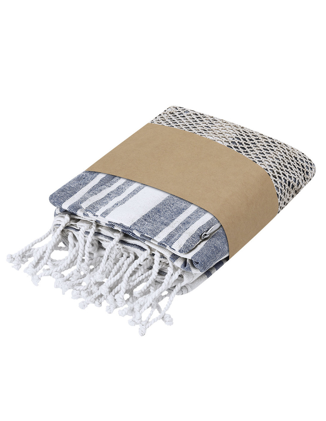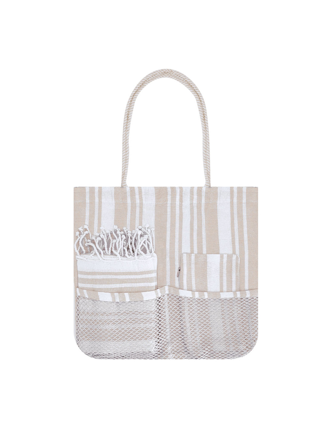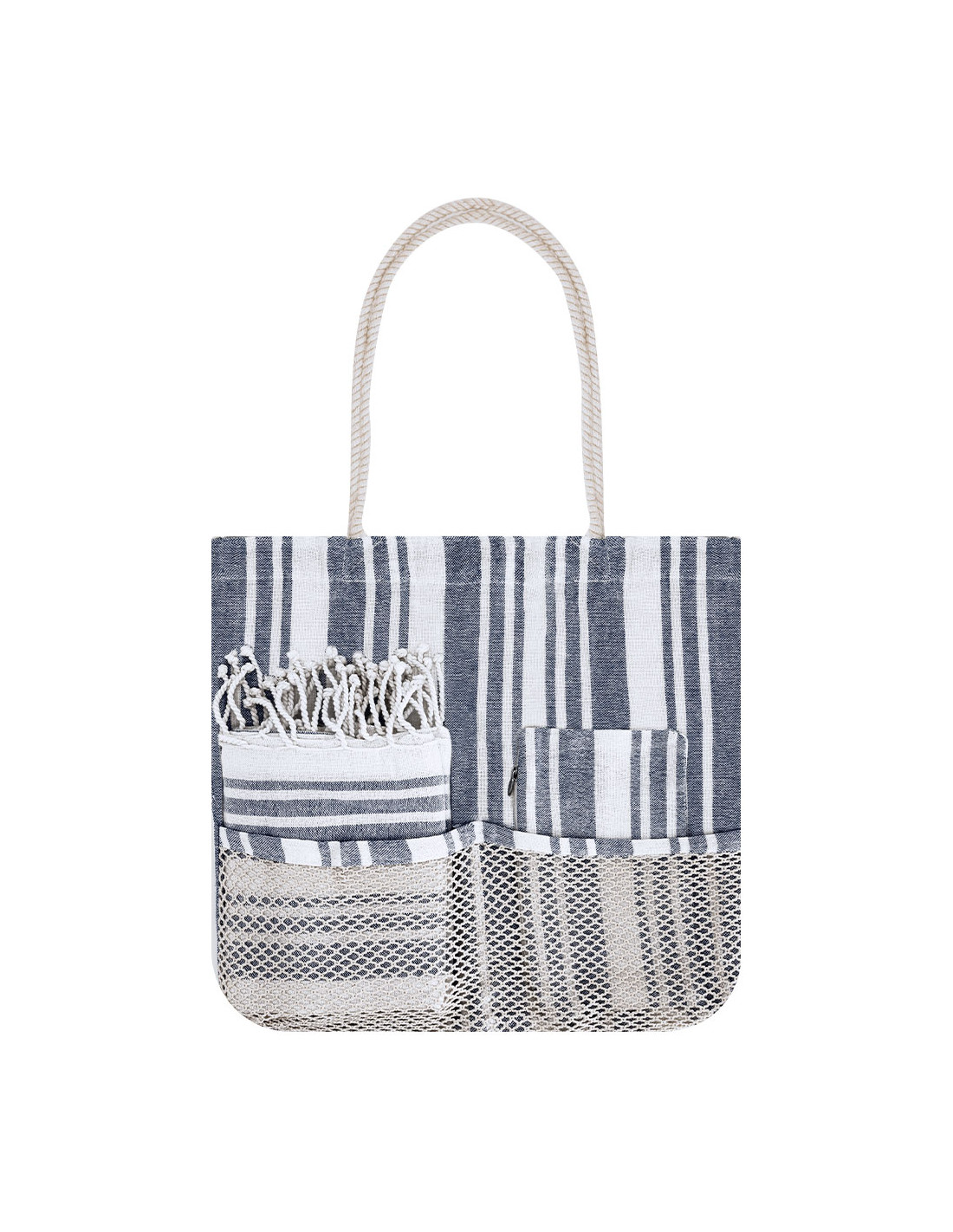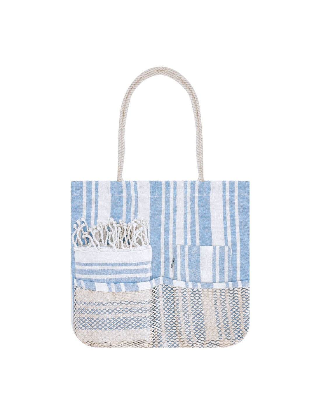 Set bolsa, neceser y pareo fabricado principalmente en algodón 180 g/m². Diseño de rayas con diferentes grosores. Ideal para escapadas vacacionales. Bolsa con 2 bolsillos frontales de malla, con fuelle y asas en cordón de algodón trenzado. Suave pareo en combinación. Su diseño cuenta con una base en color y rayas blancas a conjunto con la bolsa. Incluye flecos en los extremos que añaden un detalle decorativo y que completan su acabado.Neceser con compartimento principal de cierre de cremallera.