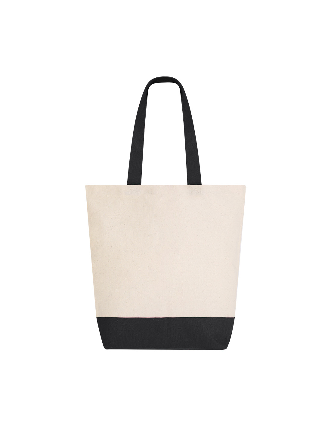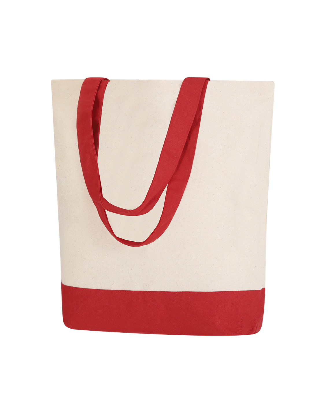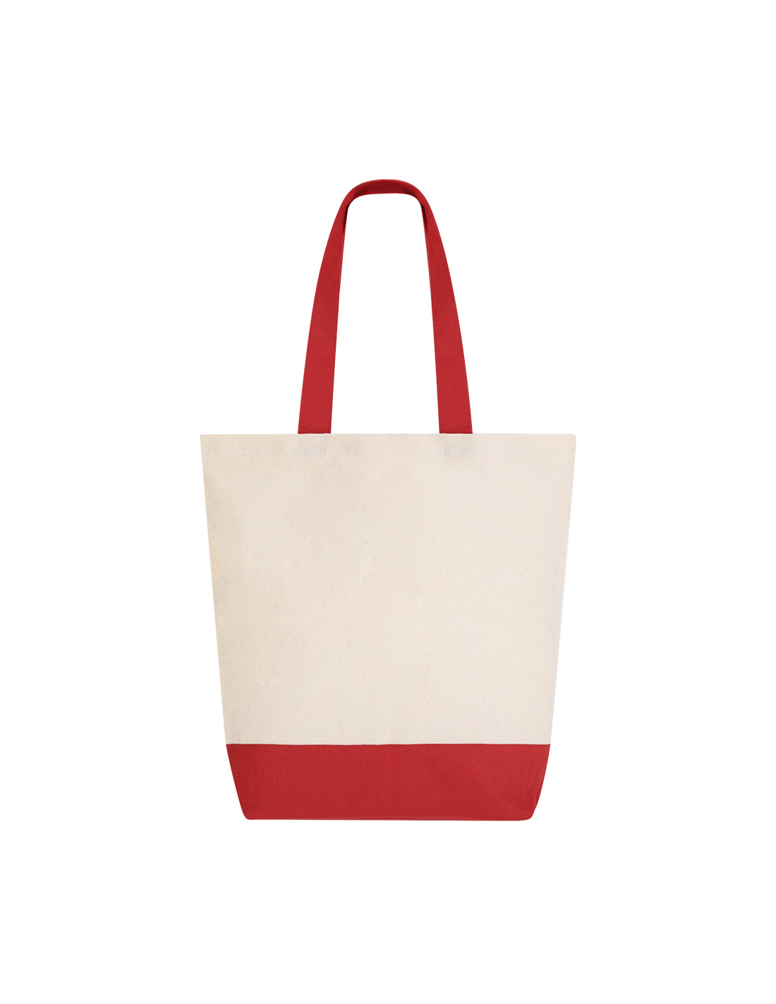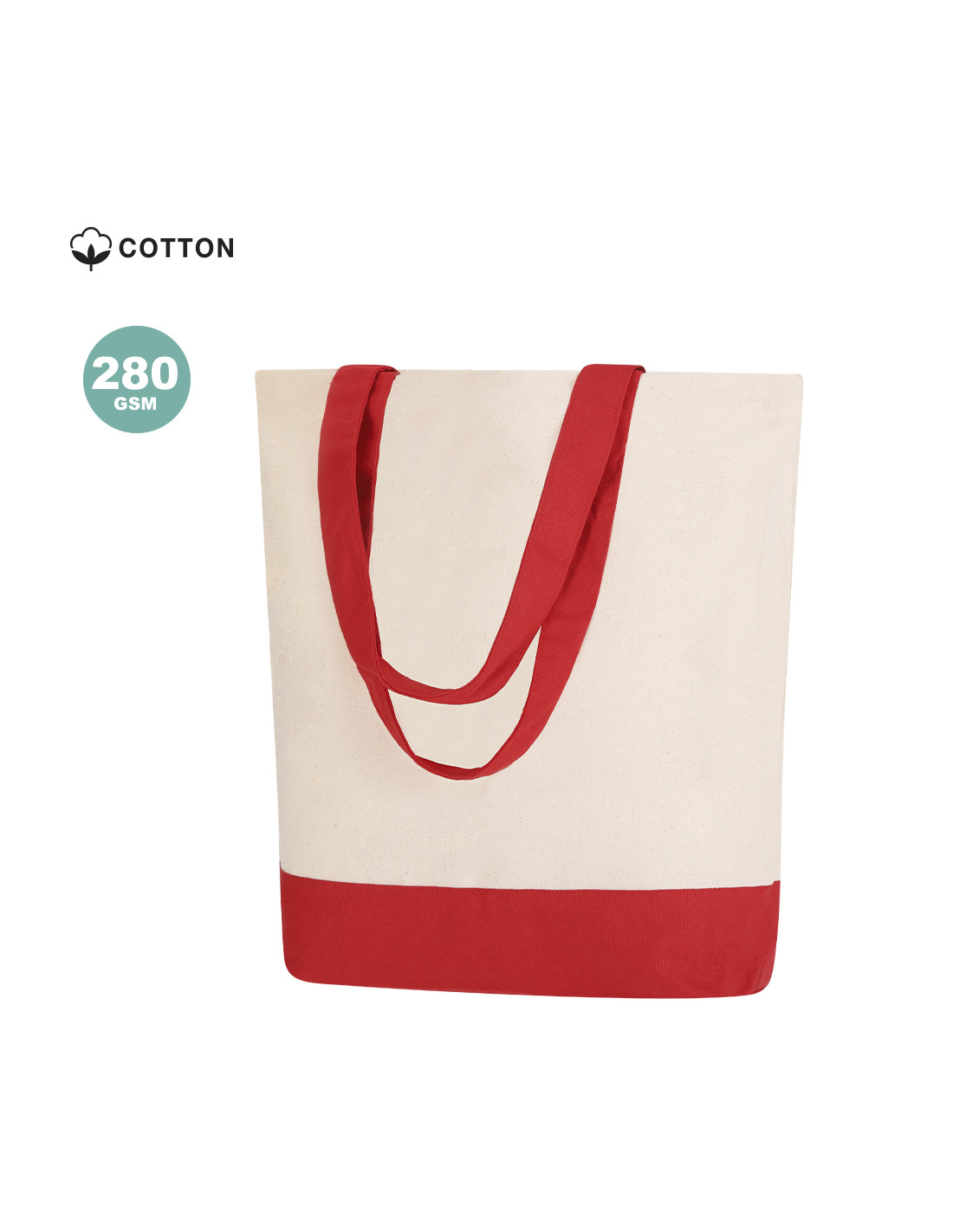 Bolsa en algodón de 280 g/m2 con diseño en base y asas del mismo color. Asas largas de 60x4 cm con refuerzo, de acabado cosido, con bolsillo interior. Resistencia de hasta 15 kg de peso.