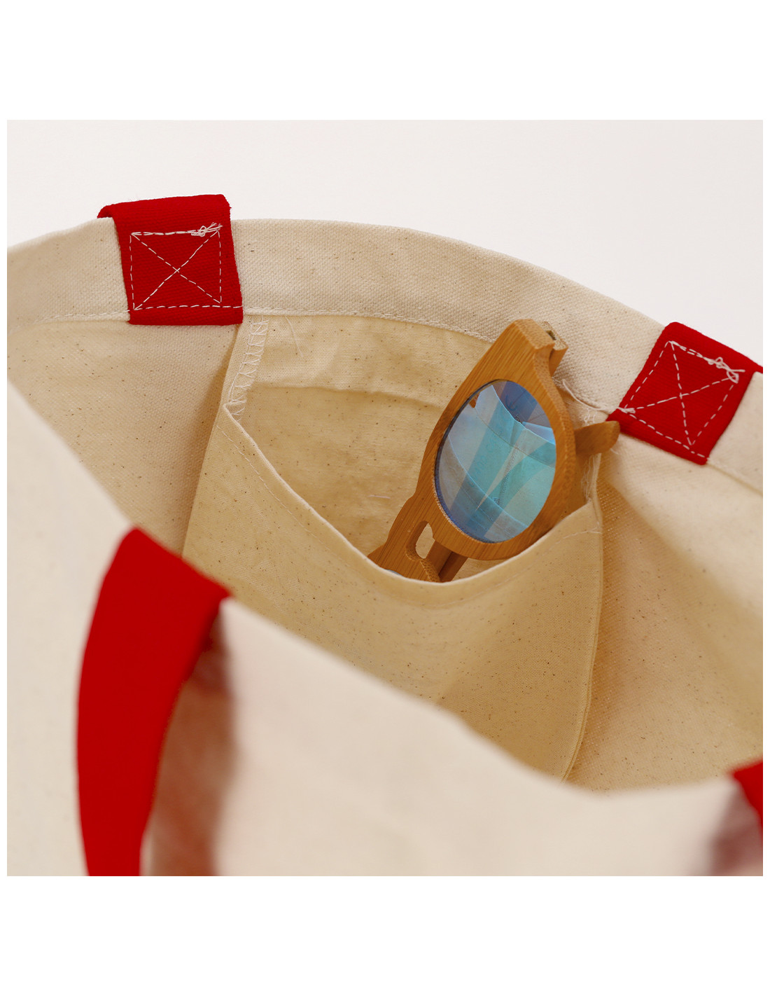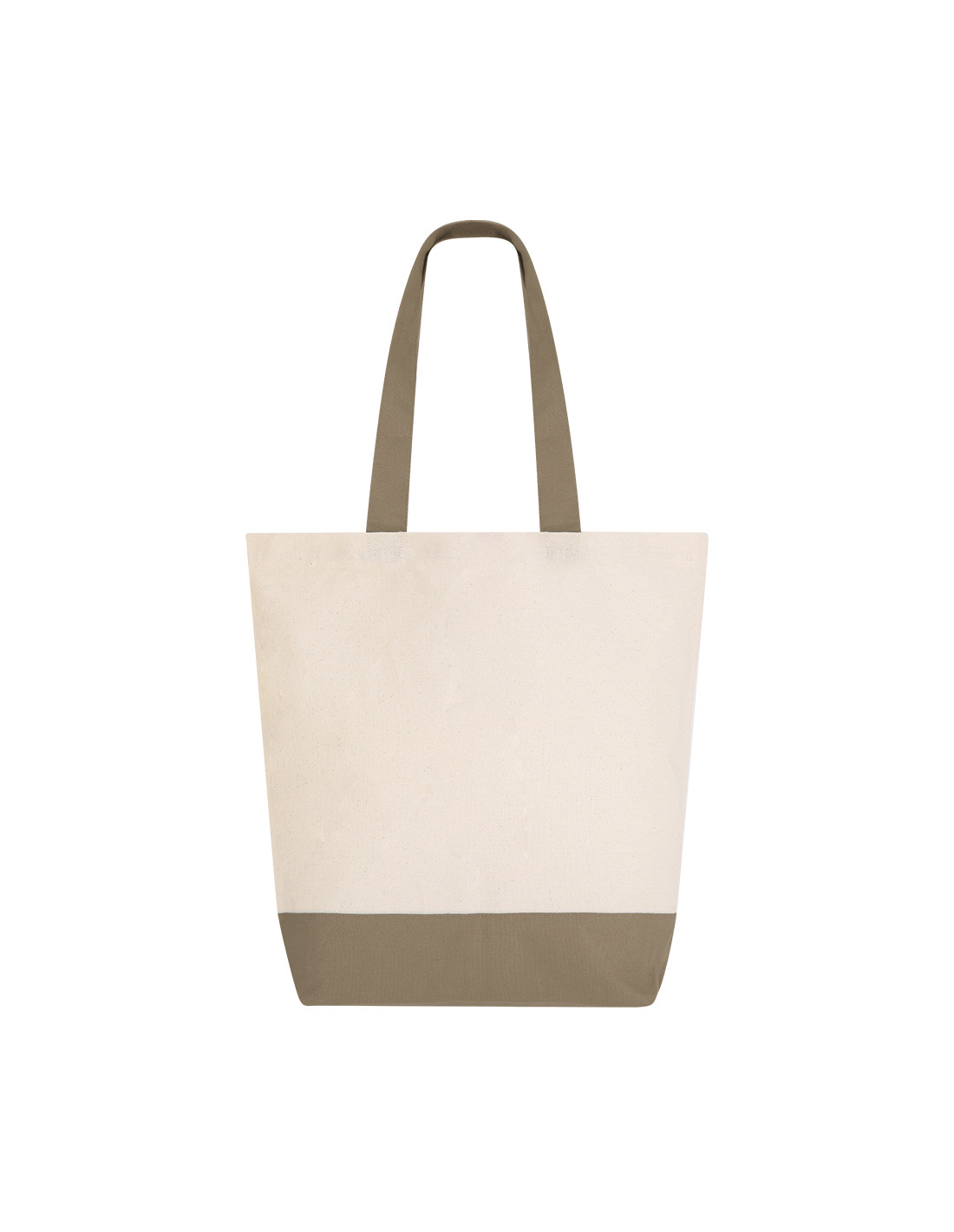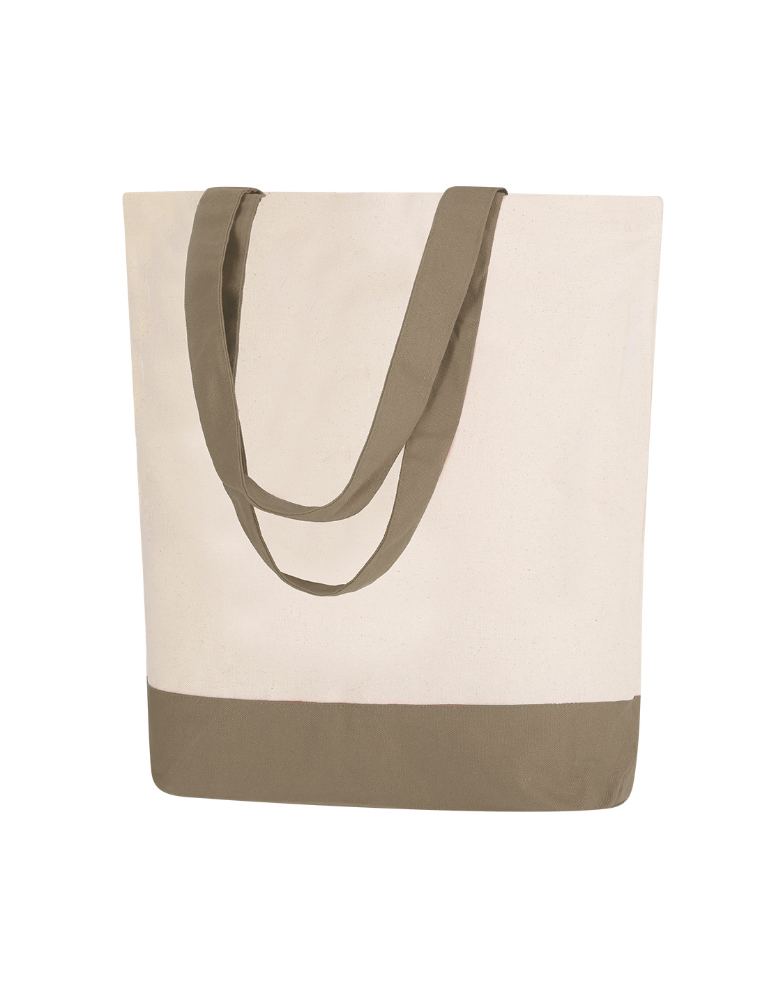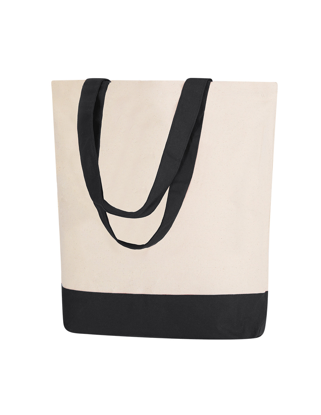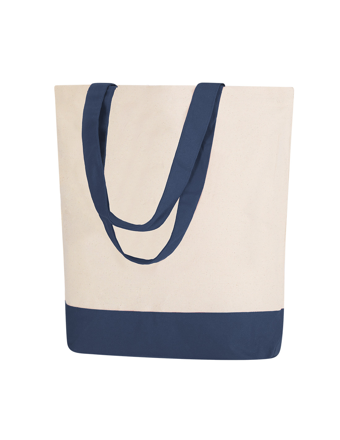 Bolsa en algodón de 280 g/m2 con diseño en base y asas del mismo color. Asas largas de 60x4 cm con refuerzo, de acabado cosido, con bolsillo interior. Resistencia de hasta 15 kg de peso.