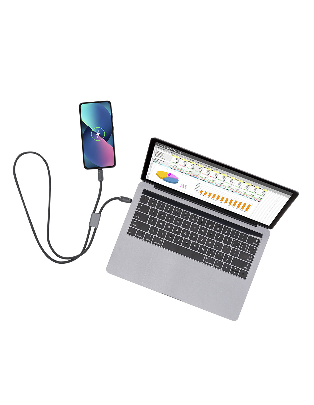 **Composición y materiales:** Pulsera cable de carga con función de transferencia de datos y soporte para móvil. Con entrada/salida Tipo C y capacidad de 60W , lo que permite una carga rápida. Funcionalidad y comodidad en un solo accesorio.