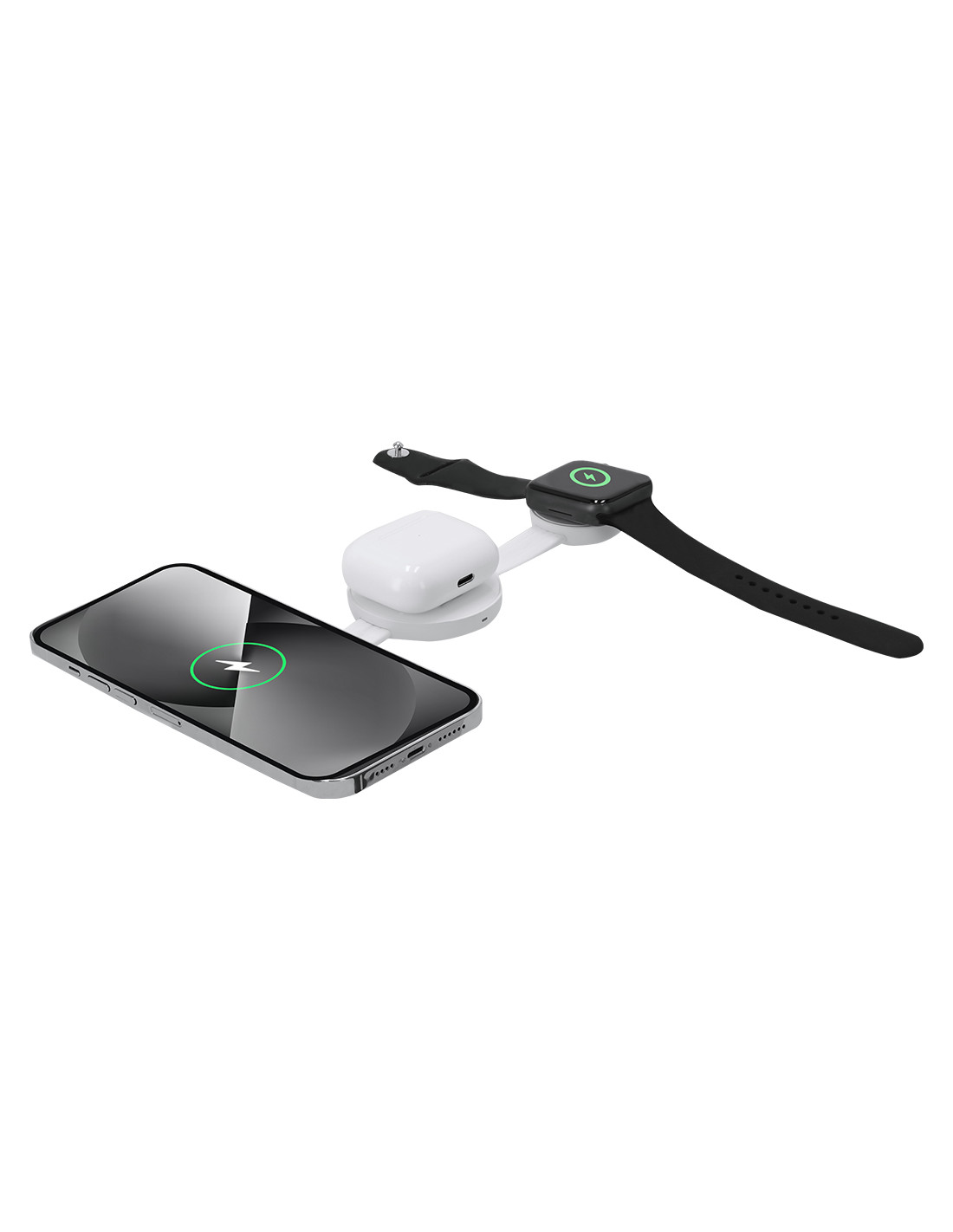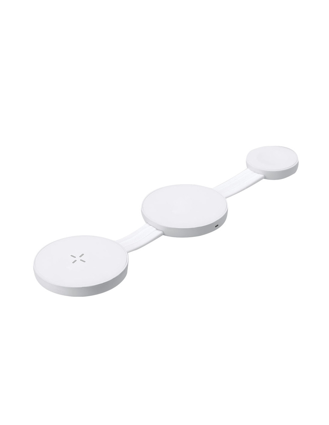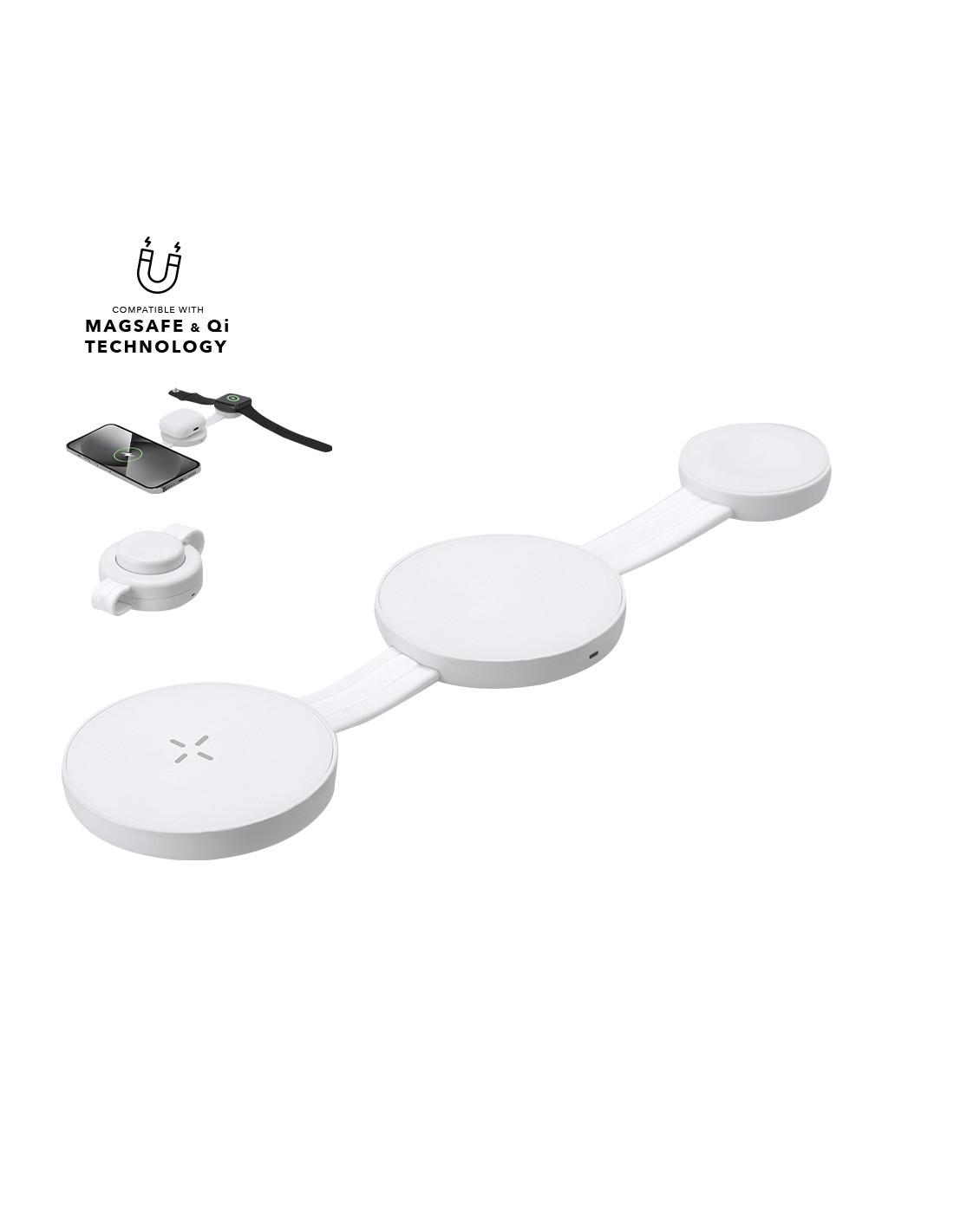 Cargador inalámbrico magnético 3 en 1 de 15W, fabricado en ABS. Diseñado para la carga simultánea del smartphone, auriculares y smartwatch y de tamaño ultra compacto. Un gadget todo en uno: plegable, portátil, muy versátil y de diseño funcional. Conexión por usb Tipo C -cable incluido-.