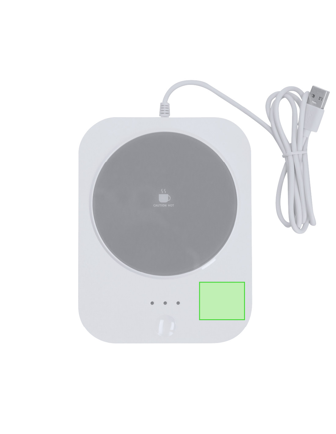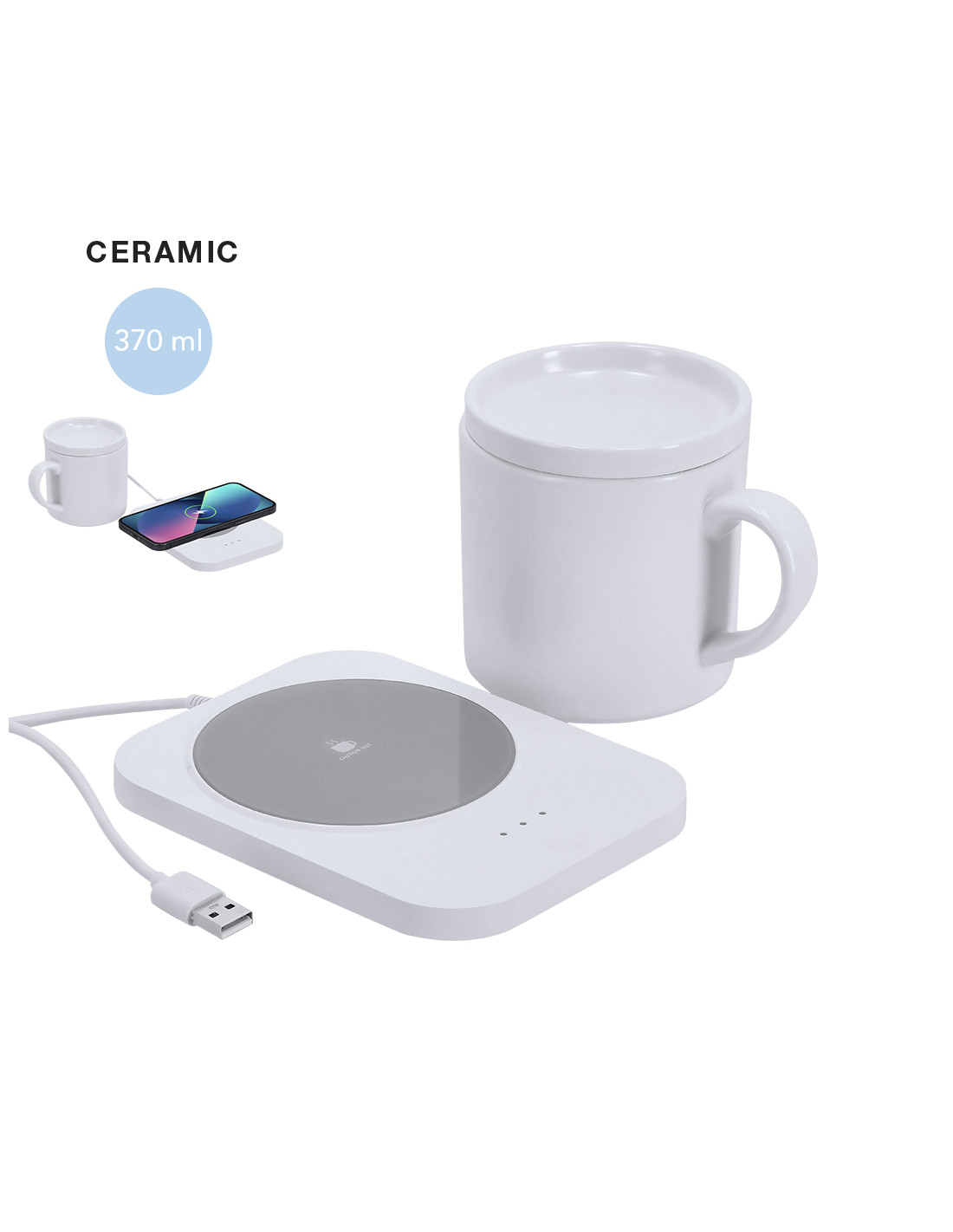 Calentador de tazas con cargador inalámbrico integrado de carga rápida 15W. Con taza de cerámica de 370 ml, especialmente diseñada para calentar y mantener la temperatura de la bebida, con tapa a juego. Incluye cable de carga Tipo USB.
