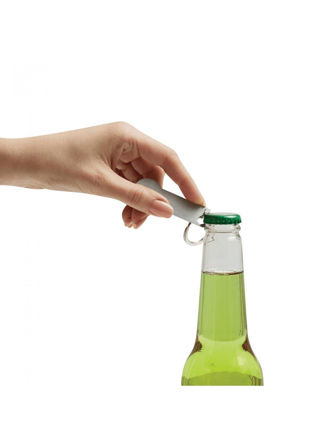 Llavero NO COIN tipo ficha de 1 euro con abrebotellas integrado. Práctico, compacto y útil para carros de compra.