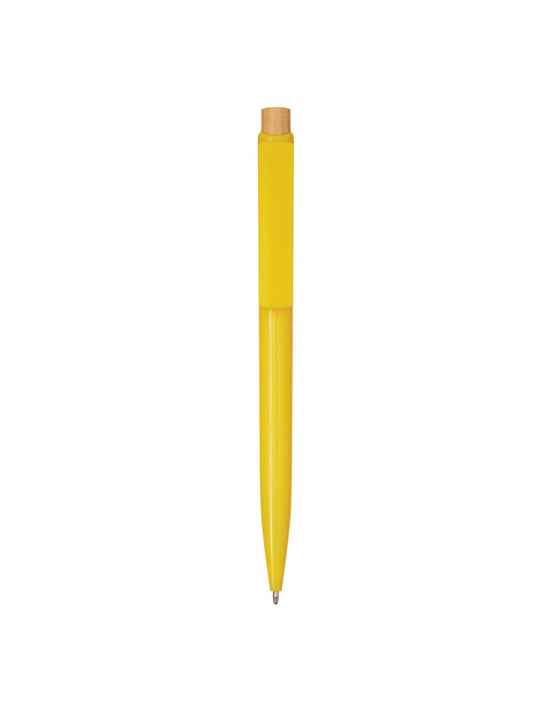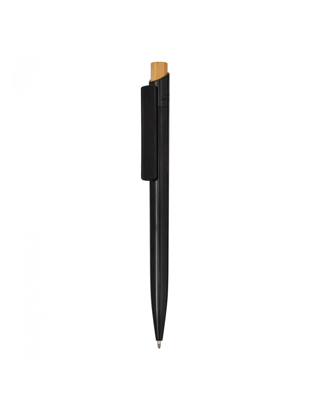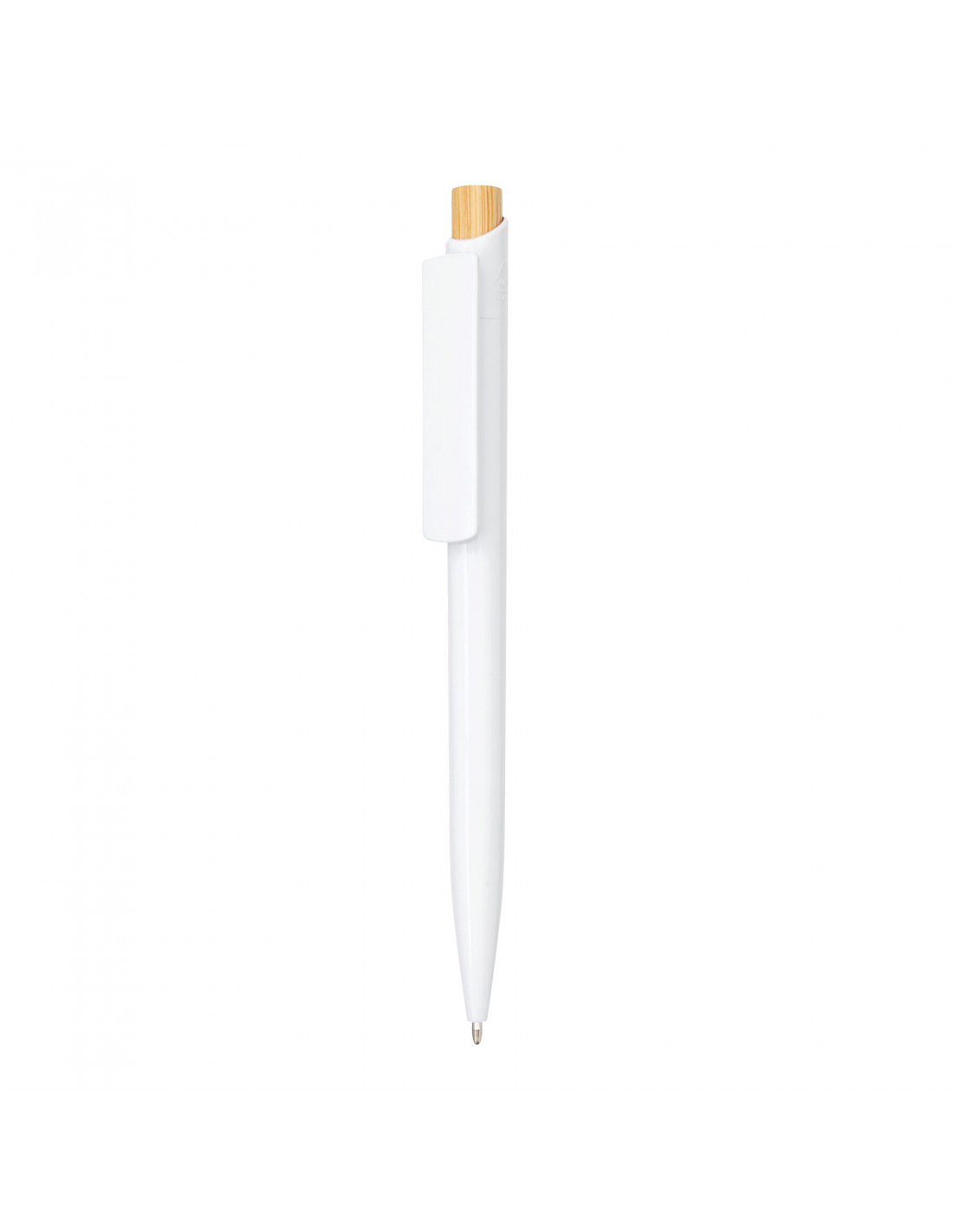 Bolígrafo BAPU con cuerpo de plástico reciclado y pulsador de bambú, mecanismo de pulsación y tinta azul. Ideal como regalo promocional sostenible.