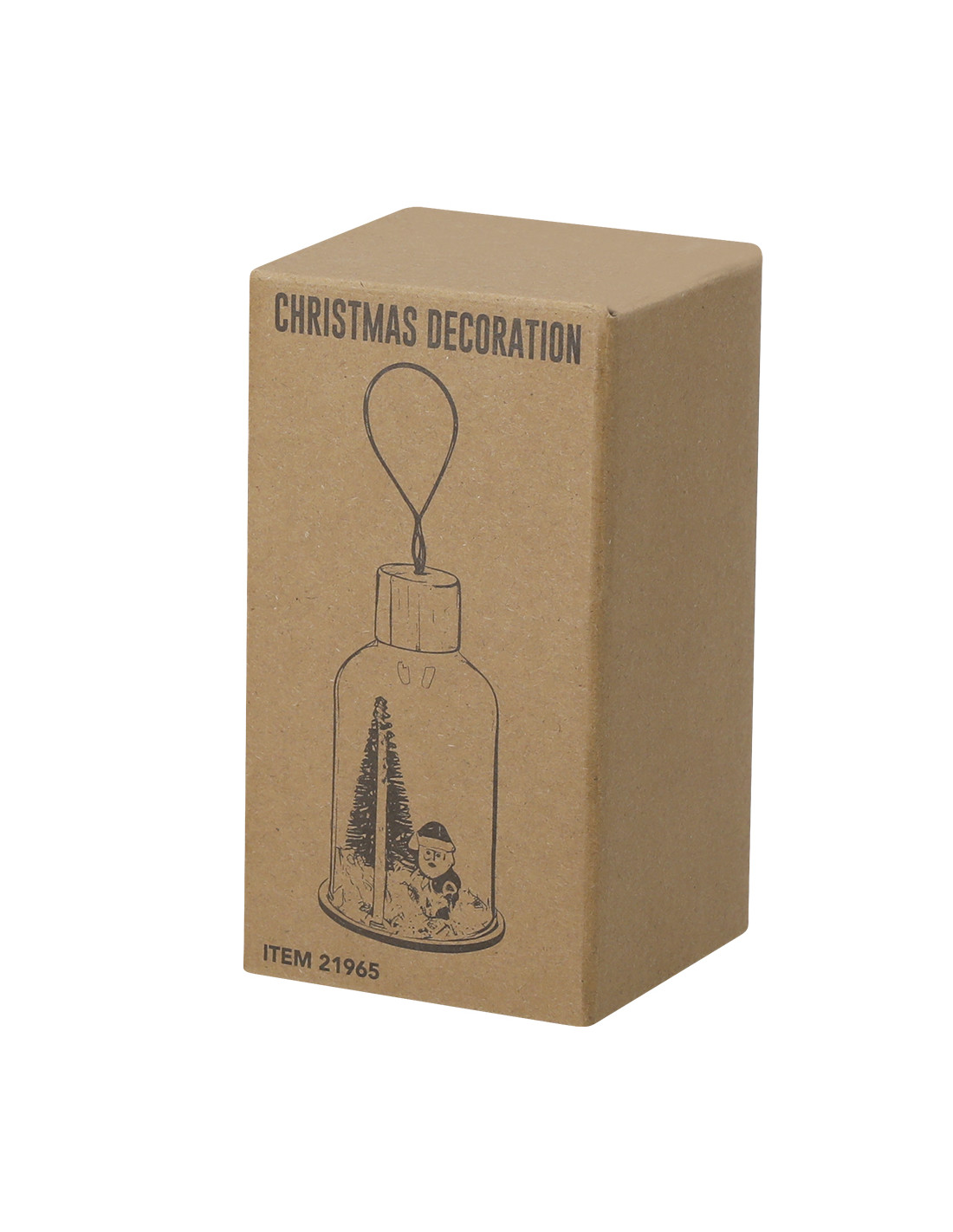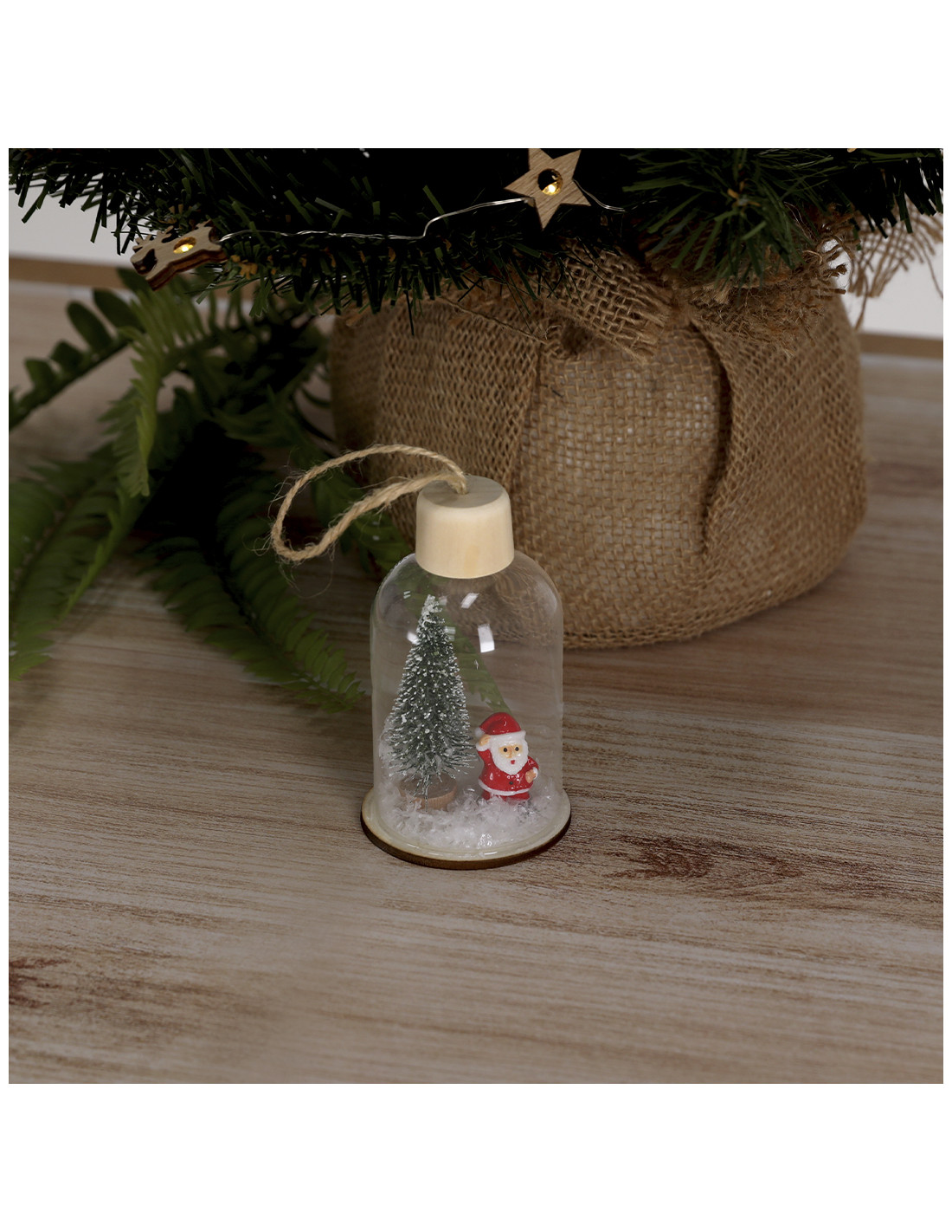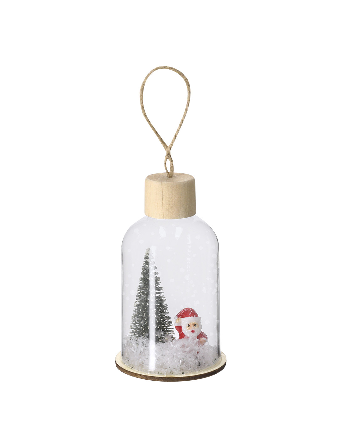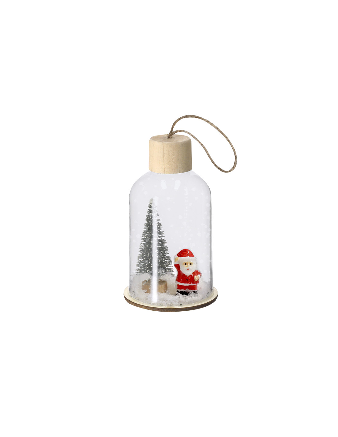 **Composición y materiales:** Adorno navideño fabricado en resistente vidrio, con base de madera natural. Incluye accesorio para colgar en yute natural. Dispone de iluminación interior con 1 LED en tono blanco. Alimentación por 3 pilas de botón, incluidas, con botón ON/OFF en la base.