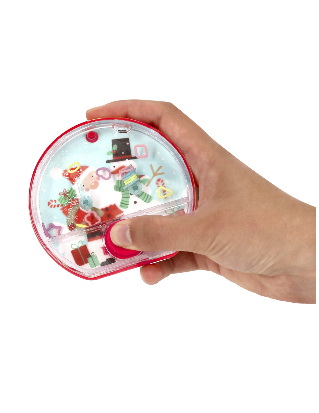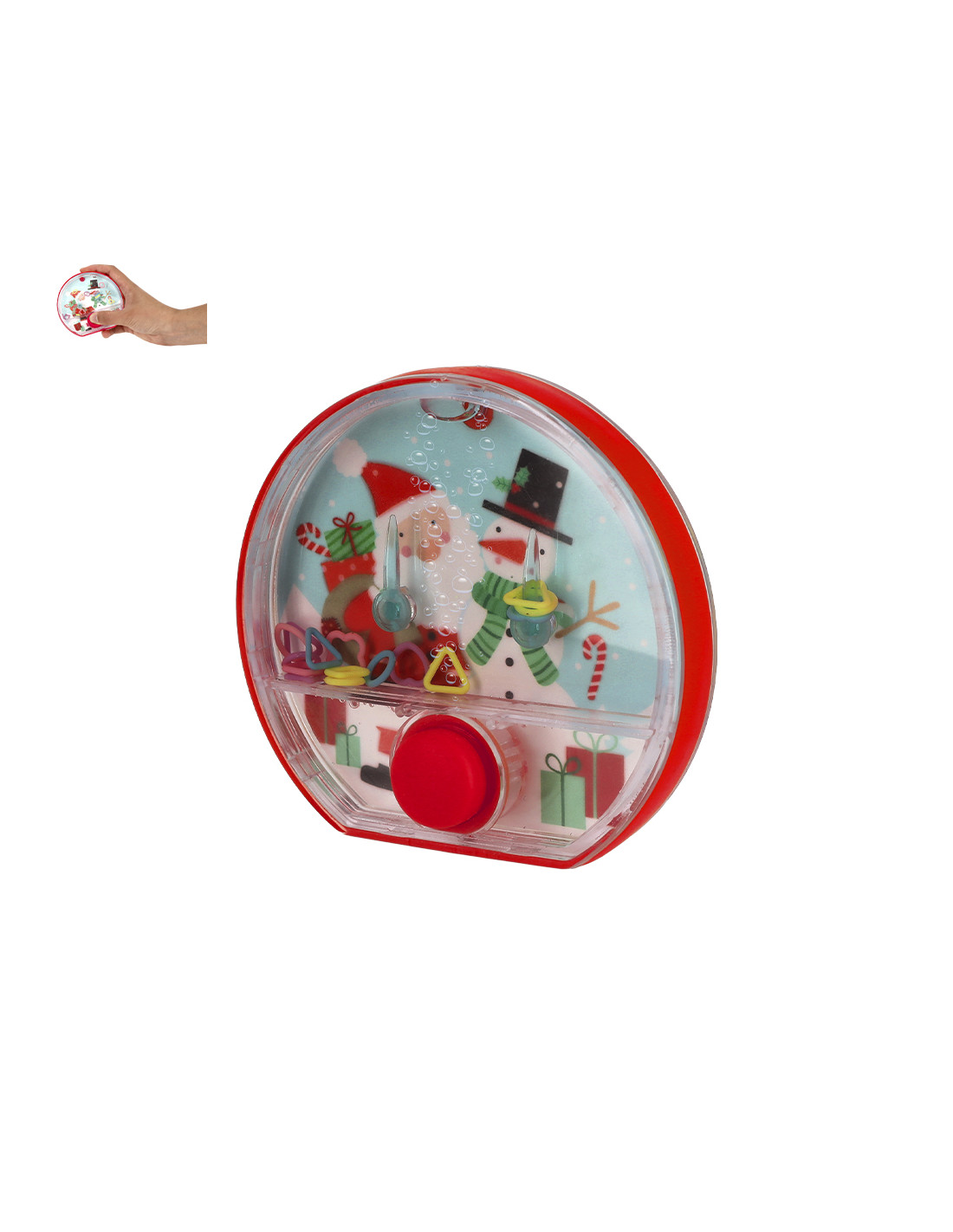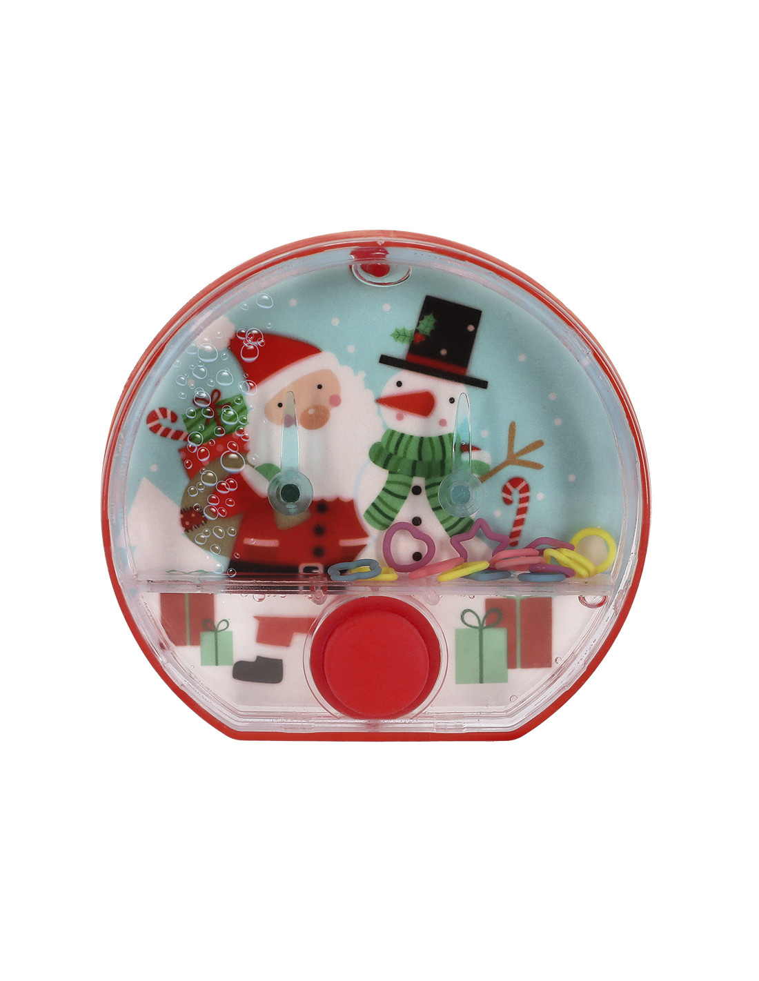 **Composición y materiales:** Divertida consola de agua con diseño navideño, fabricada en resistente PS y botón de TPE en color rojo a juego. En su interior, contiene aros de ABS en formas de corazón, triángulo, cuadrado y flor, en alegres colores morado, rosa, azul claro y amarillo. Un clásico pasatiempo, ideal para ejercitar la destreza y la coordinación.