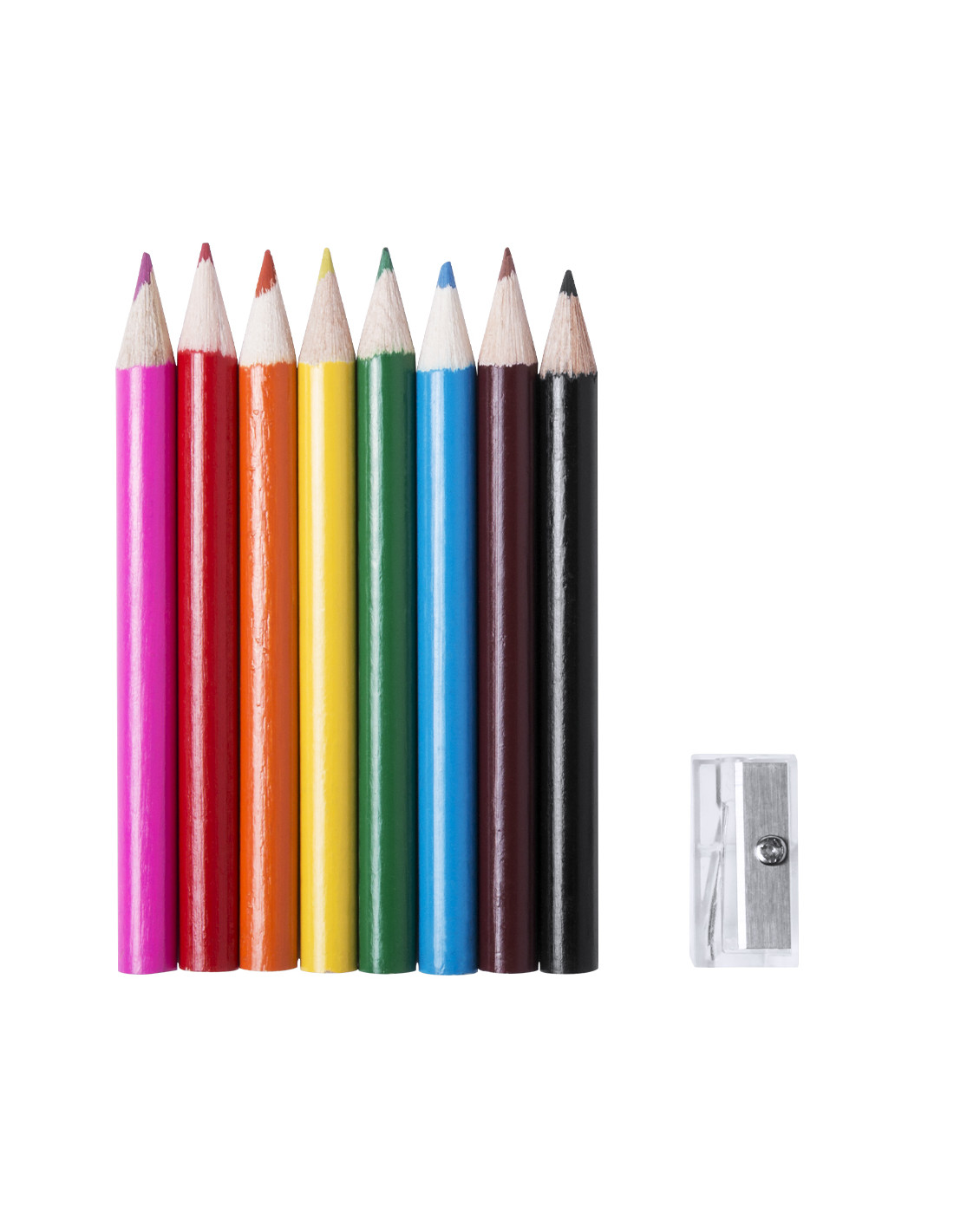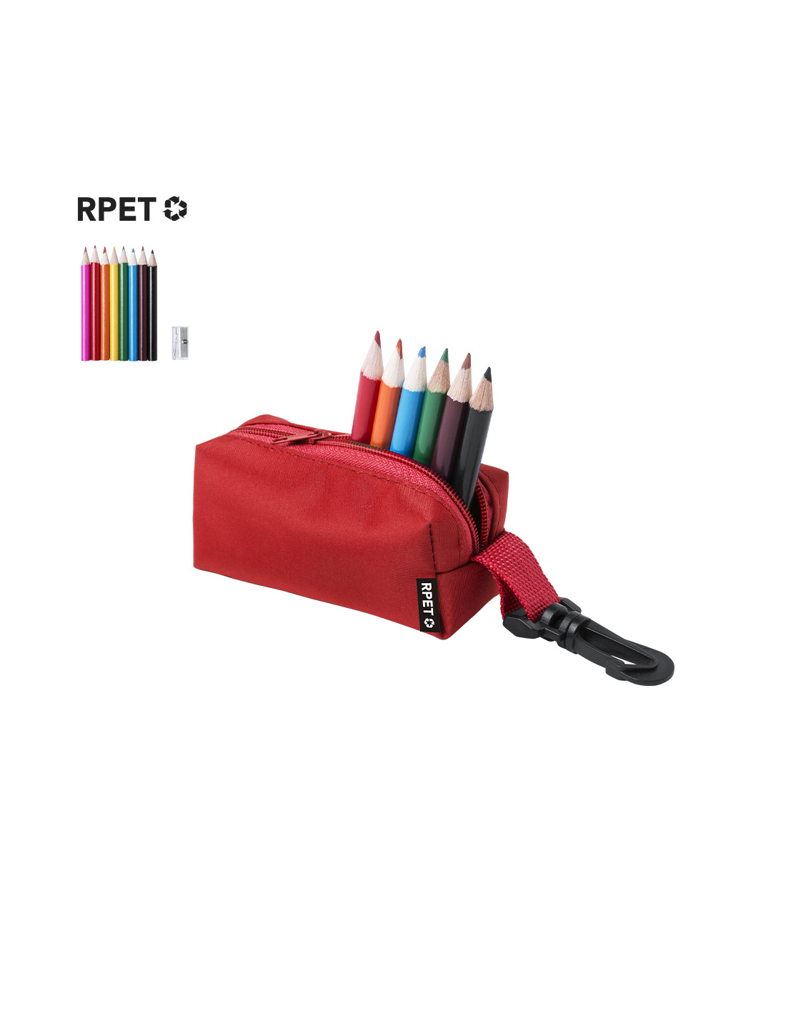 Estuche fabricado en poliéster 420D RPET con cierre de cremallera y práctico enganche en mosquetón. Distintivo RPET en etiqueta. Incluye:- 8 lápices de madera en diferentes colores (negro, rojo, azul claro, amarillo, verde, naranja, rosa y marrón)- Sacapuntas transparenteEl material RPET se elabora a partir de plástico reciclado, para así fomentar la reutilización de residuos plásticos y ayudar a la sostenibilidad del planeta.