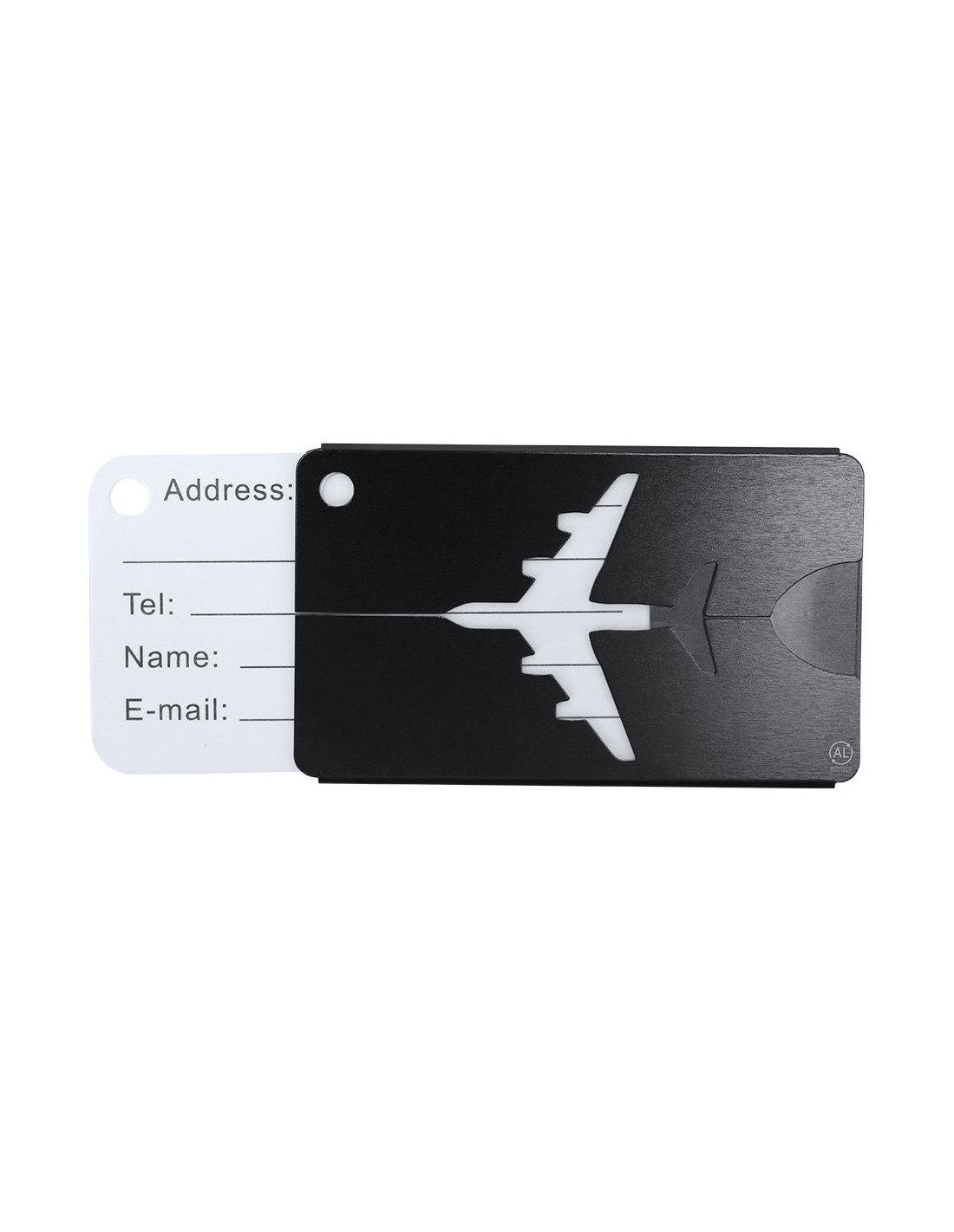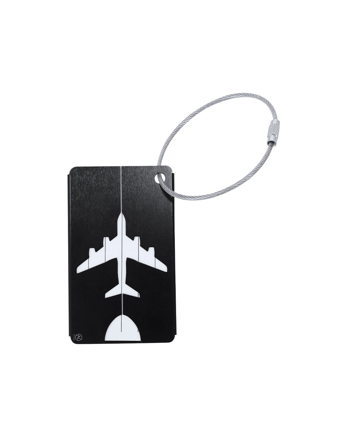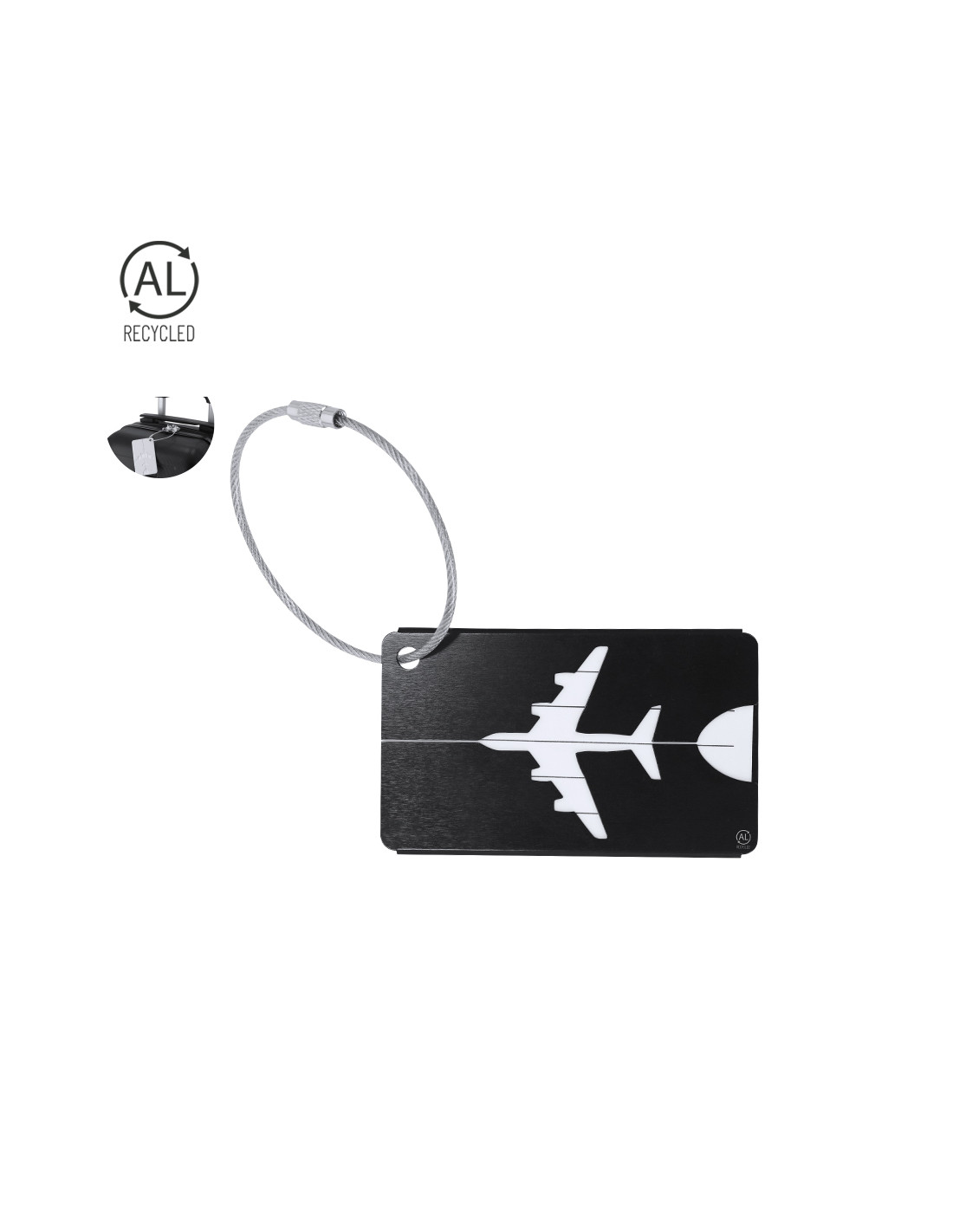 Original identificador de maletas con diseño de avión en resistente Aluminio Reciclado. Con cinta de acople en acero inoxidable con sistema de cierra en rosca y tarjeta de identificación en inglés con los siguientes campos impresos; Addres, Tel, Name, E-mail. Logo AL Recycled grabado por láser.
