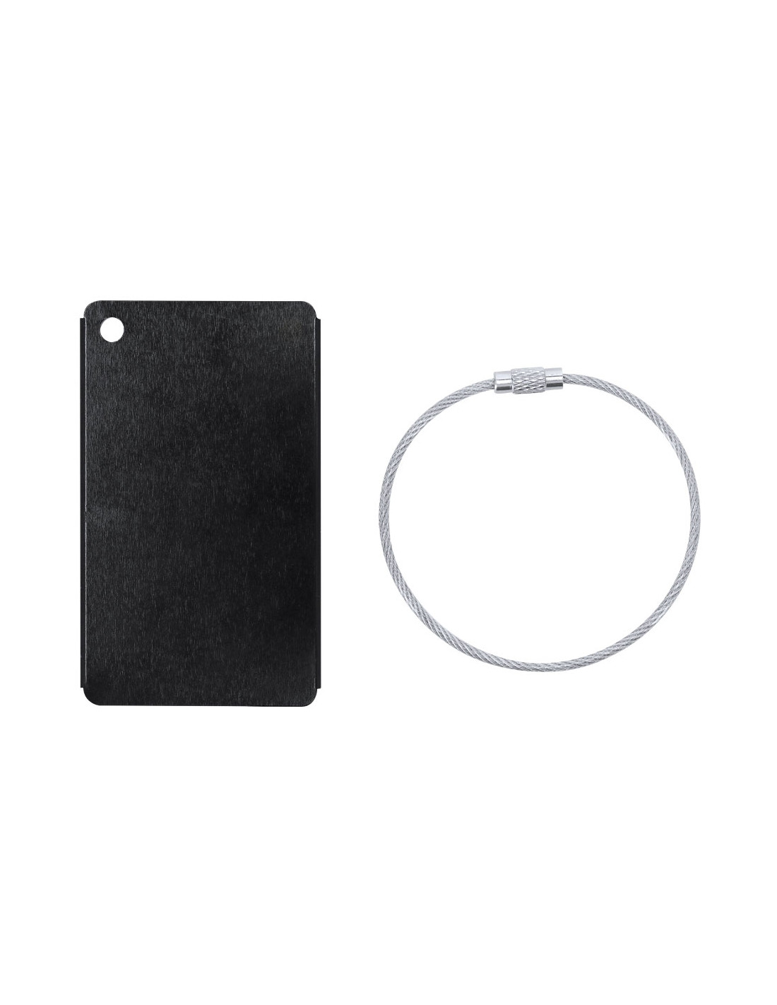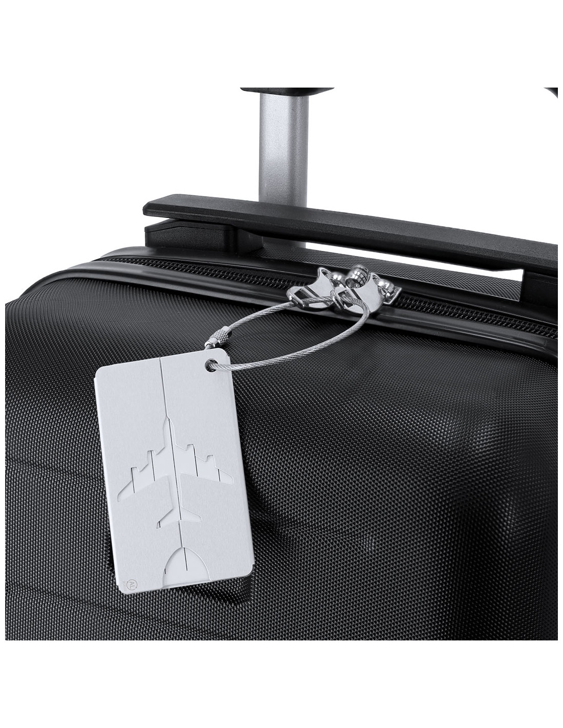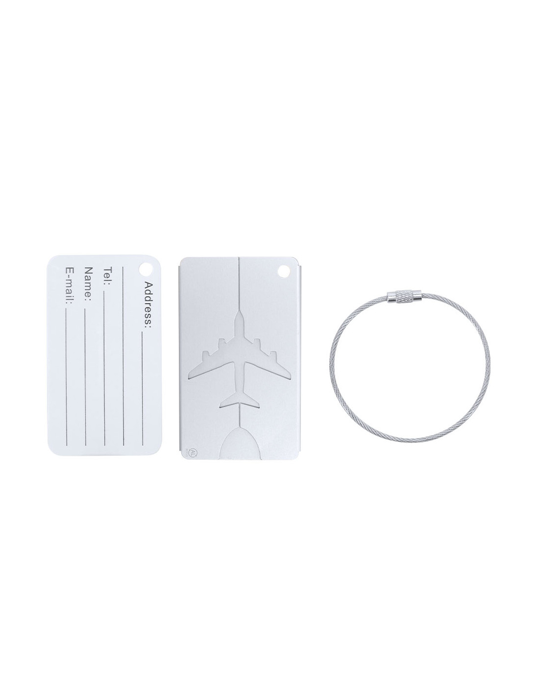 Original identificador de maletas con diseño de avión en resistente Aluminio Reciclado. Con cinta de acople en acero inoxidable con sistema de cierra en rosca y tarjeta de identificación en inglés con los siguientes campos impresos; Addres, Tel, Name, E-mail. Logo AL Recycled grabado por láser.