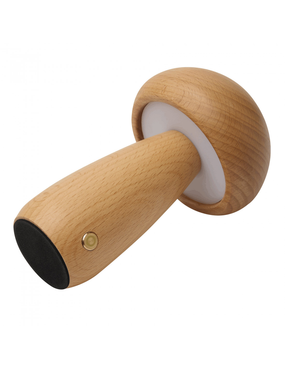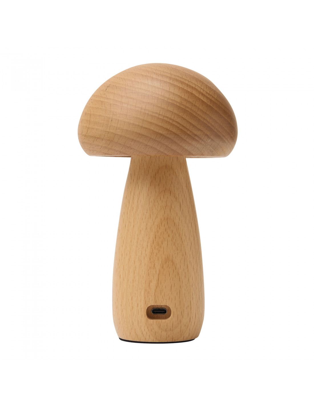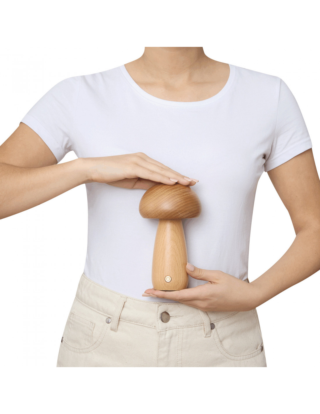 Lámpara de mesa LED, MOSSLIGHT: fabricada en madera, con forma de hongo, interruptor de encendido/apagado y regulador de intensidad, potente batería de litio de 900 mAh, incluye cable de carga USB con conector USB tipo C (aprox. 1 m de longitud), base antideslizante, en caja.