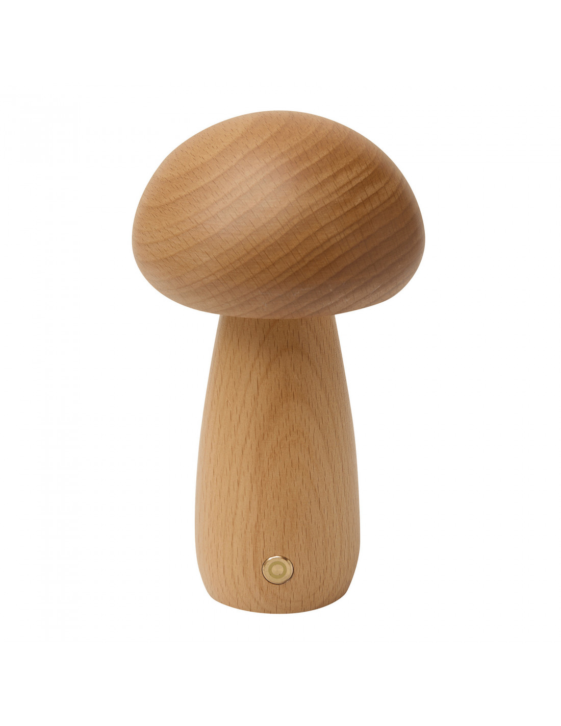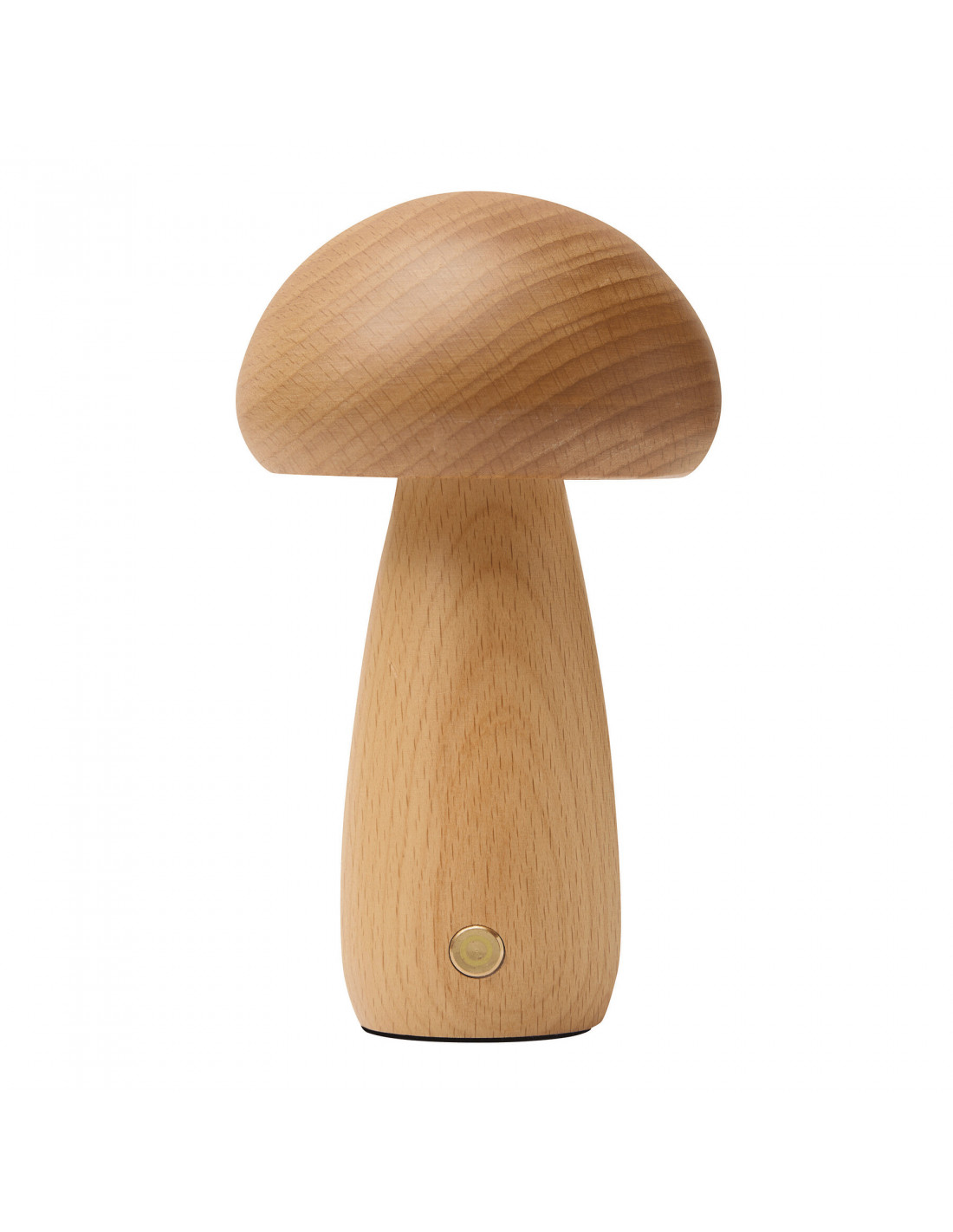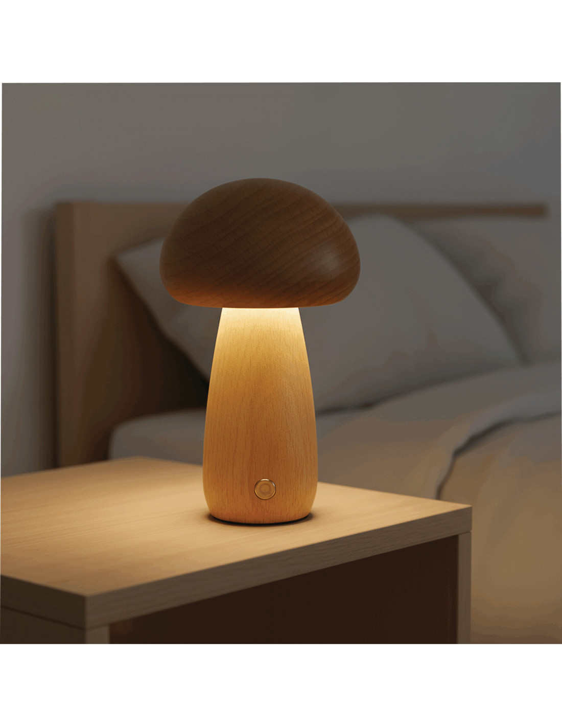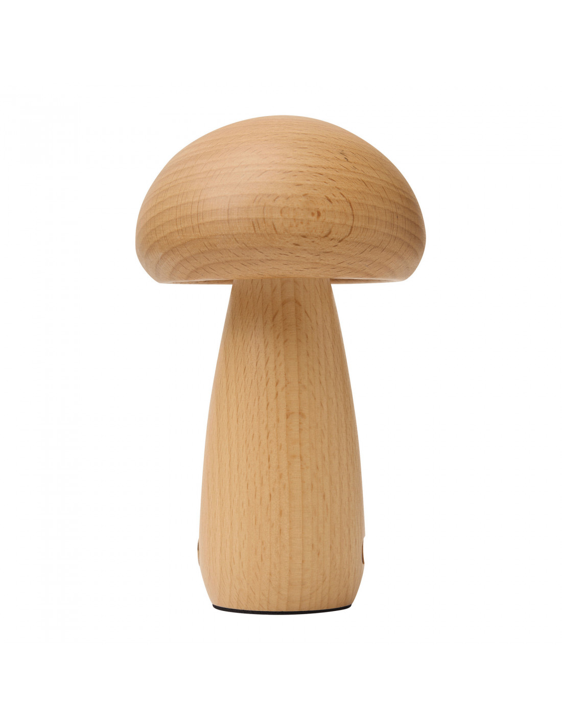Lámpara de mesa LED, MOSSLIGHT: fabricada en madera, con forma de hongo, interruptor de encendido/apagado y regulador de intensidad, potente batería de litio de 900 mAh, incluye cable de carga USB con conector USB tipo C (aprox. 1 m de longitud), base antideslizante, en caja.