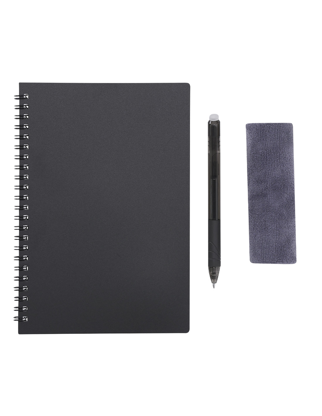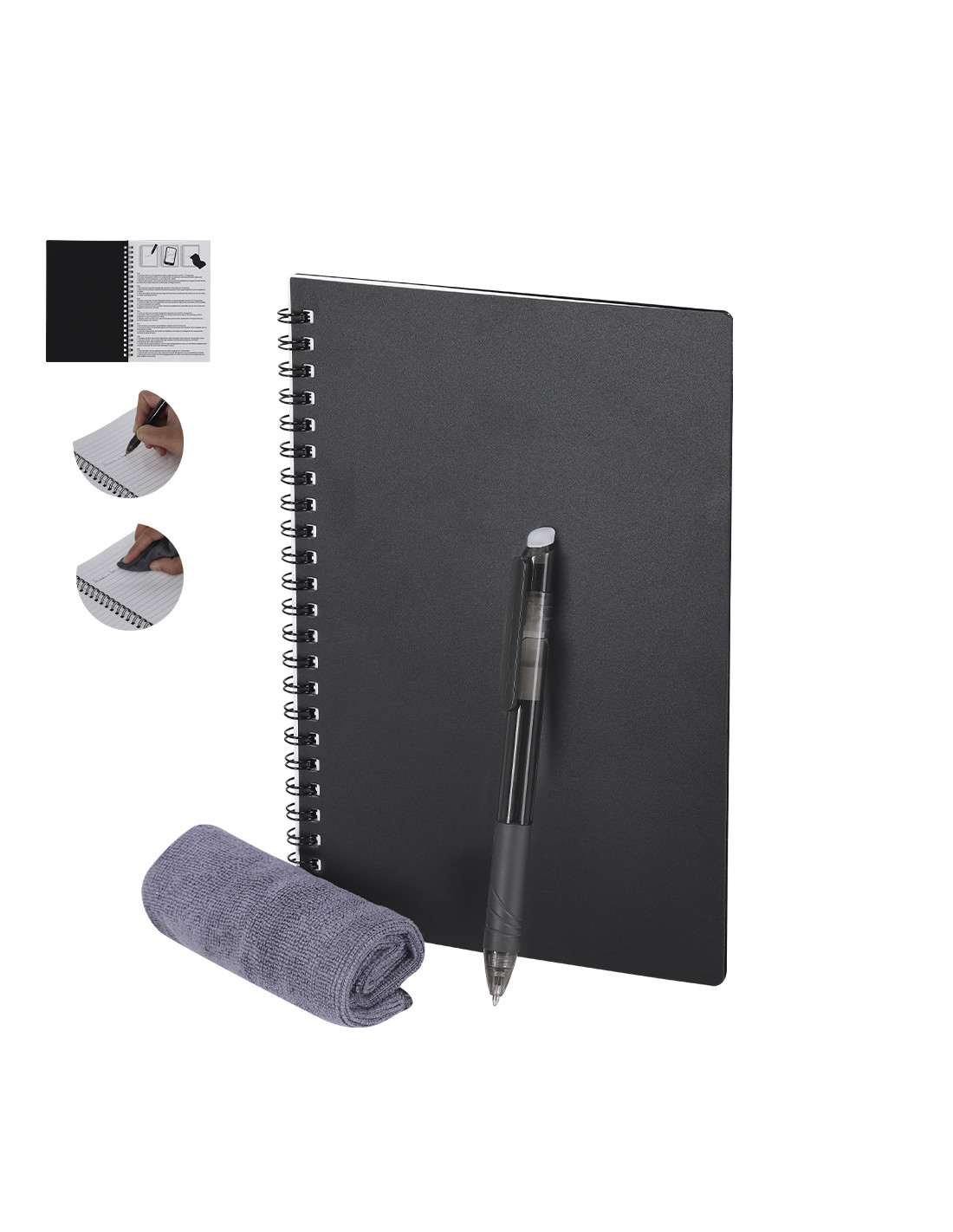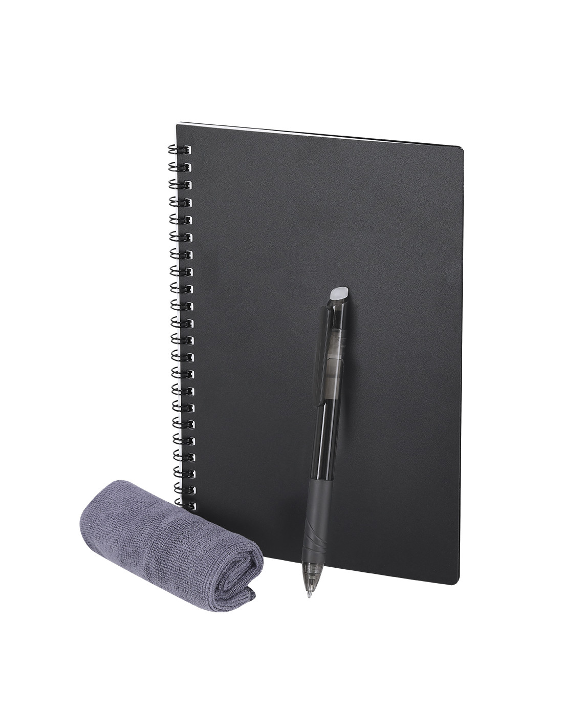 Libreta y bolígrafo borrable con paño limpiador incluido con el que disfrutar de una escritura fluida y dejar margen para el error. Libreta en PP de 18 páginas con anillas metálicas. Bolígrafo de cartucho jumbo y en tinta negra. Permite escribir, borrar y reescribir sin dañar los documentos. Fabricado en resistente ABS de acabado transparente.