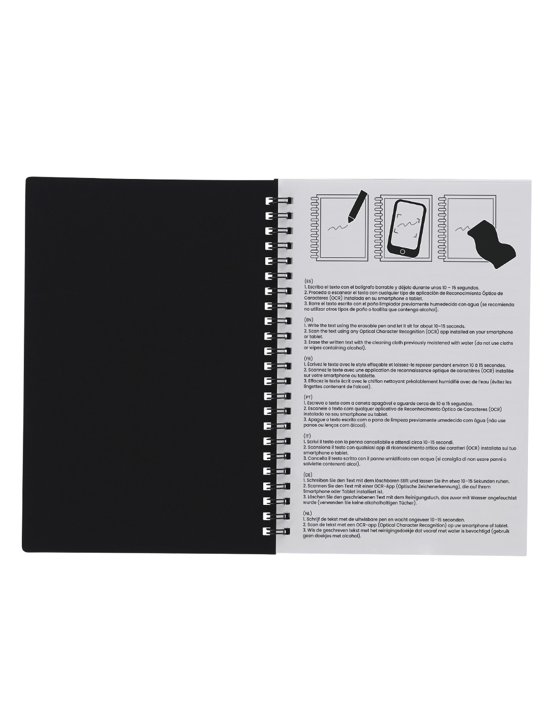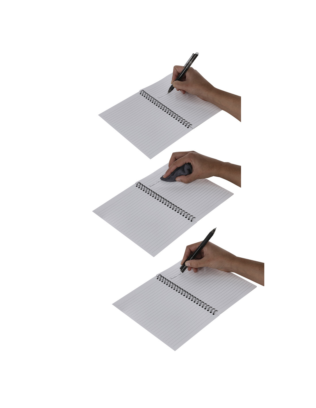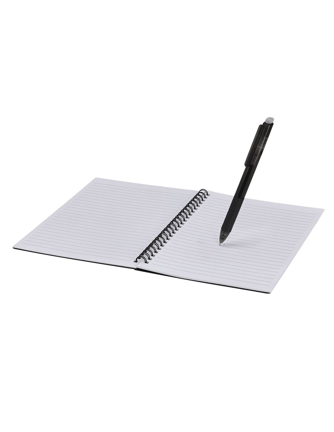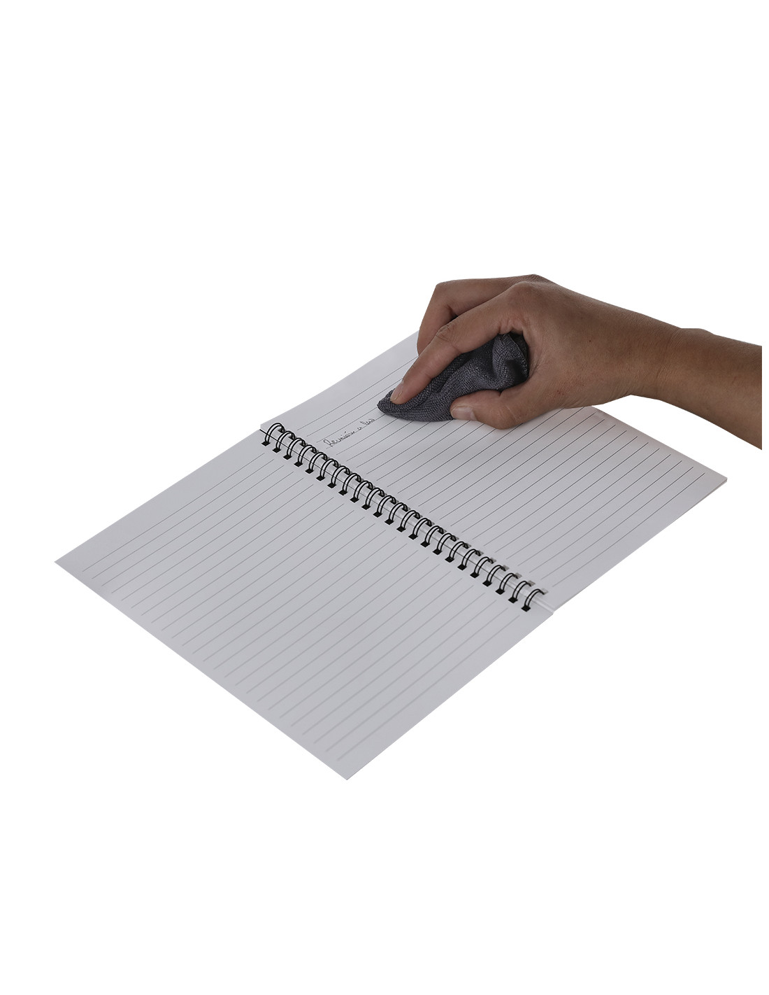 Libreta y bolígrafo borrable con paño limpiador incluido con el que disfrutar de una escritura fluida y dejar margen para el error. Libreta en PP de 18 páginas con anillas metálicas. Bolígrafo de cartucho jumbo y en tinta negra. Permite escribir, borrar y reescribir sin dañar los documentos. Fabricado en resistente ABS de acabado transparente.