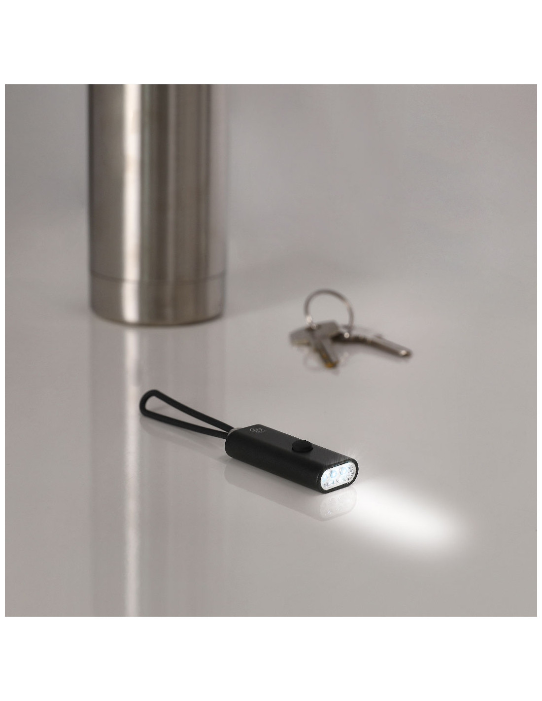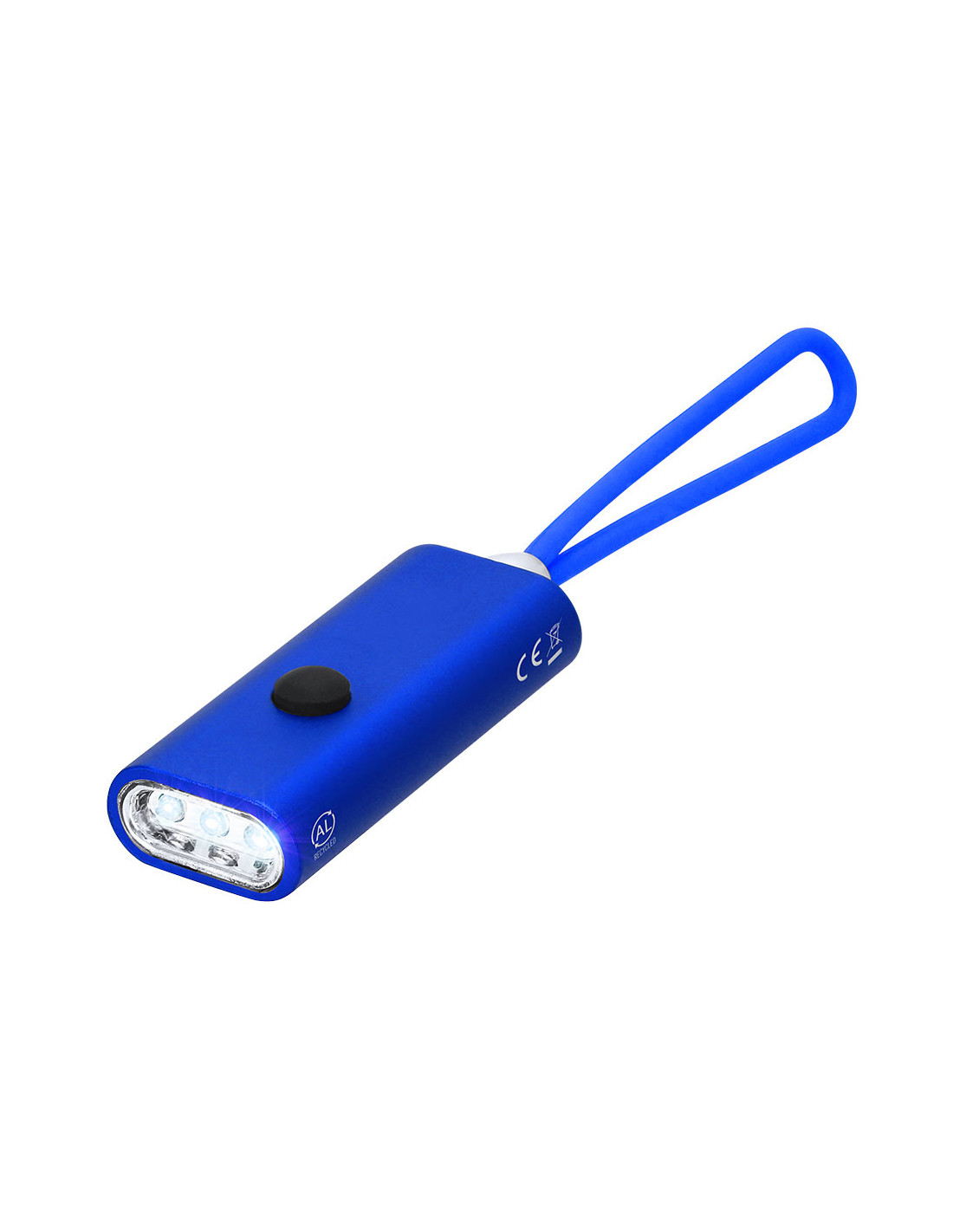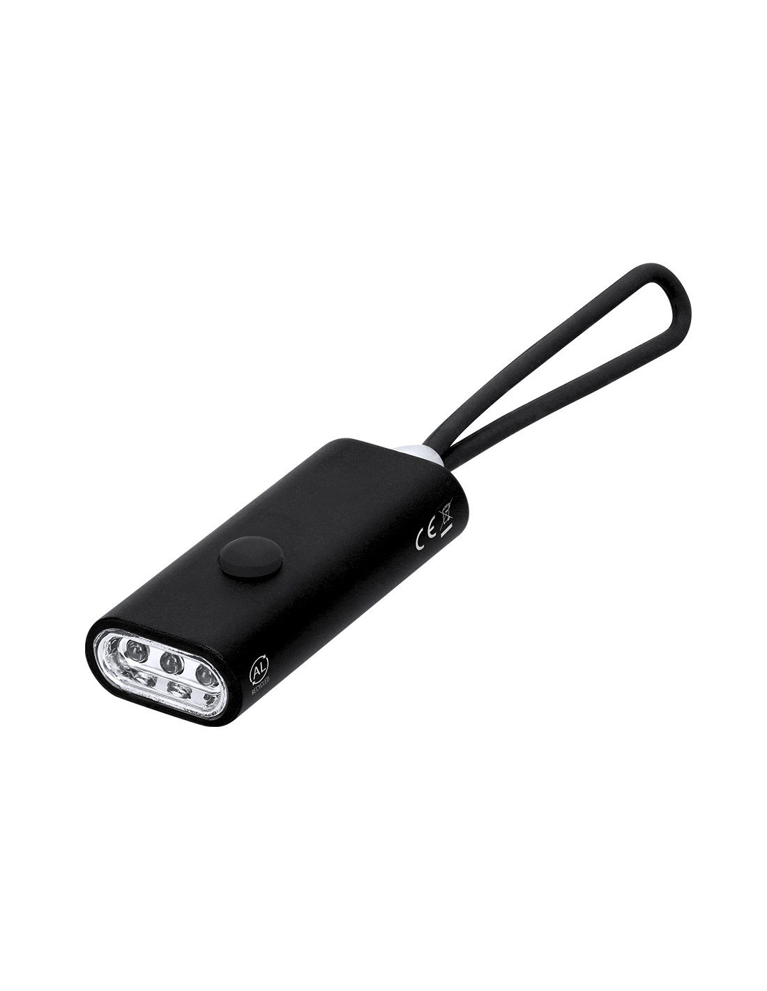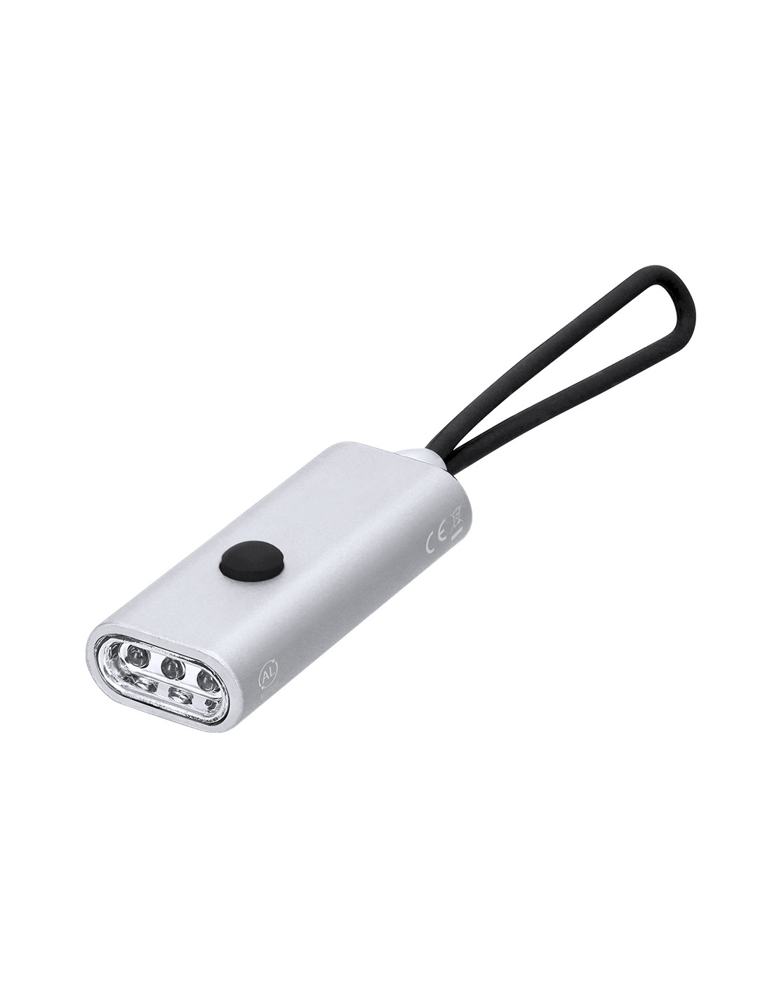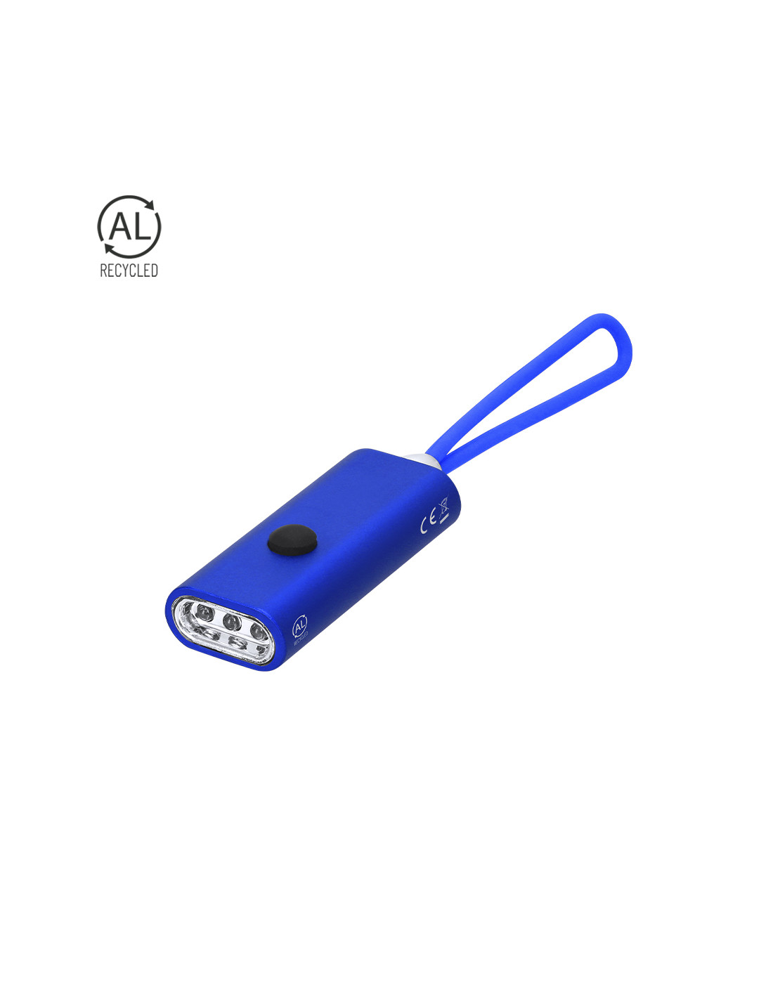 Linterna fabricada en Aluminio Reciclado. Con 3 LEDs alimentado con pilas de botón (incluidas) con botón on/off en la parte superior. Incluye asa de silicona para fácil transporte. Presenta distintivo logo de Aluminio Reciclado en el lateral.