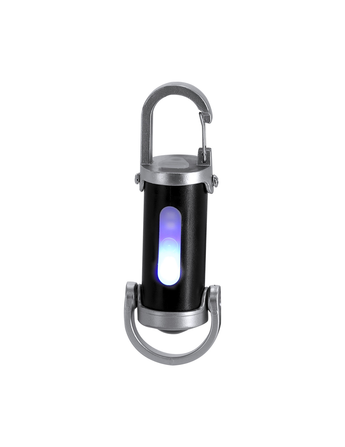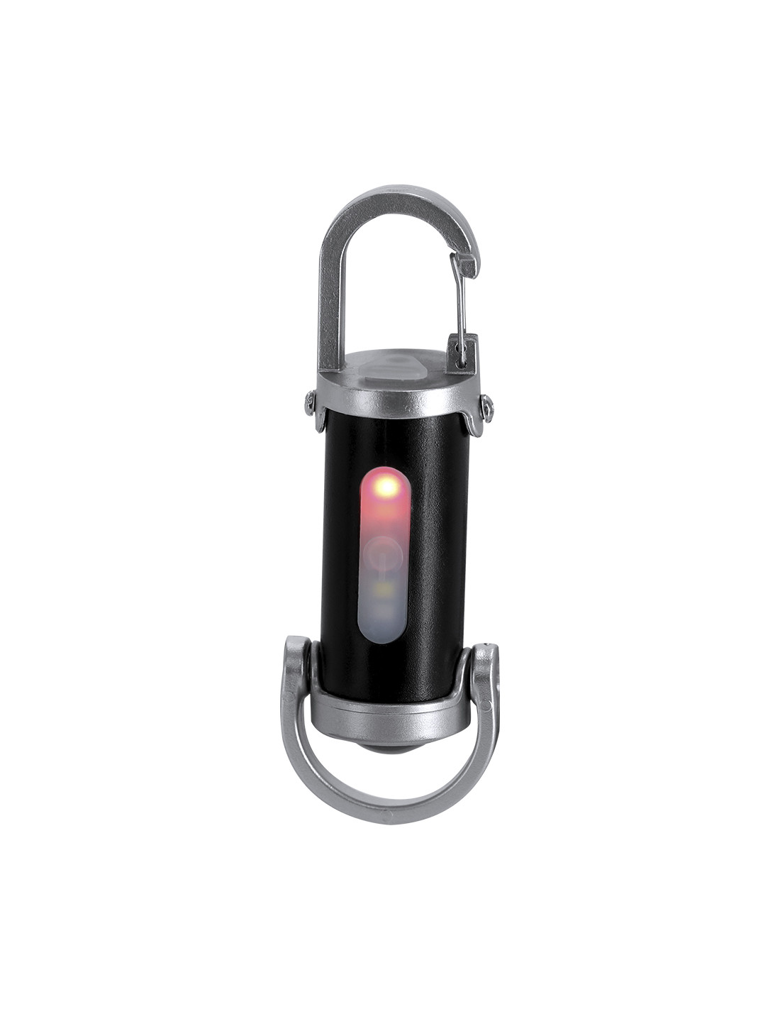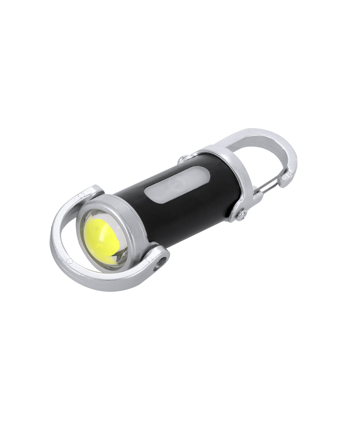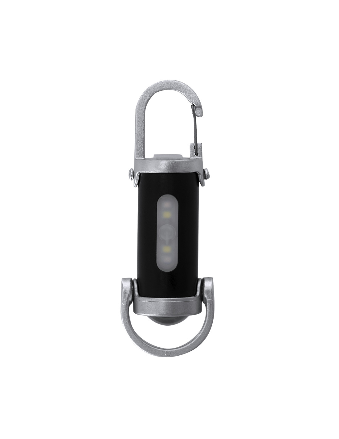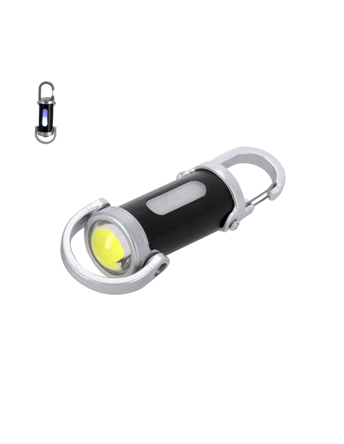 Linterna fabricada en ABS con mosquetón de transporte. 4 LEDs, sistema de encendido de botón y 8 luces COB. 7 posiciones de luz fija e intermitente. Práctica asa de transporte en parte inferior. Batería recargable de 400mAh, con cable de carga Tipo C incluido de 5V.