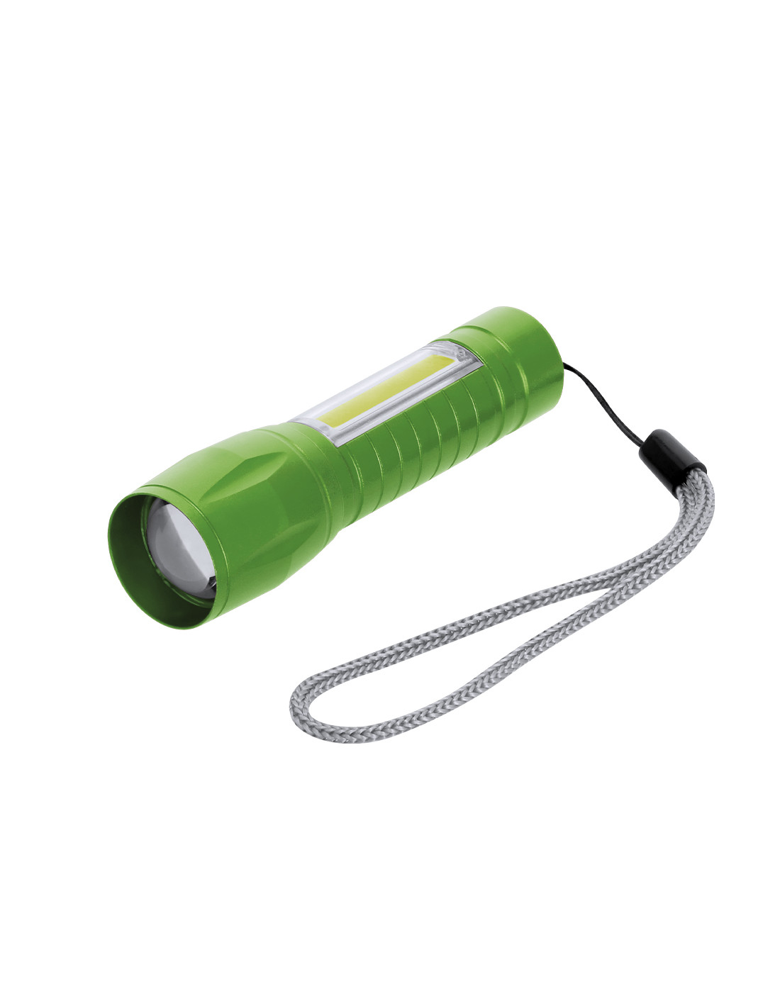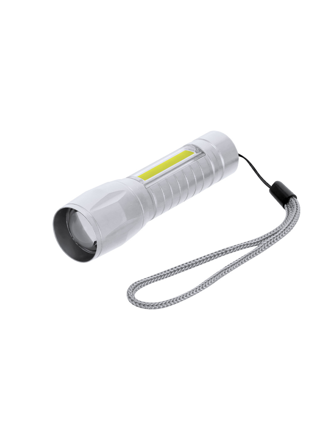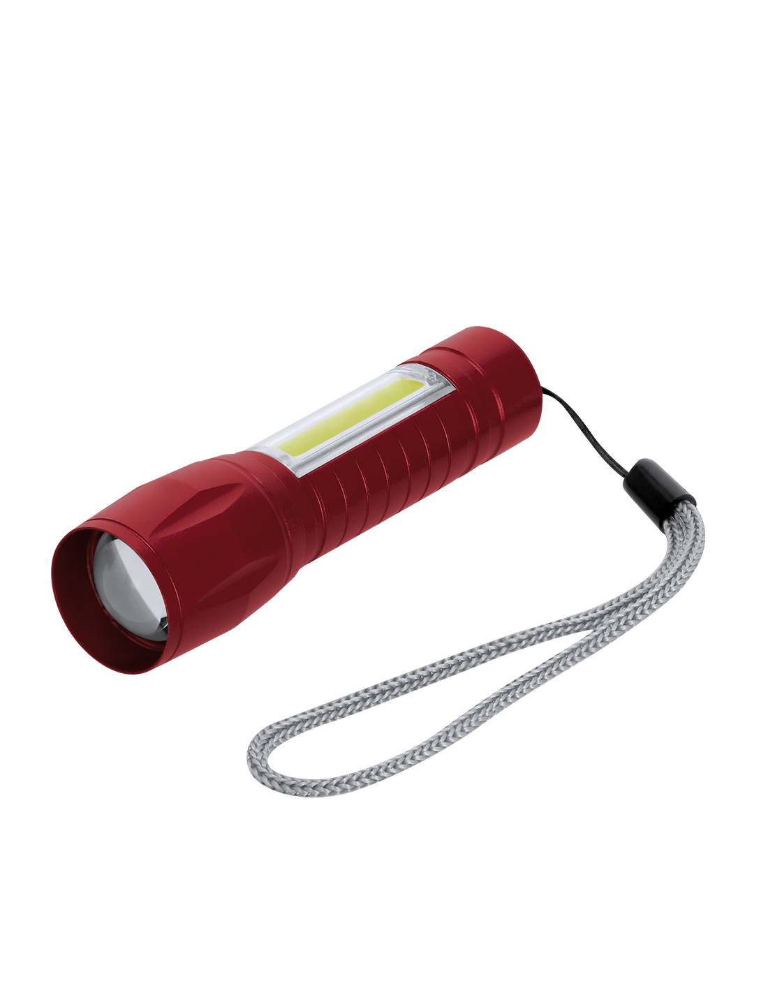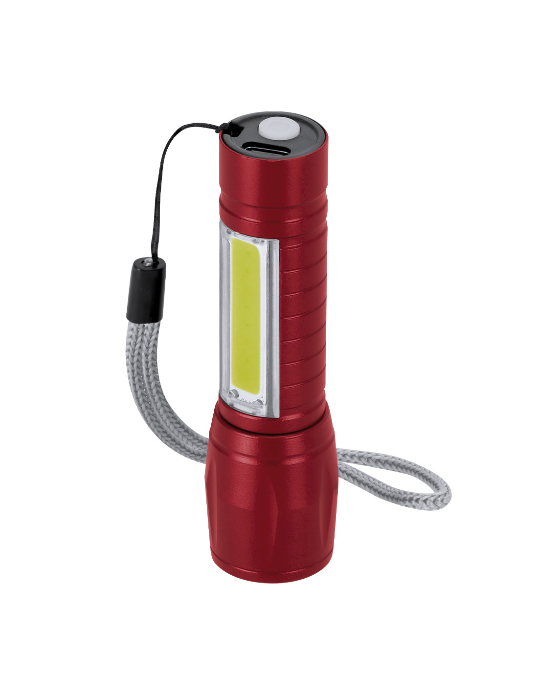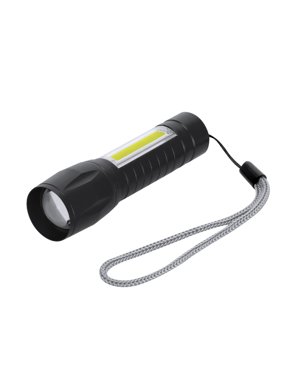 Potente linterna con batería recargable, fabricada en aluminio de acabado en mate. Luz frontal con 8 LEDs y zoom ajustable. Además, cuenta con 10 luces COB en el mango y tres modos de iluminación (fija e intermitente y lateral), incluye cinta de trasporte. Se alimenta mediante una batería recargable de 400 mAh, incluido cable tipo C.