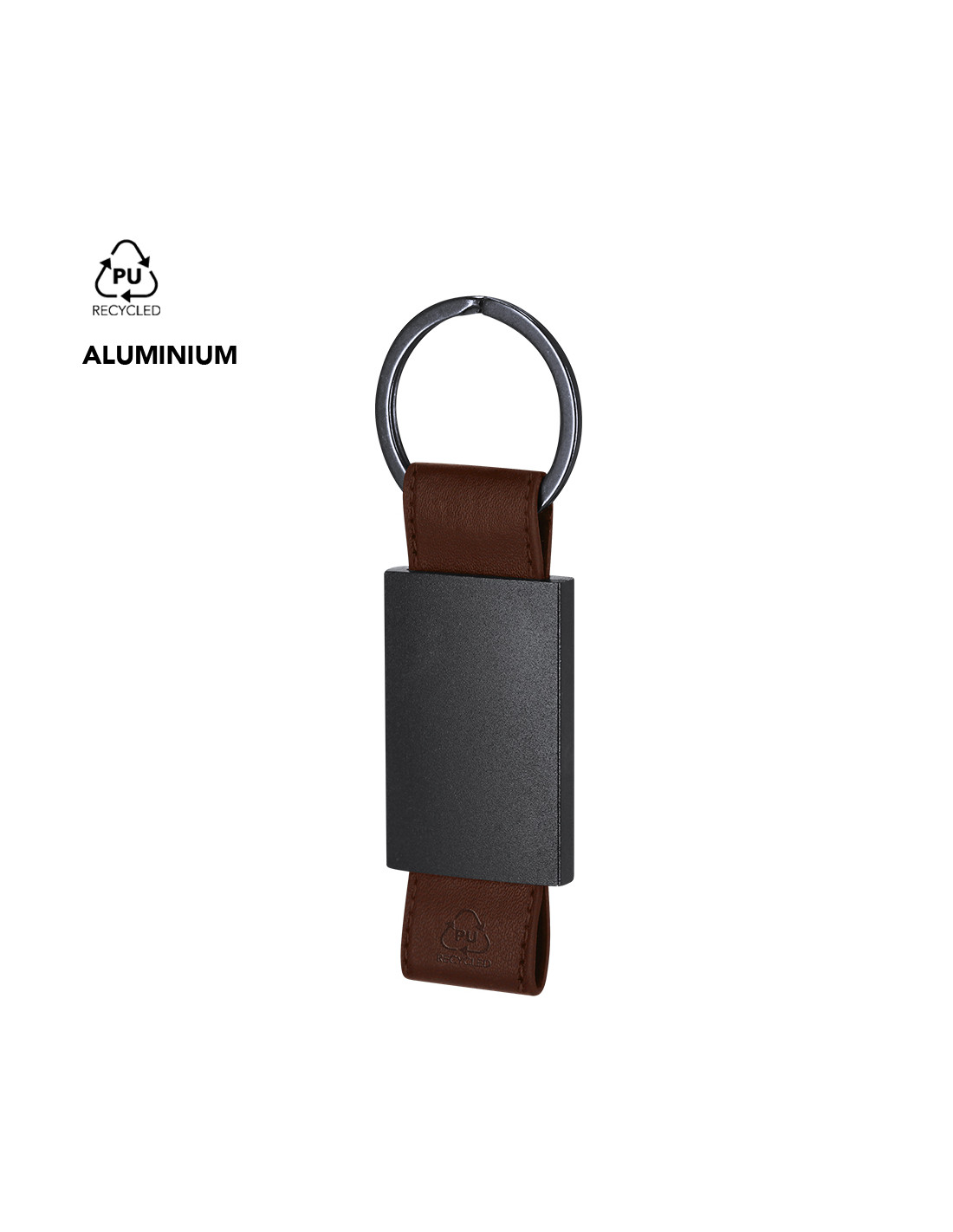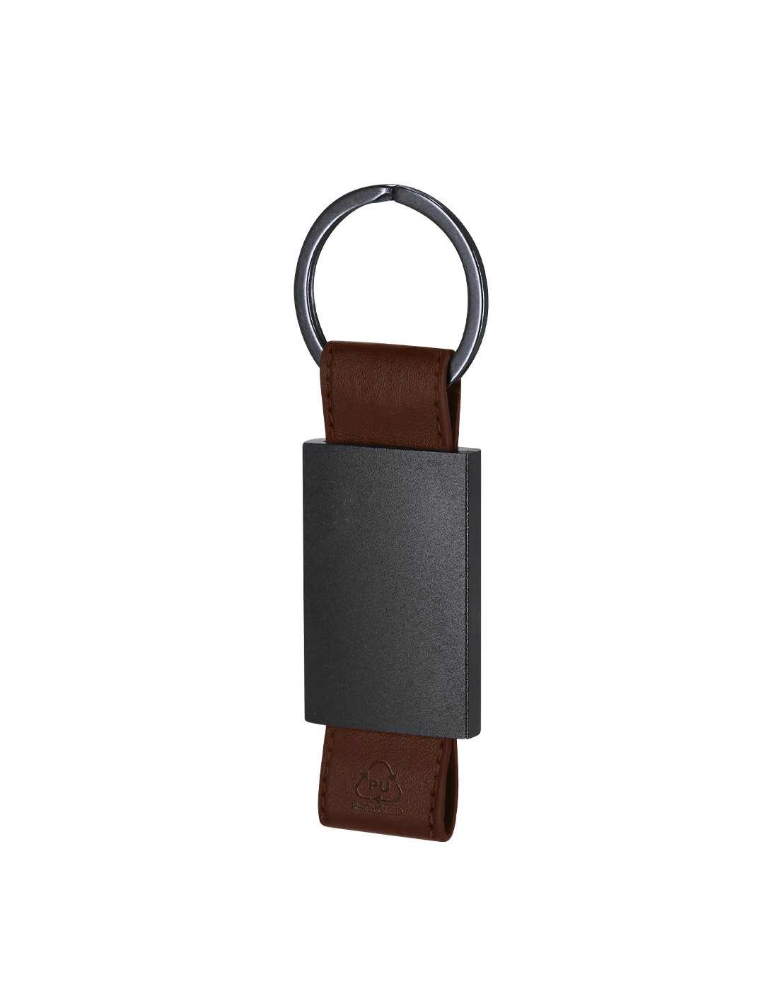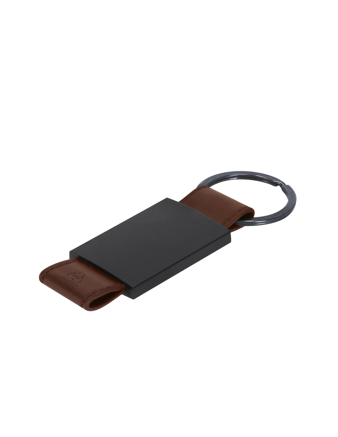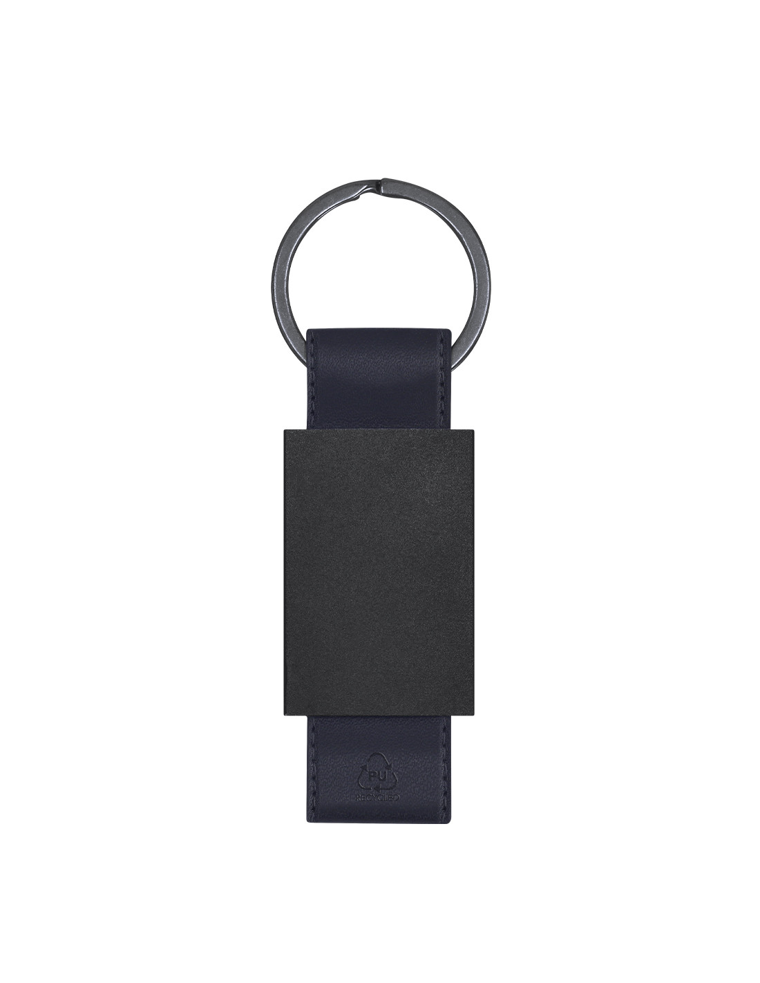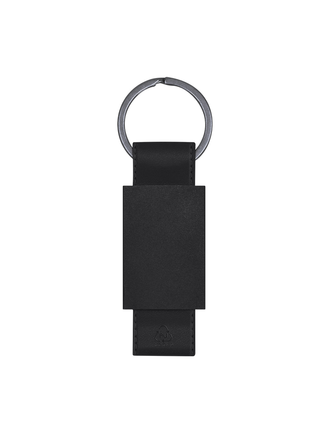 Llavero de divertido diseño con cinta de PU reciclado. Con cuerpo negro en acabado mate.